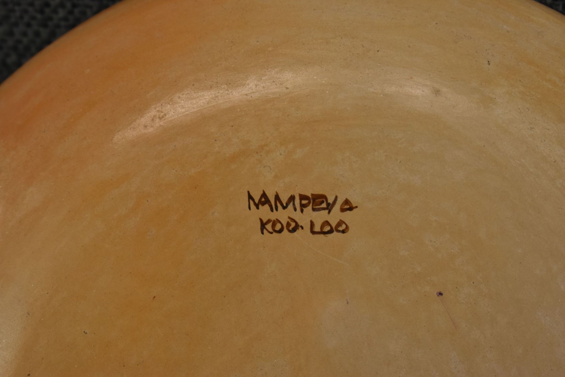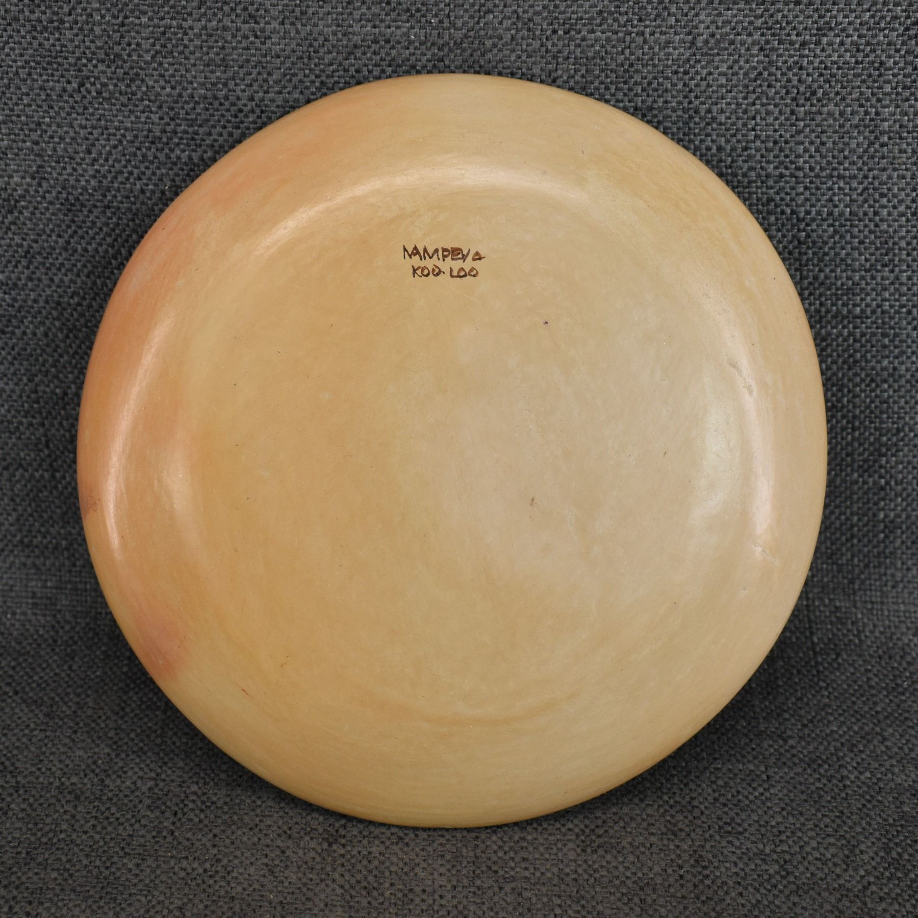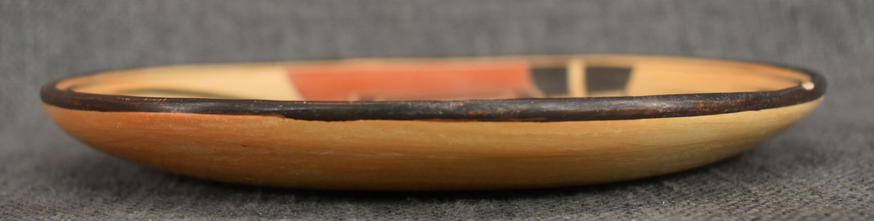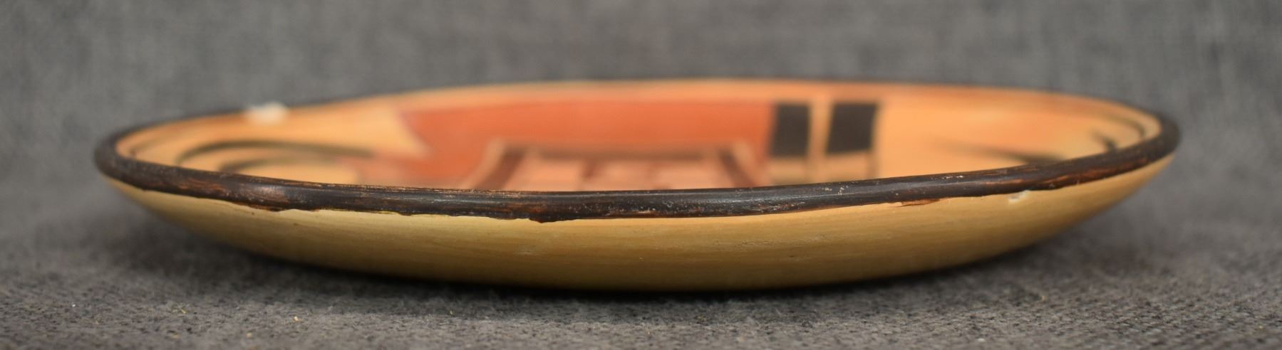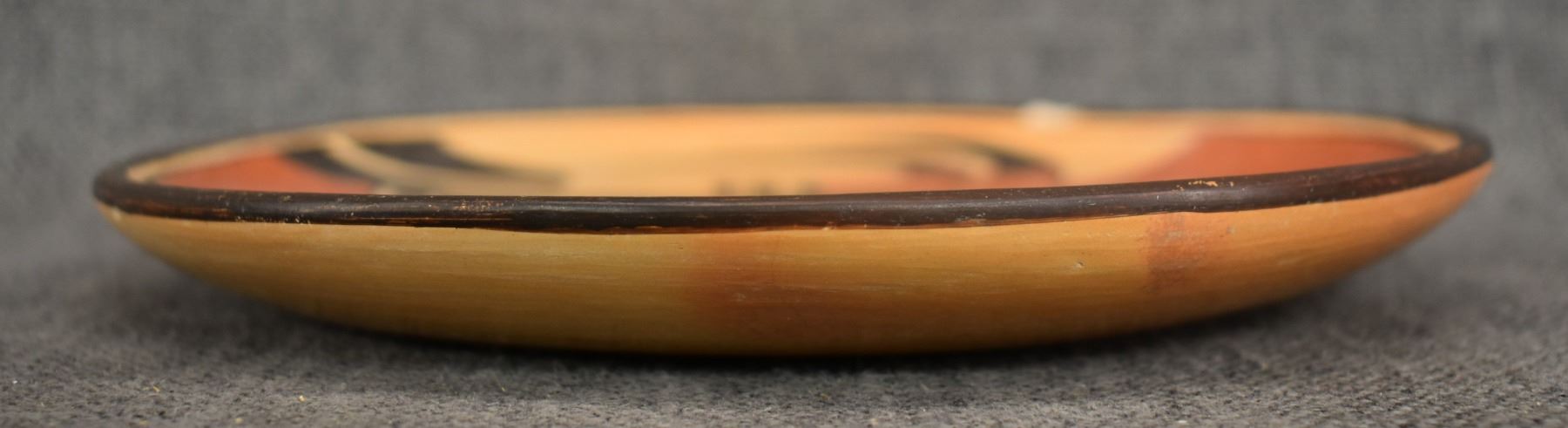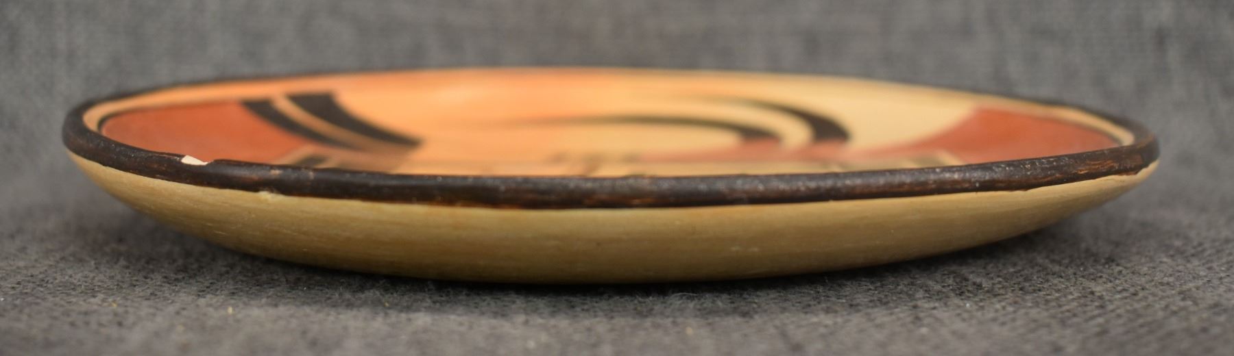 1980-90's Hopi, hand coiled with polychrome painted stylized bird design signed Nampeyo Koo-Loo. .75" x 7.25" has chip