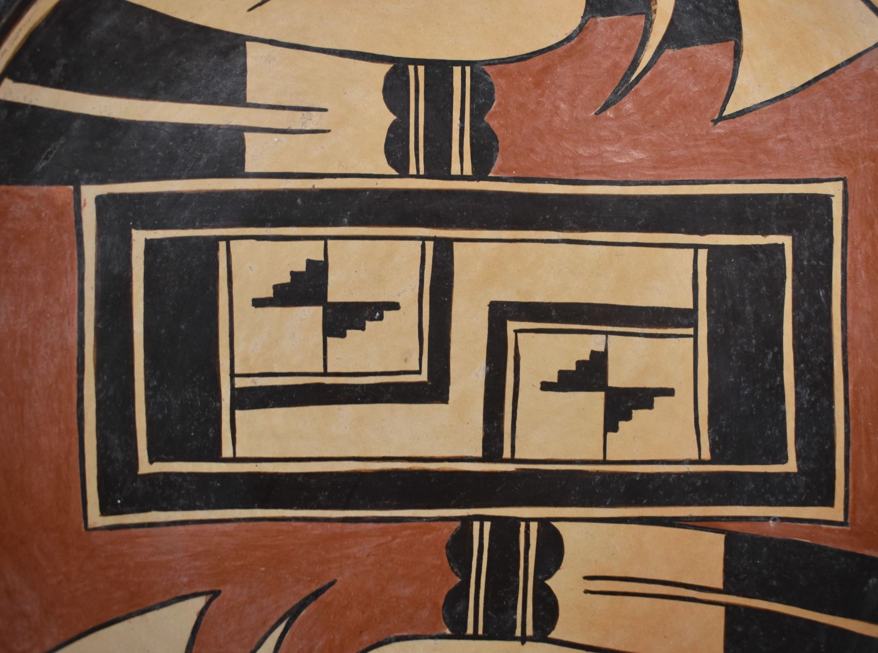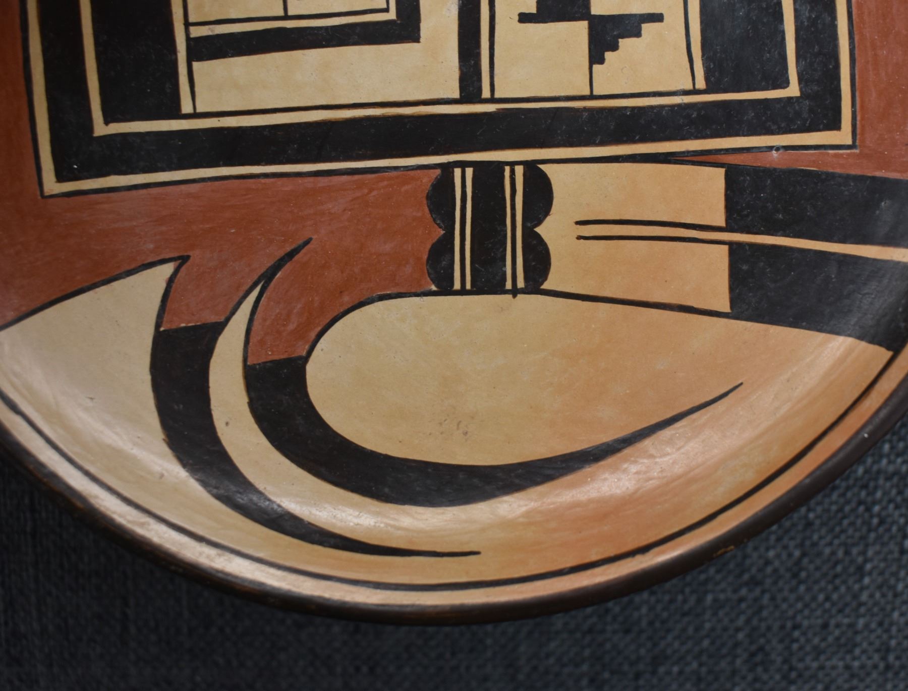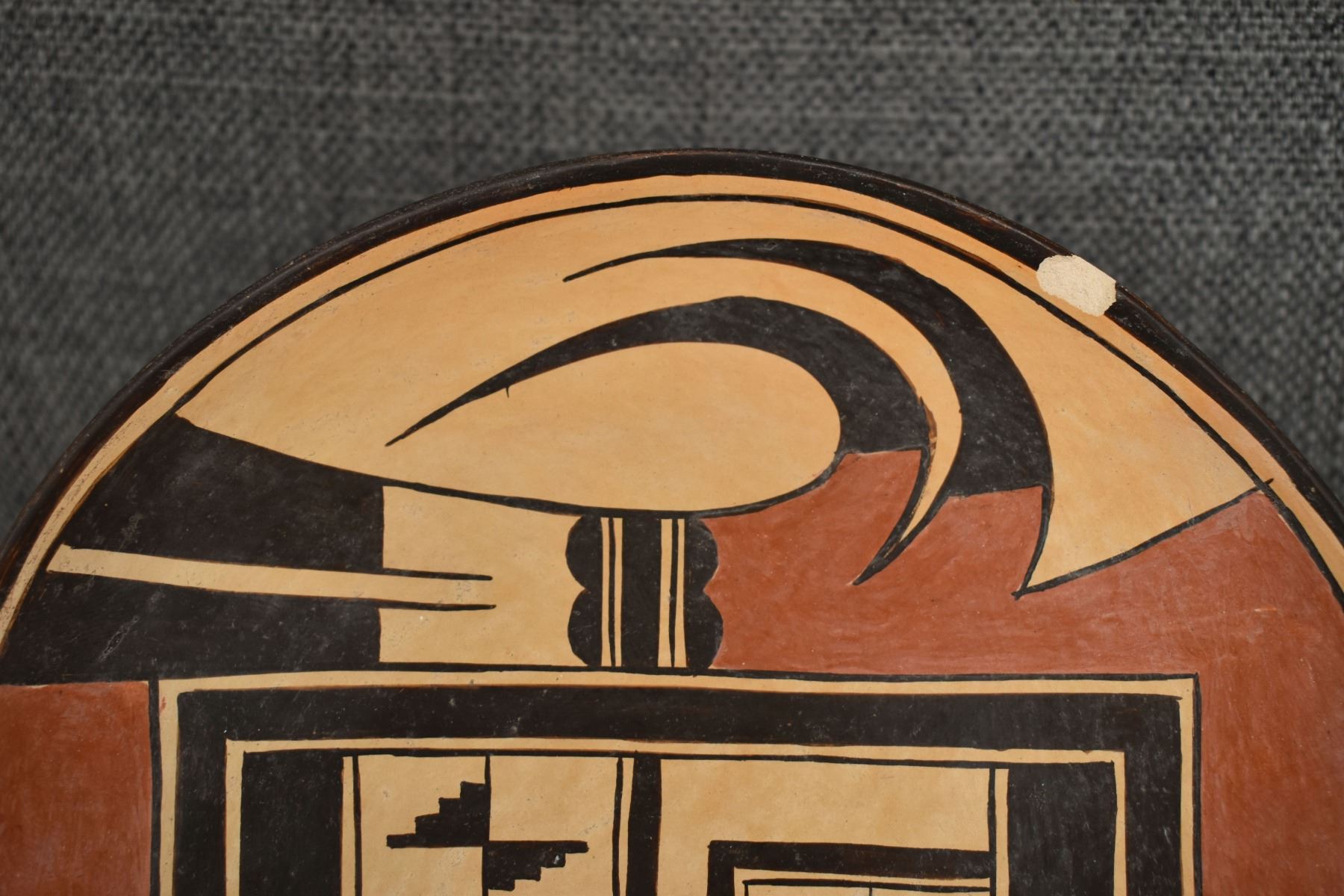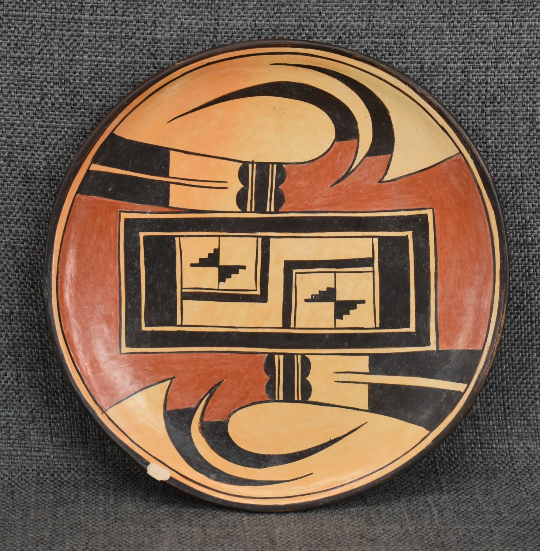 1980-90's Hopi, hand coiled with polychrome painted stylized bird design signed Nampeyo Koo-Loo. .75" x 7.25" has chip