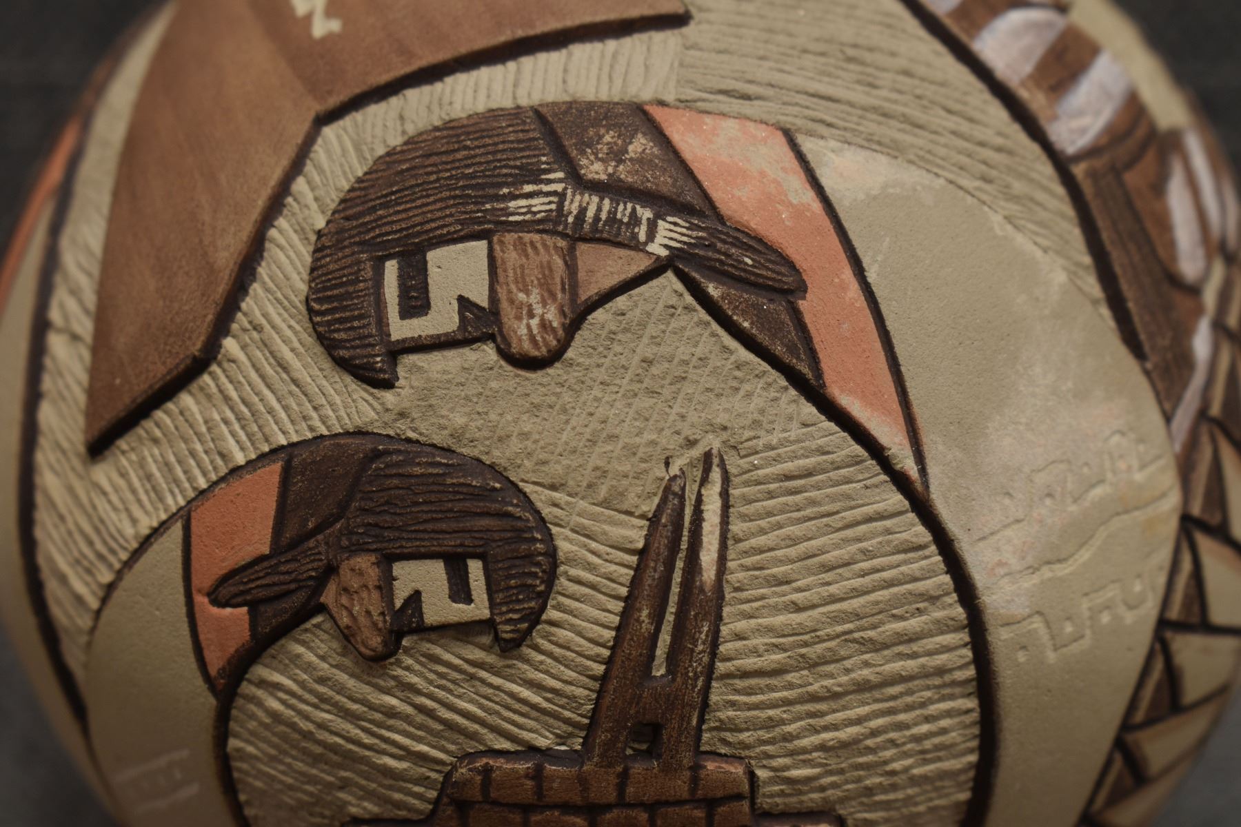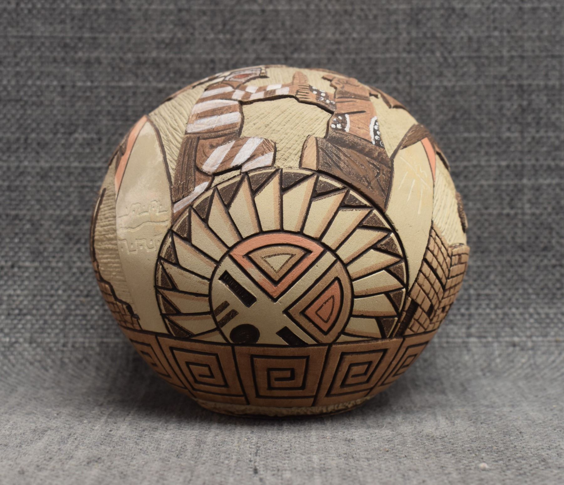 1990's Hopi, hand coiled and carved polychrome design pottery seed jar depicting kachinas signed Lawrence Namoki. 4'' x 4.5''