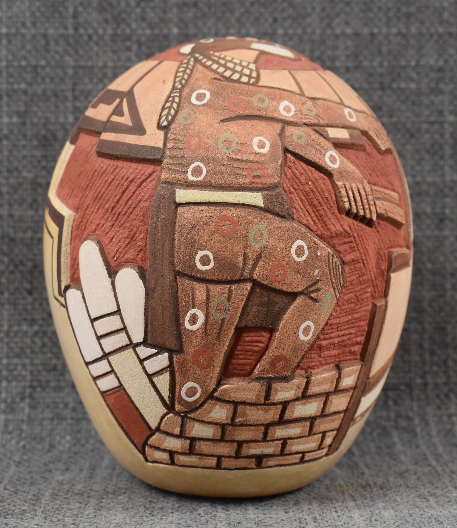 1990's Hopi, hand coiled with carved and painted design titled ""Hopi Fite God" 4.5" x 3.5"