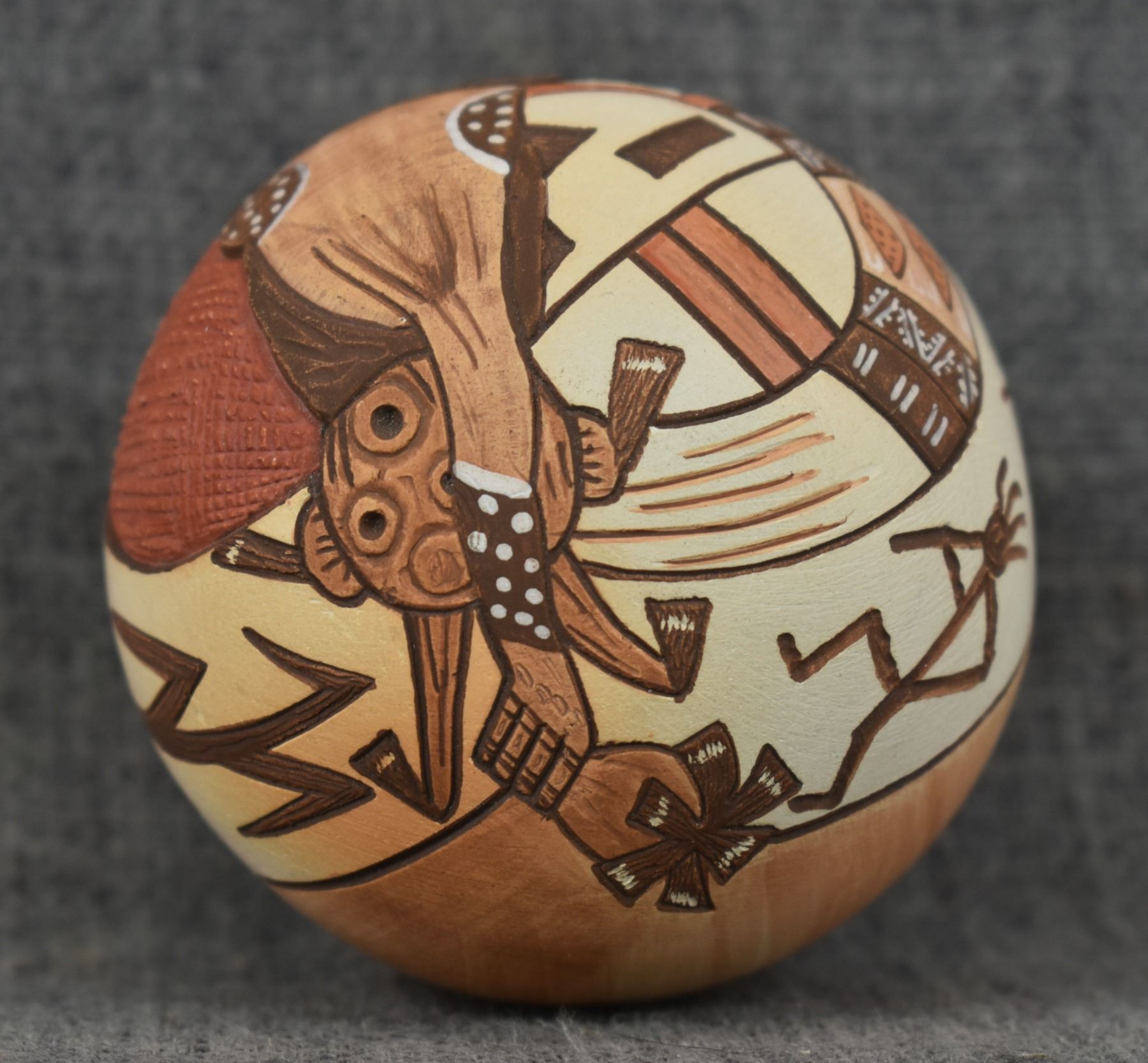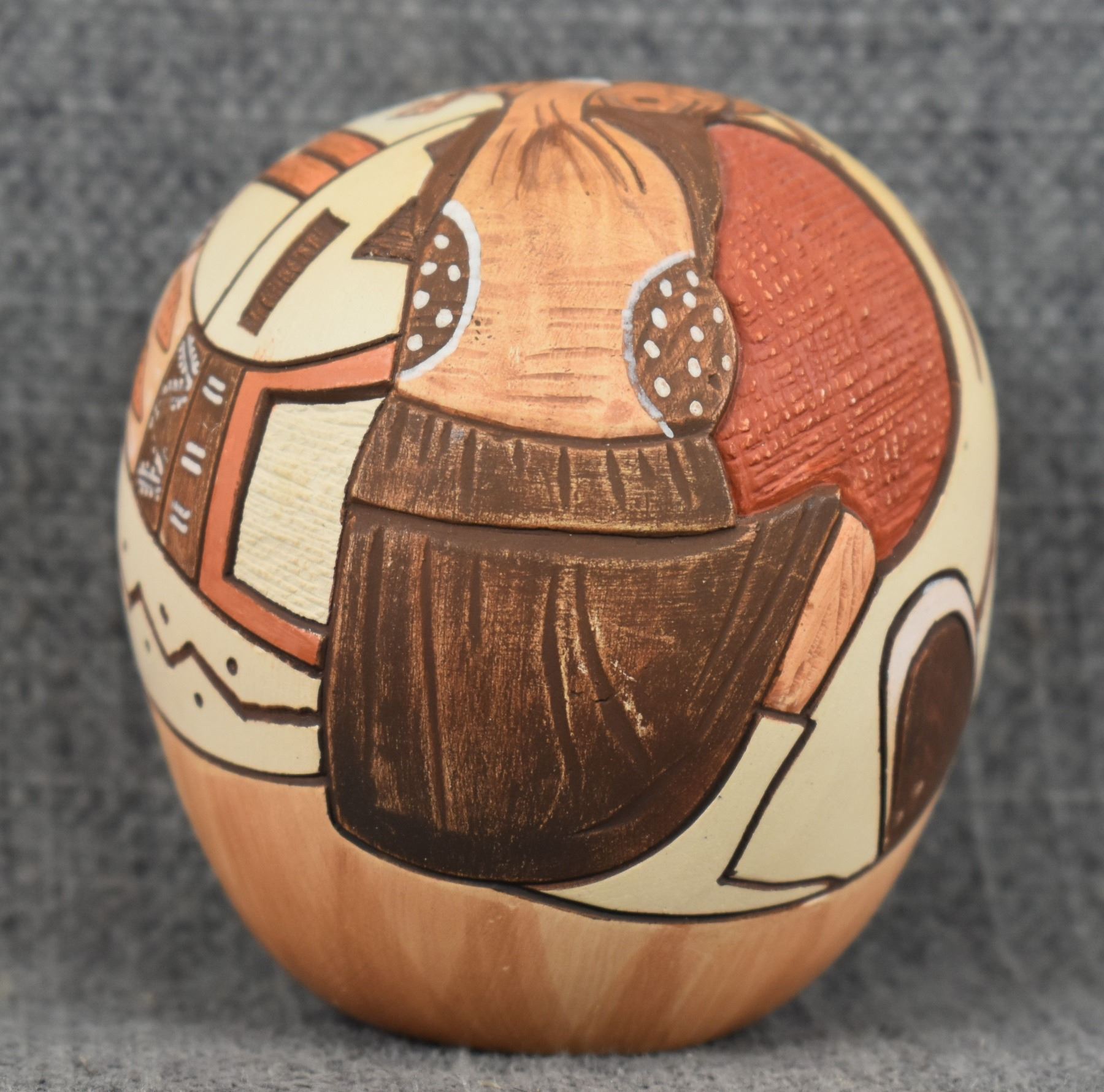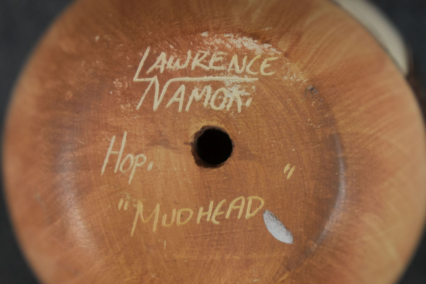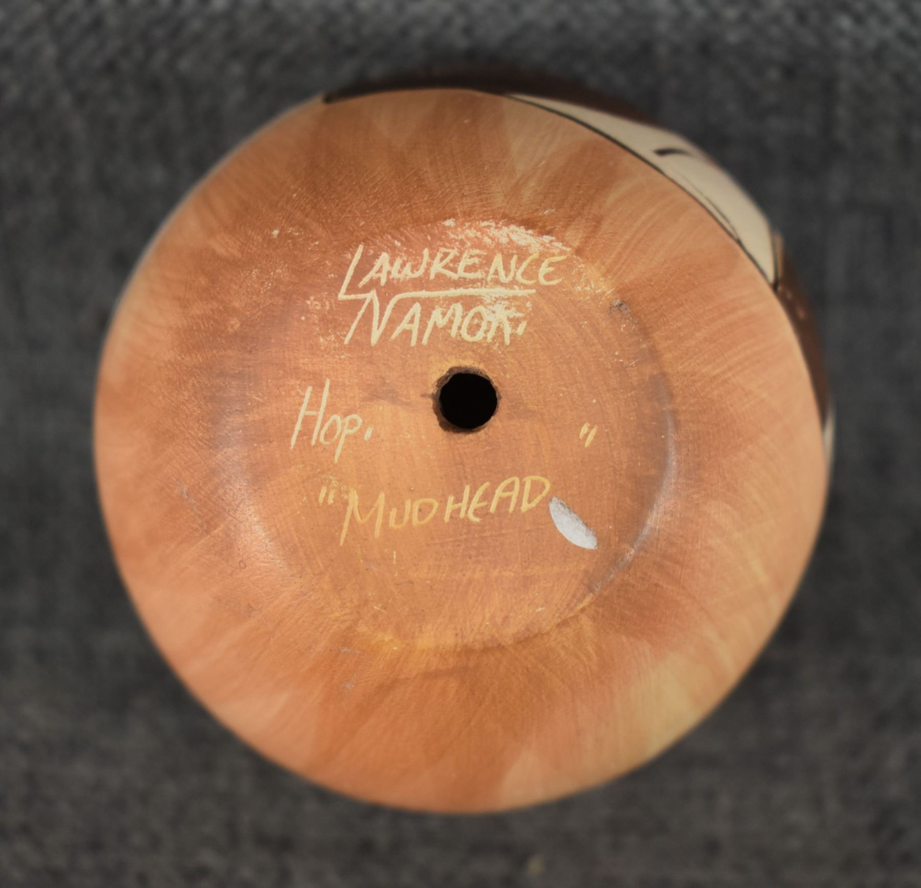 1990's Hopi, hand coiled with carved and painted design titled "Mudhead" by Lawrence Namoki. 3" x 2.5"