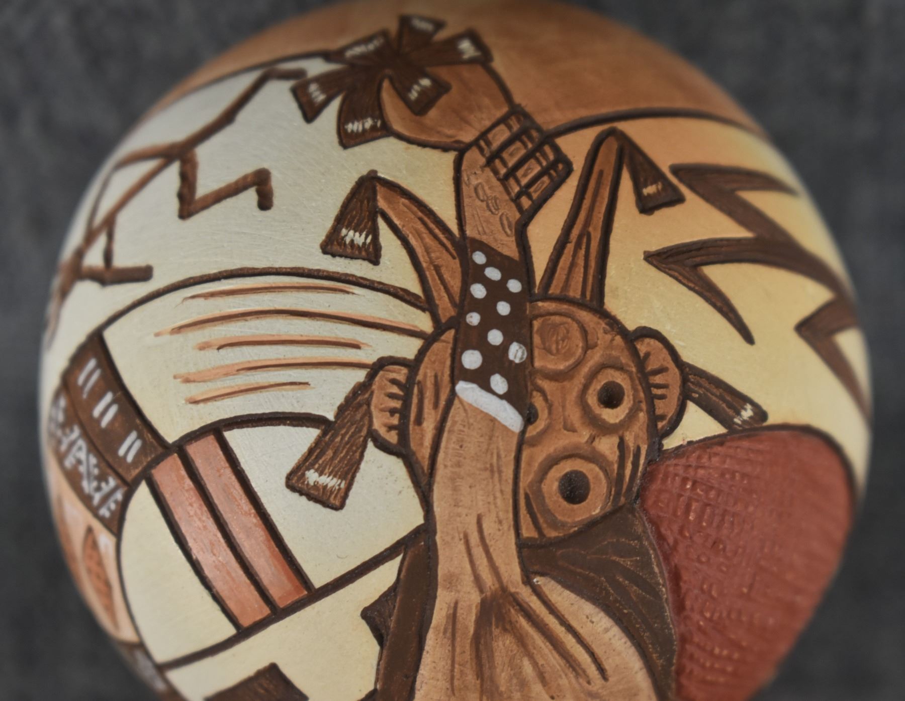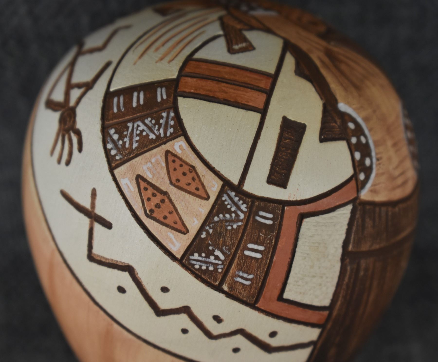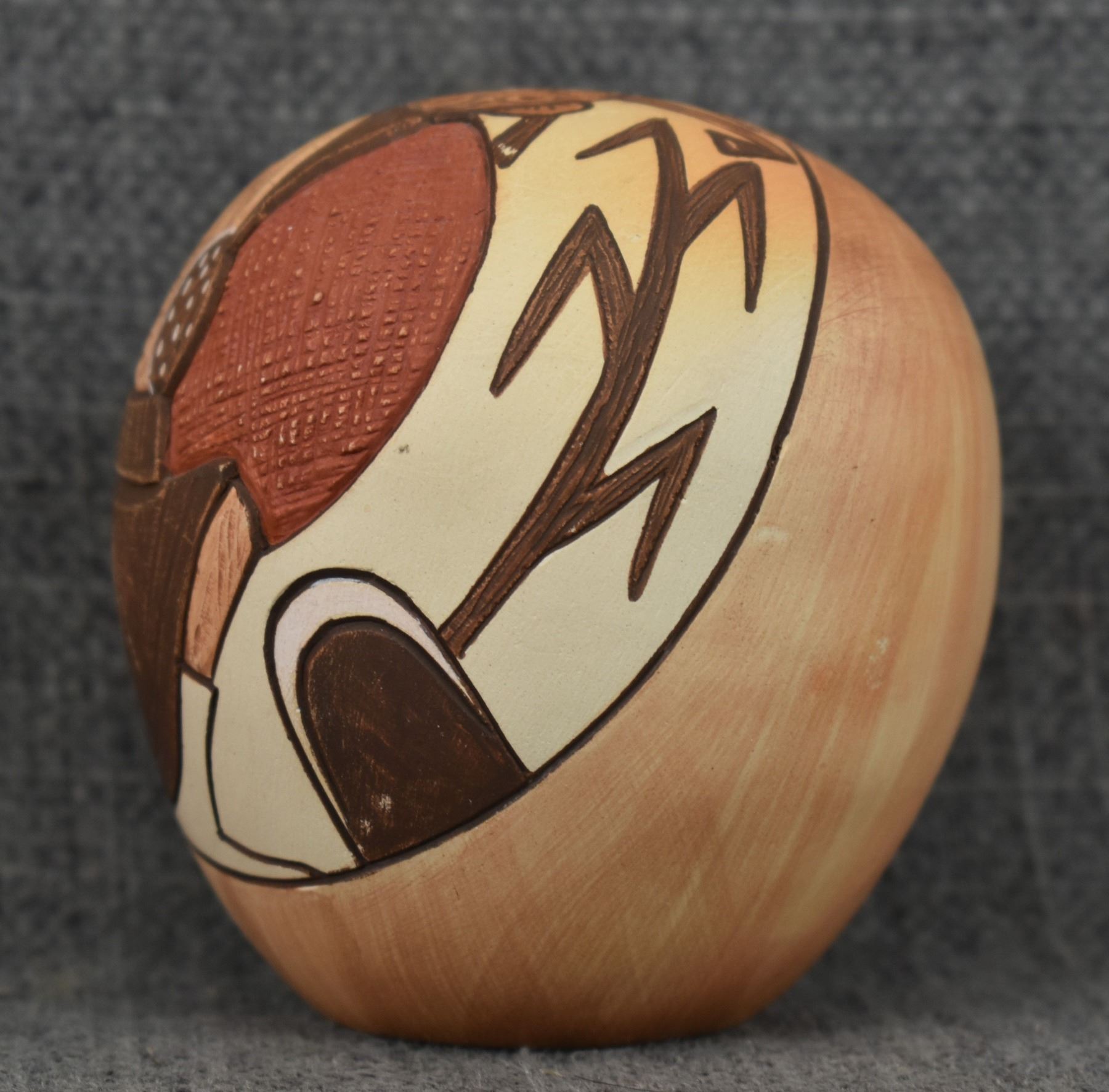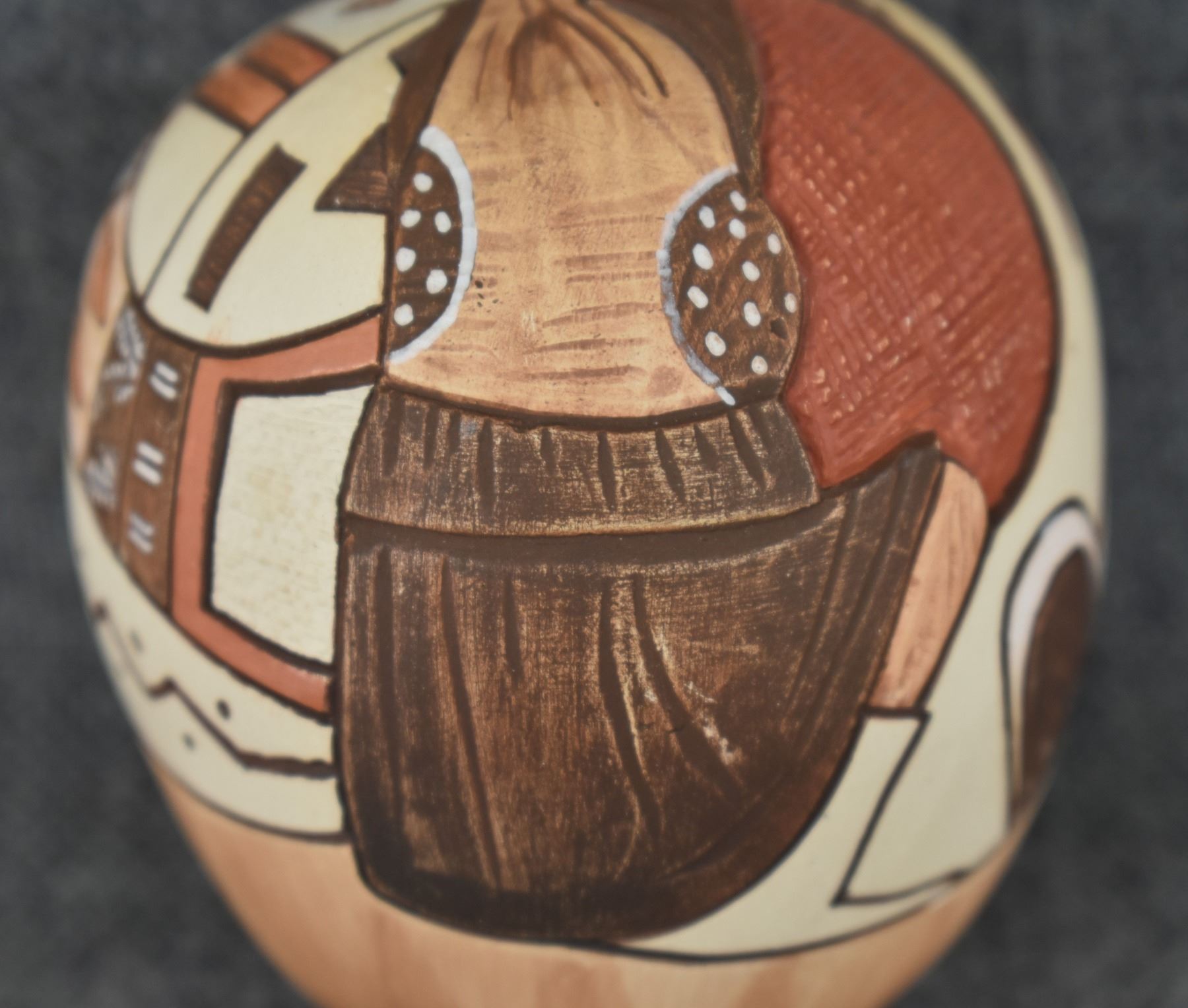 1990's Hopi, hand coiled with carved and painted design titled "Mudhead" by Lawrence Namoki. 3" x 2.5"