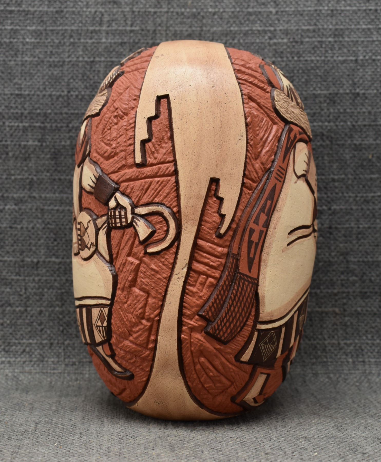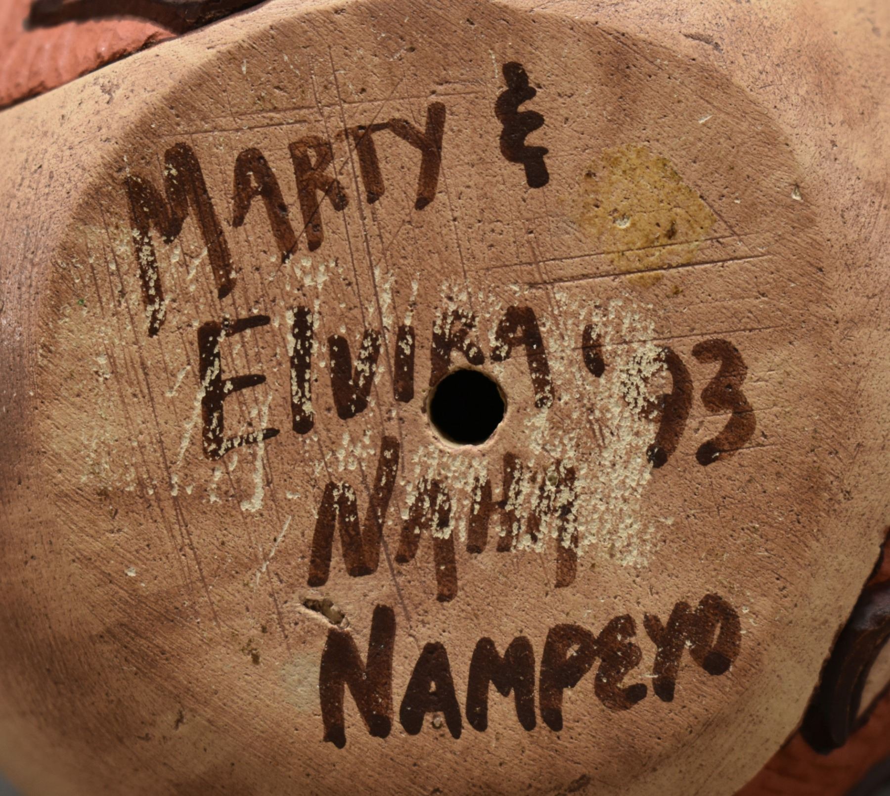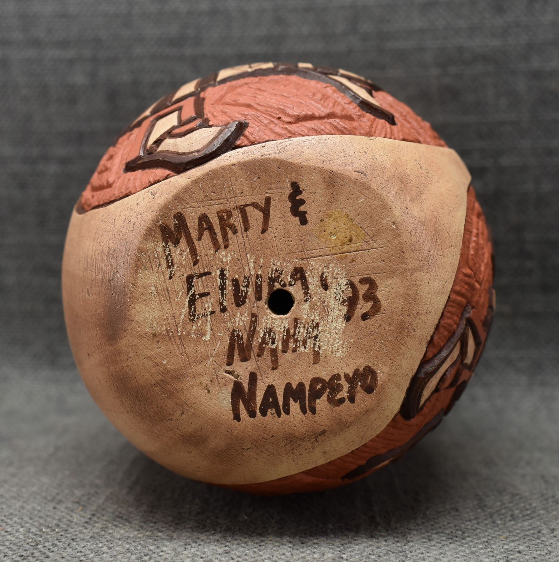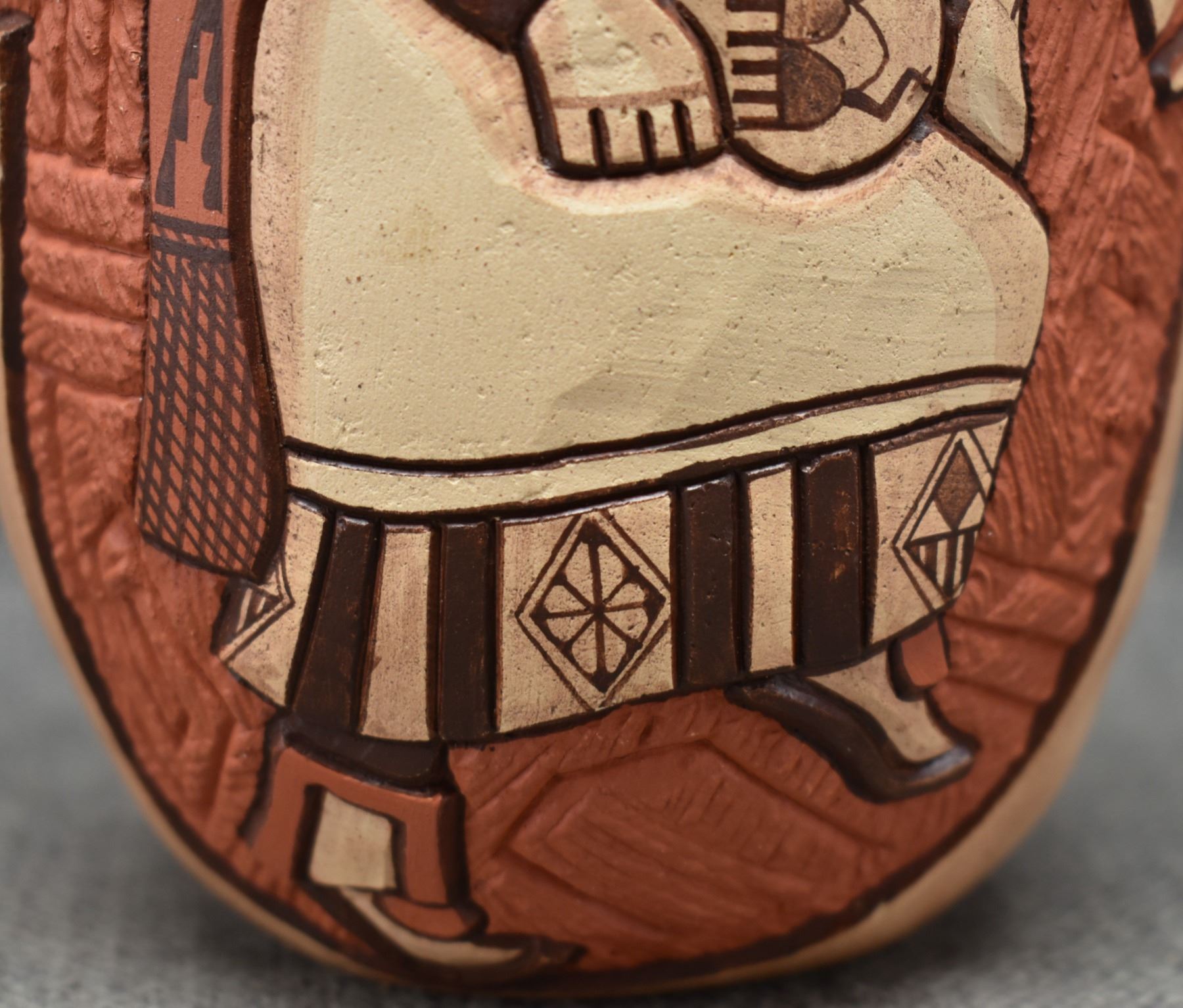 1990's Hopi Indian. Hand coiled carved and painted design depicting kachinas signed Marty and Elvira Naha Nampeyo. 7'' x 4.5''