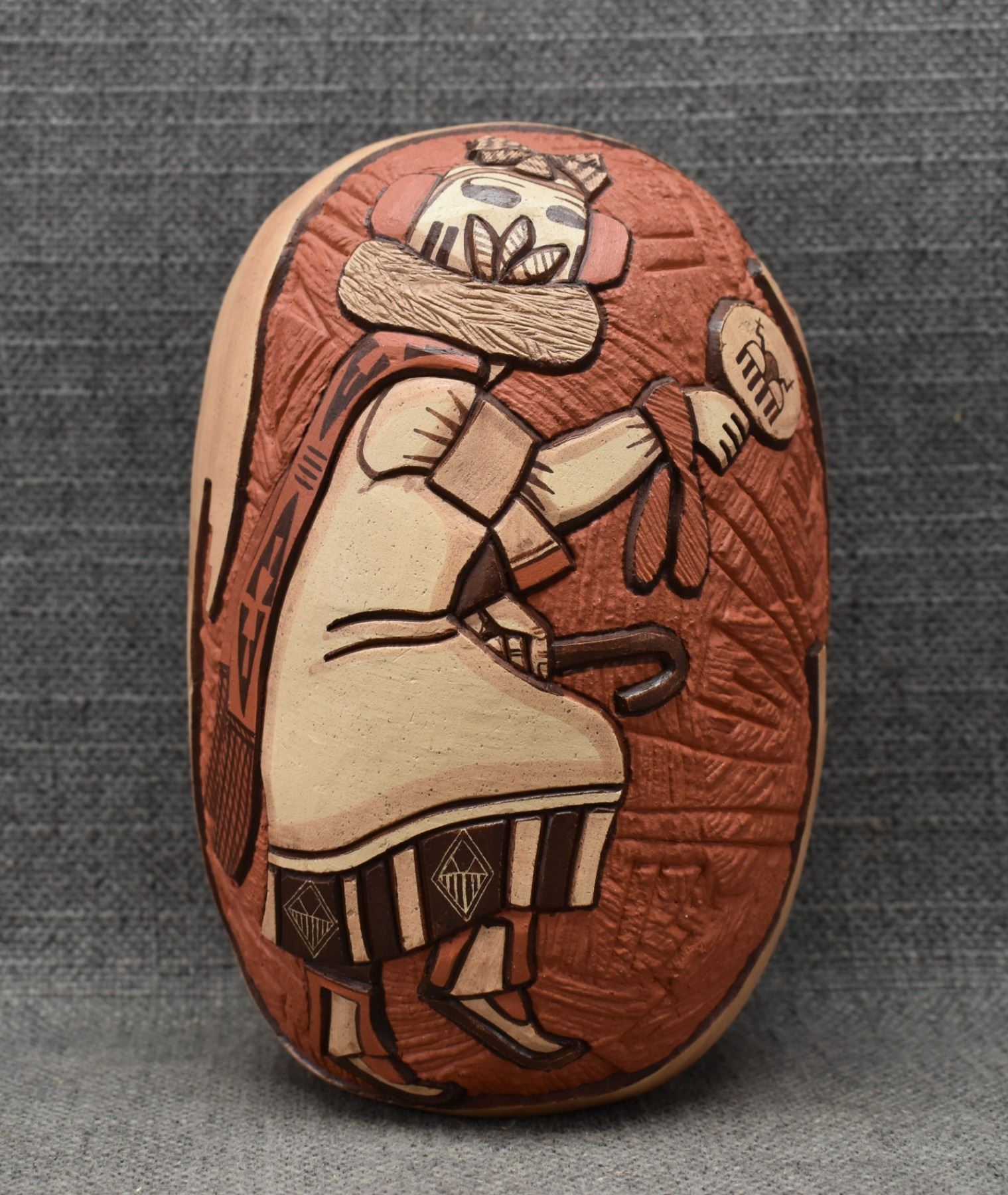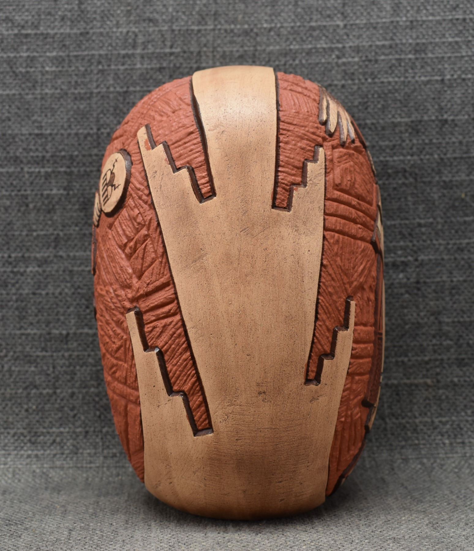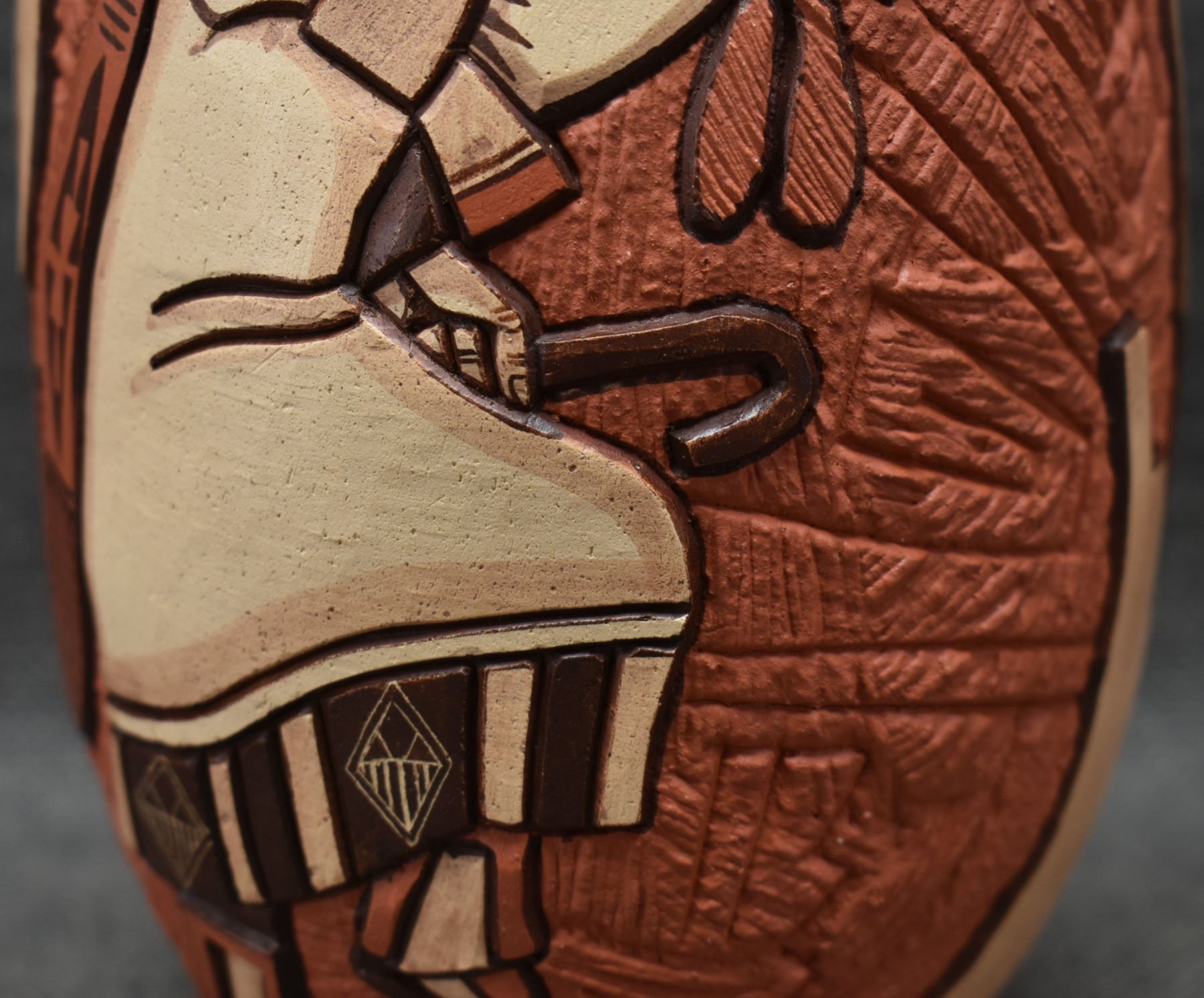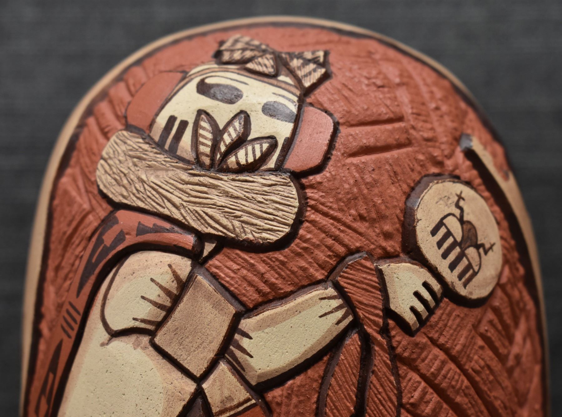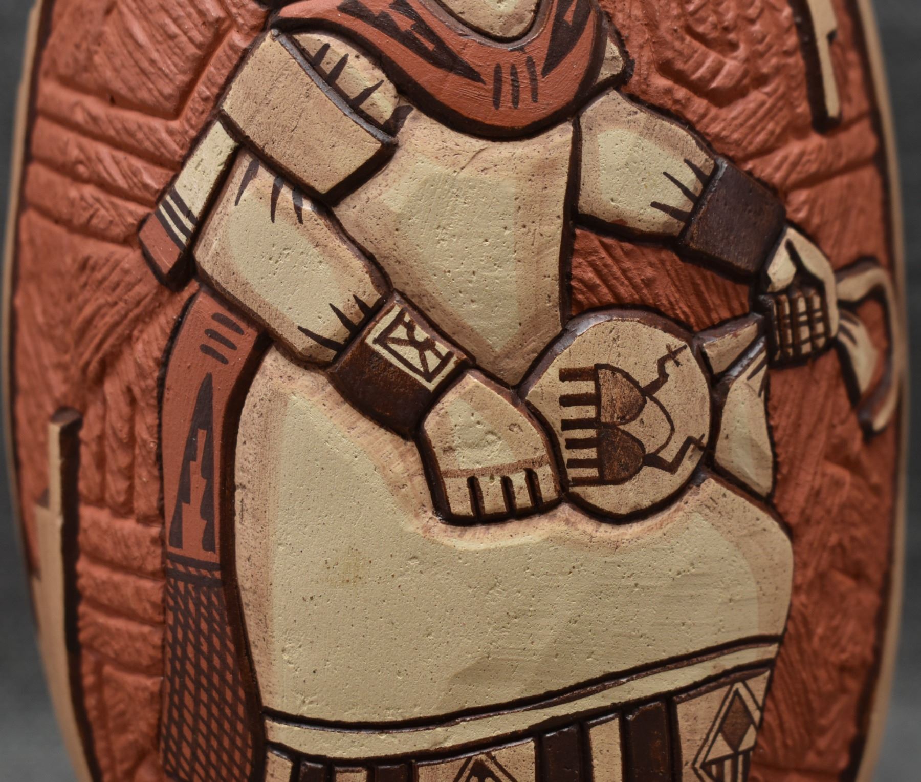 1990's Hopi Indian. Hand coiled carved and painted design depicting kachinas signed Marty and Elvira Naha Nampeyo. 7'' x 4.5''