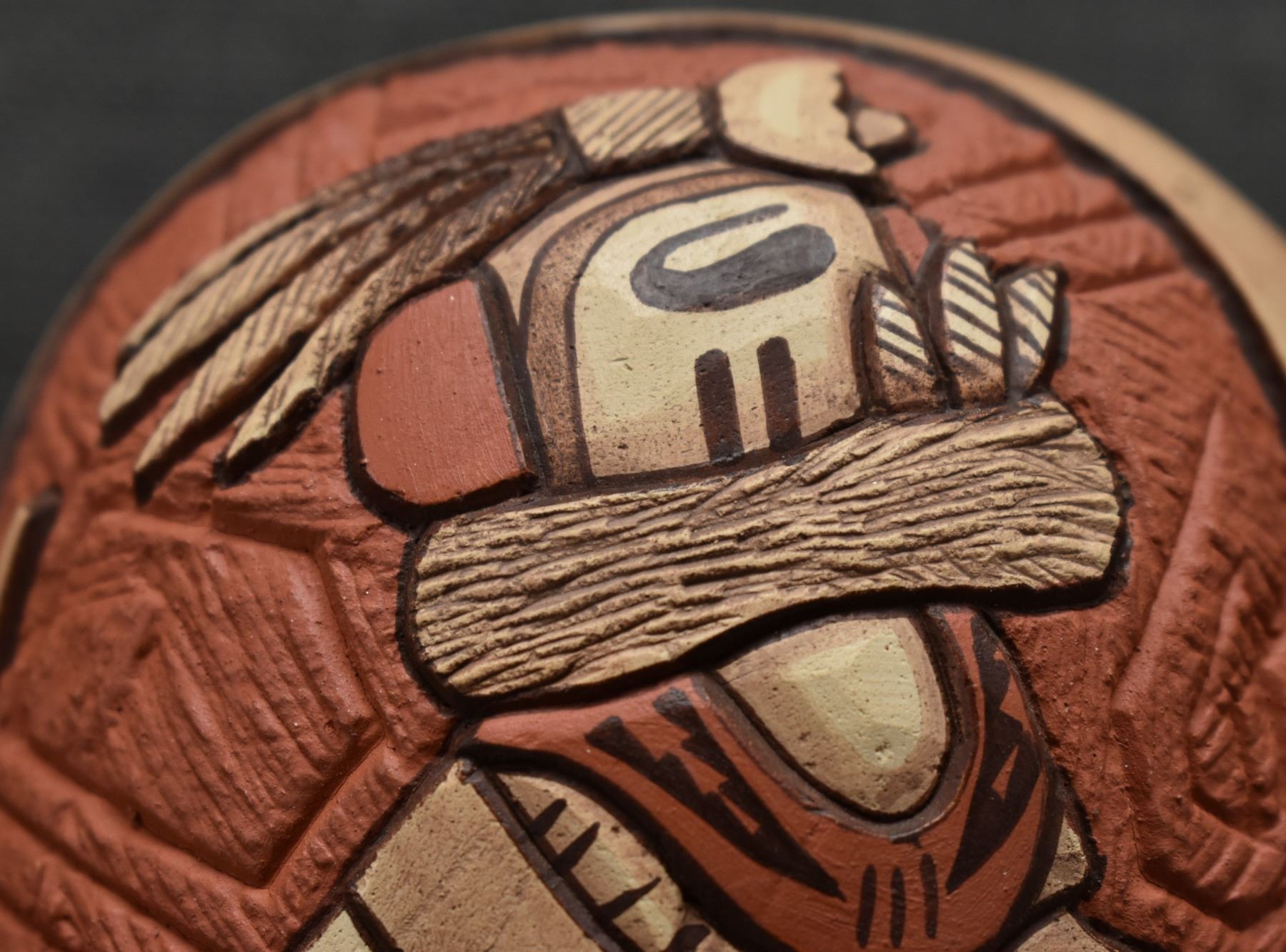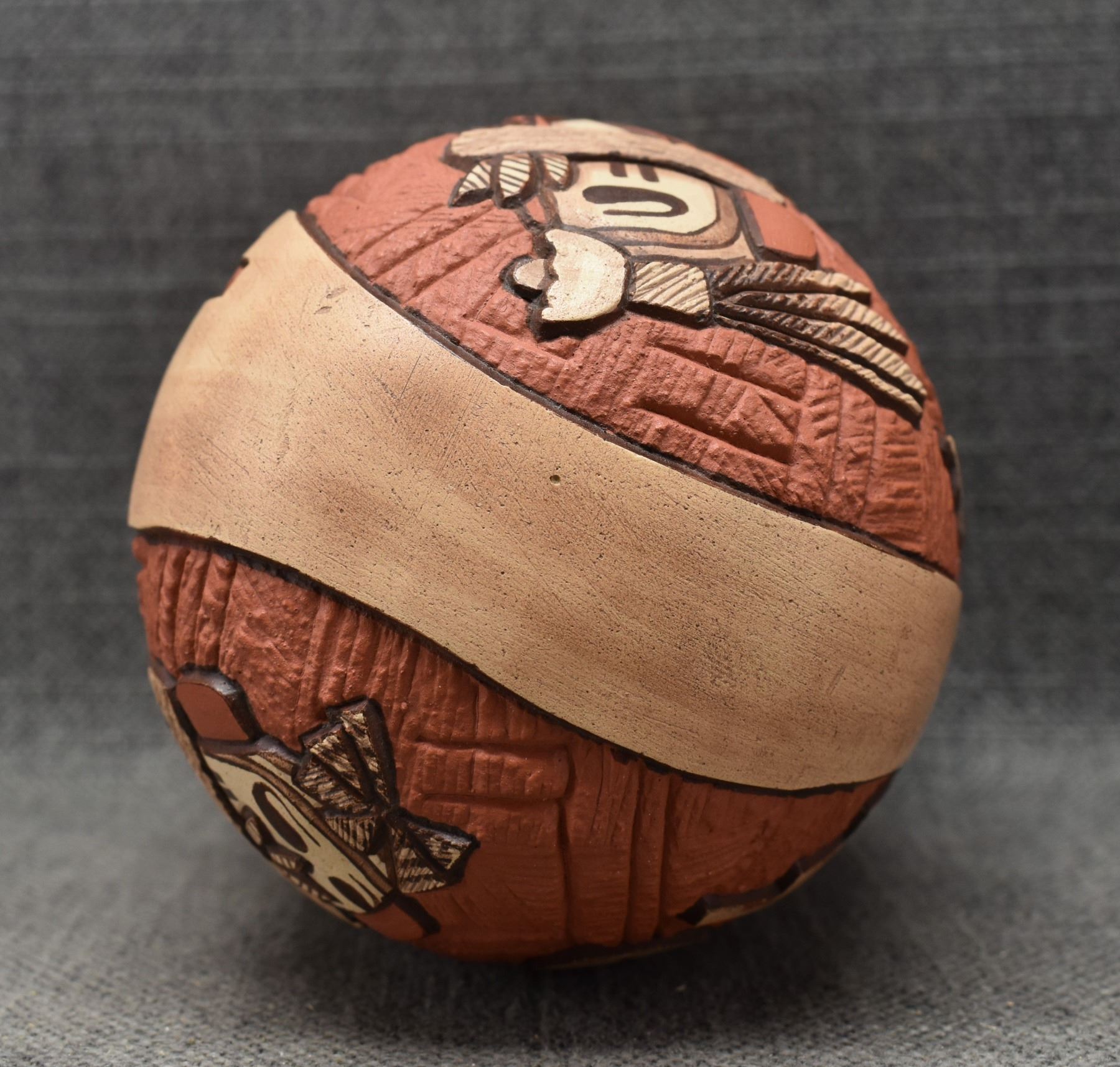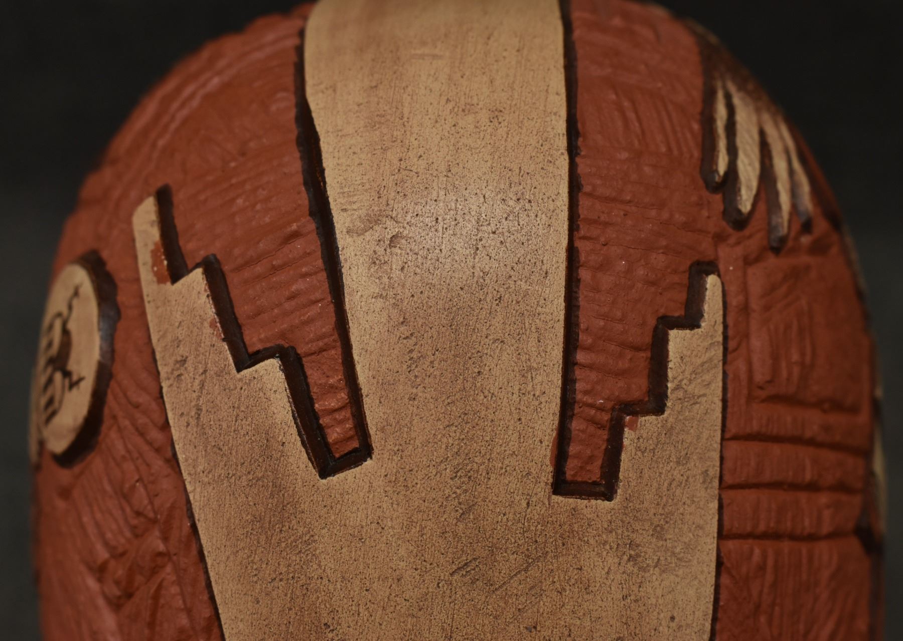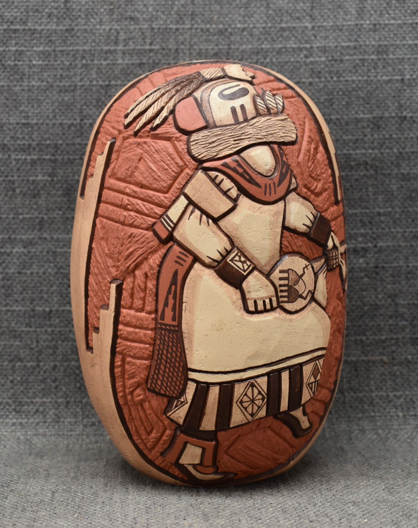 1990's Hopi Indian. Hand coiled carved and painted design depicting kachinas signed Marty and Elvira Naha Nampeyo. 7'' x 4.5''