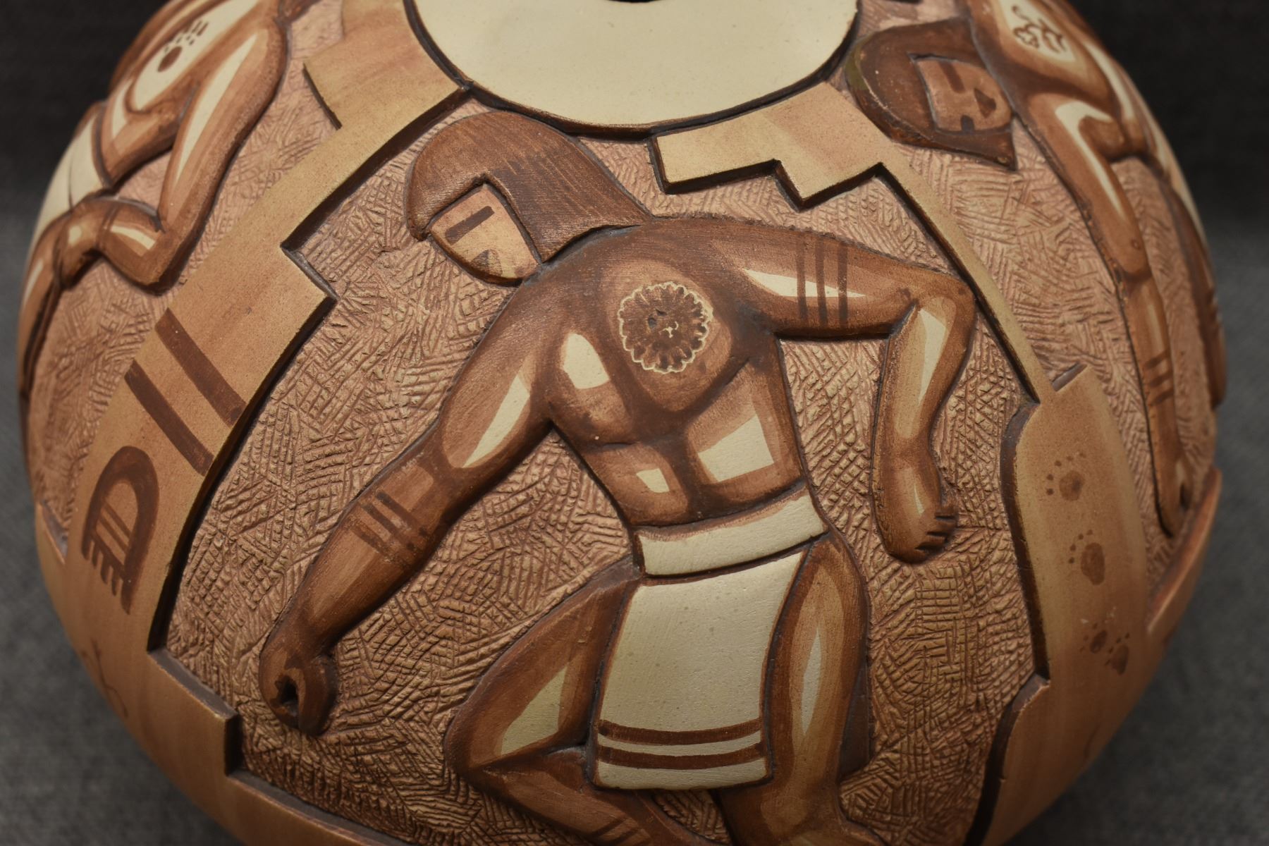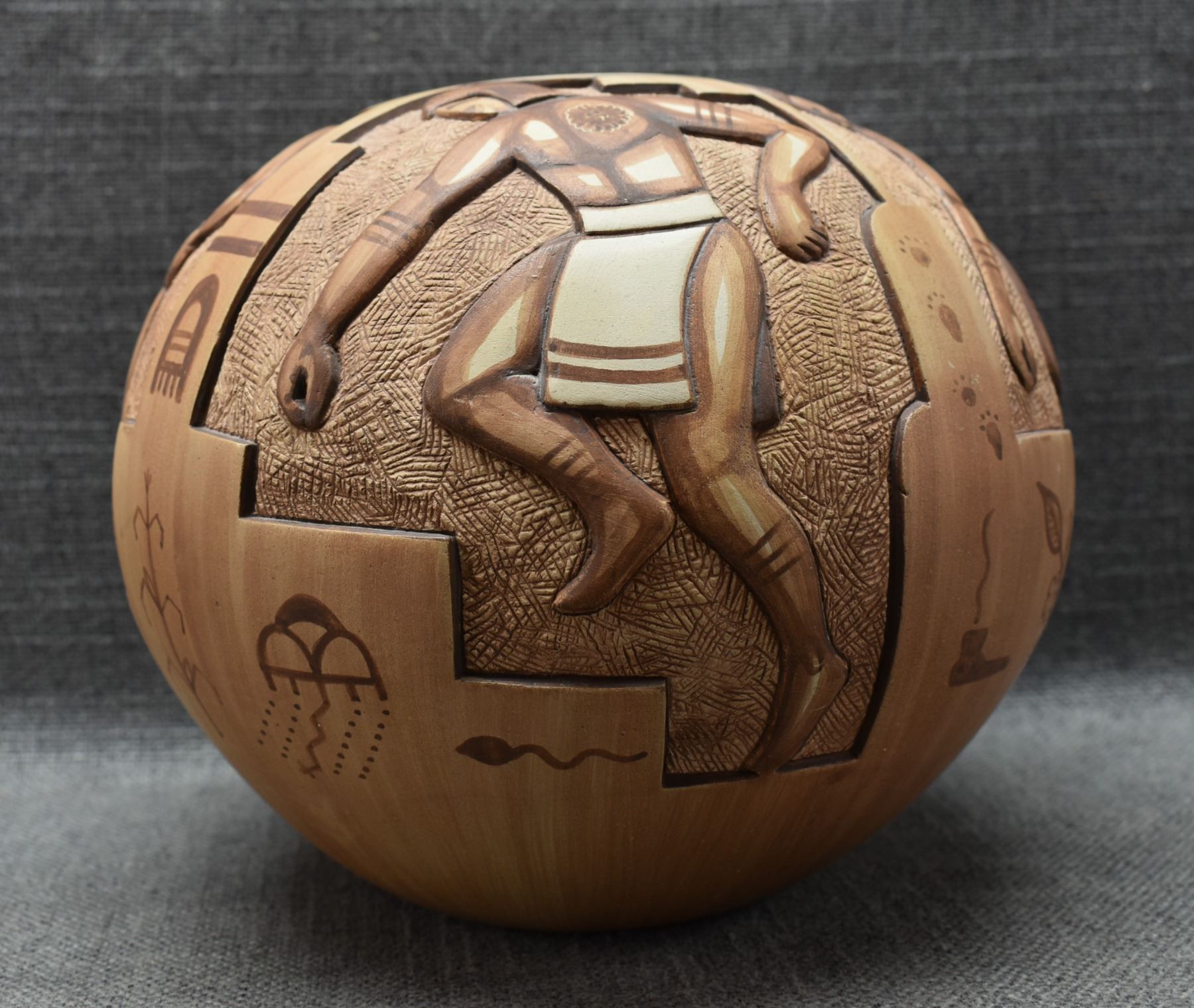 1988 hand coiled carved and painted kachina design pottery jar. by Tom Polacca 8" x 8"