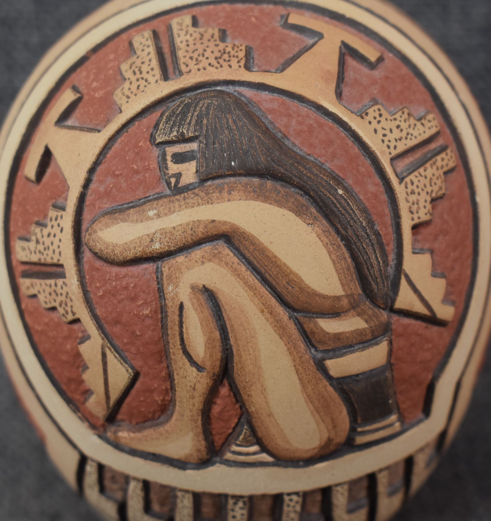 1987 Hopi, hand coiled with carved and painted design by Tom Polacca 4.25" x 3"