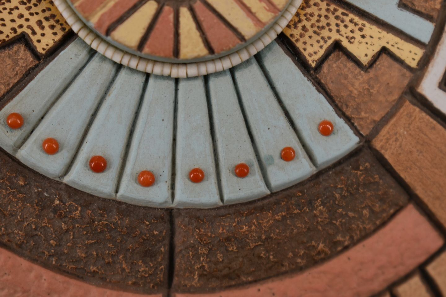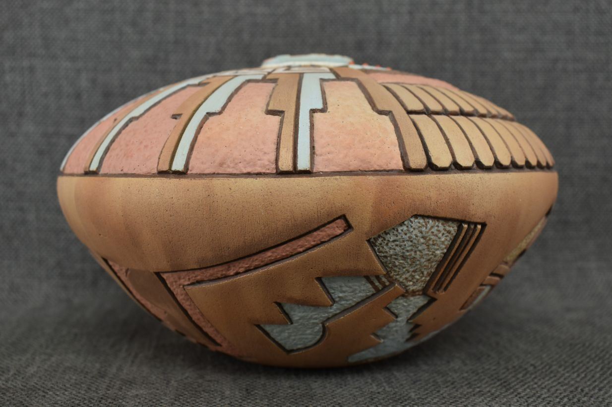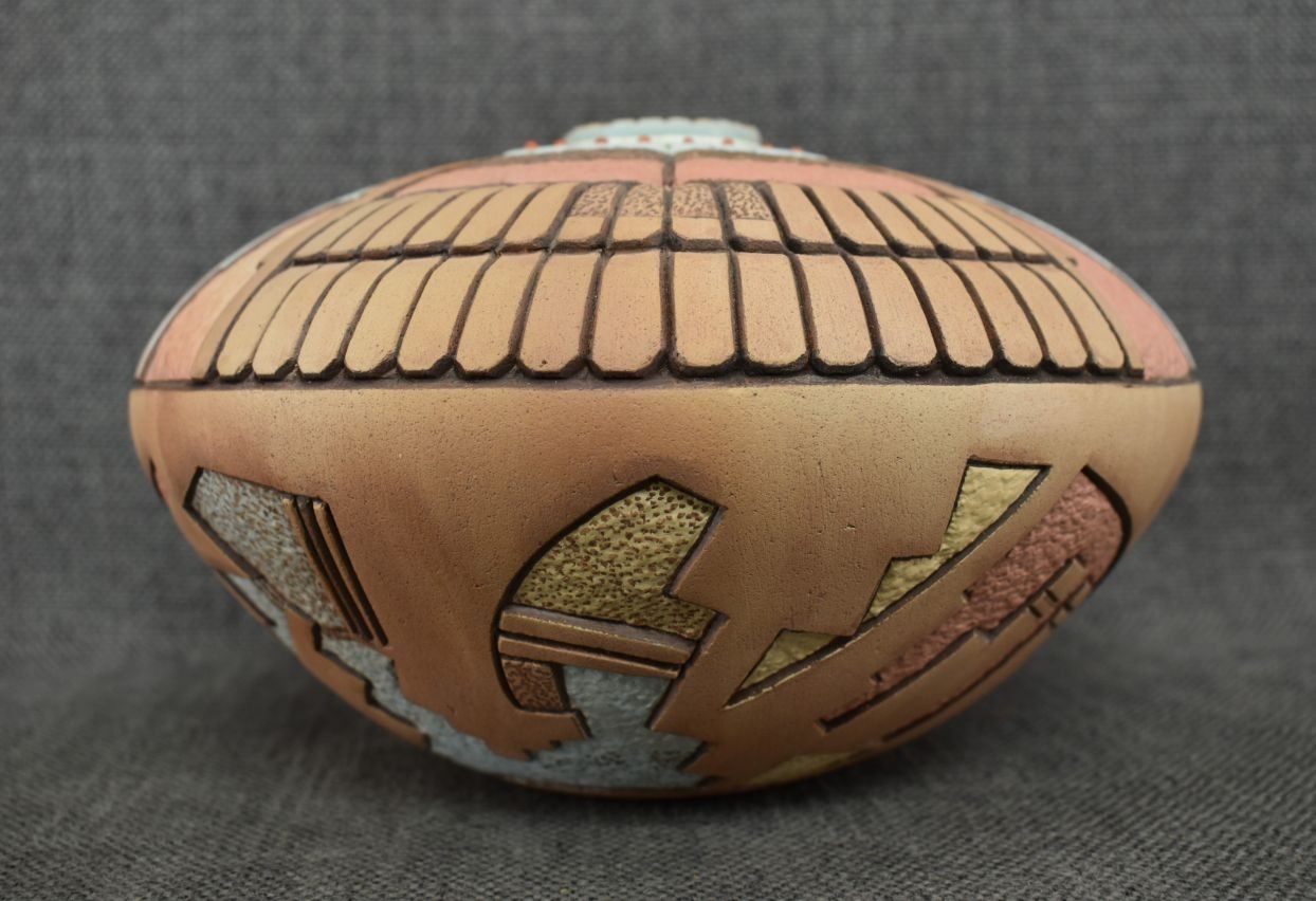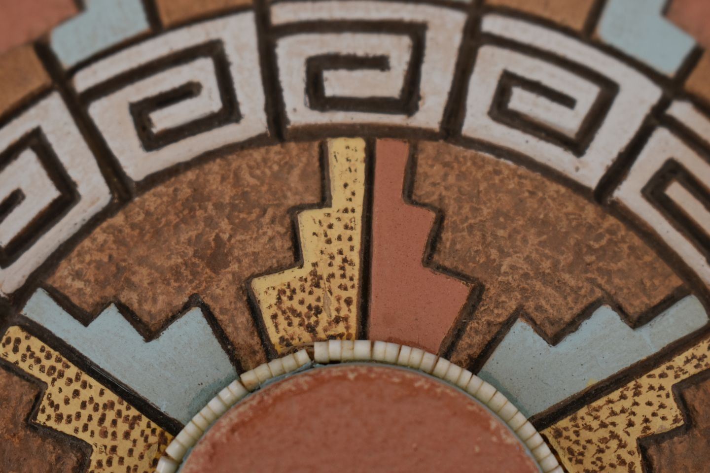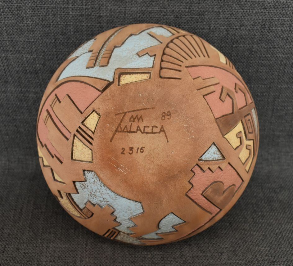 1989 Hopi, hand coiled with carved and painted polik manna and geometric design with heishi and inlaid coral by Tom Polacca 5" x 8.25"