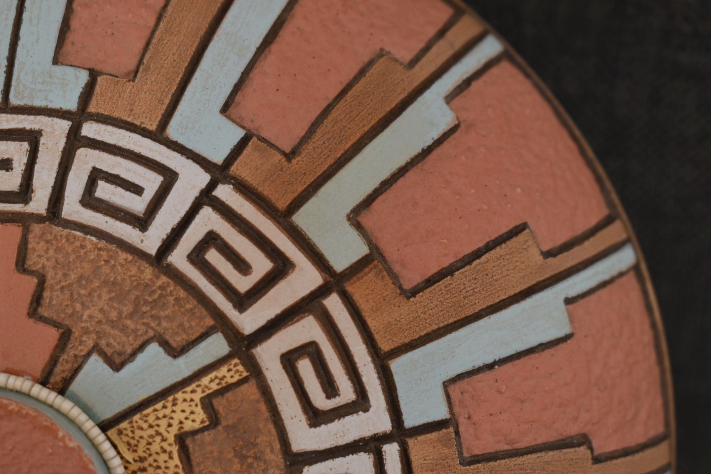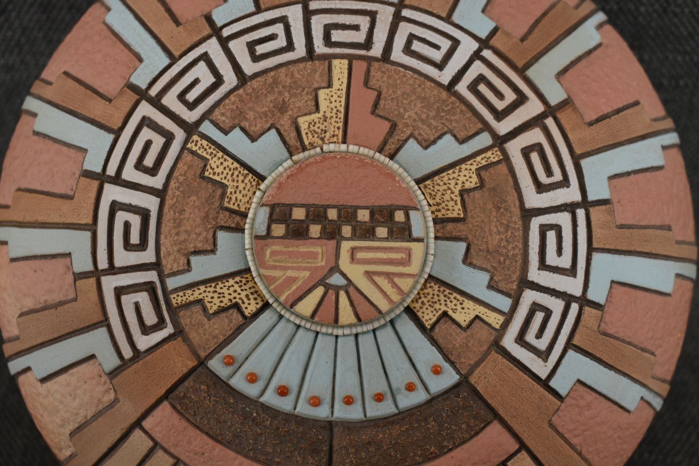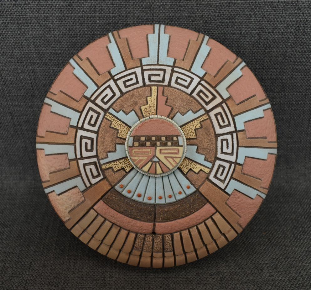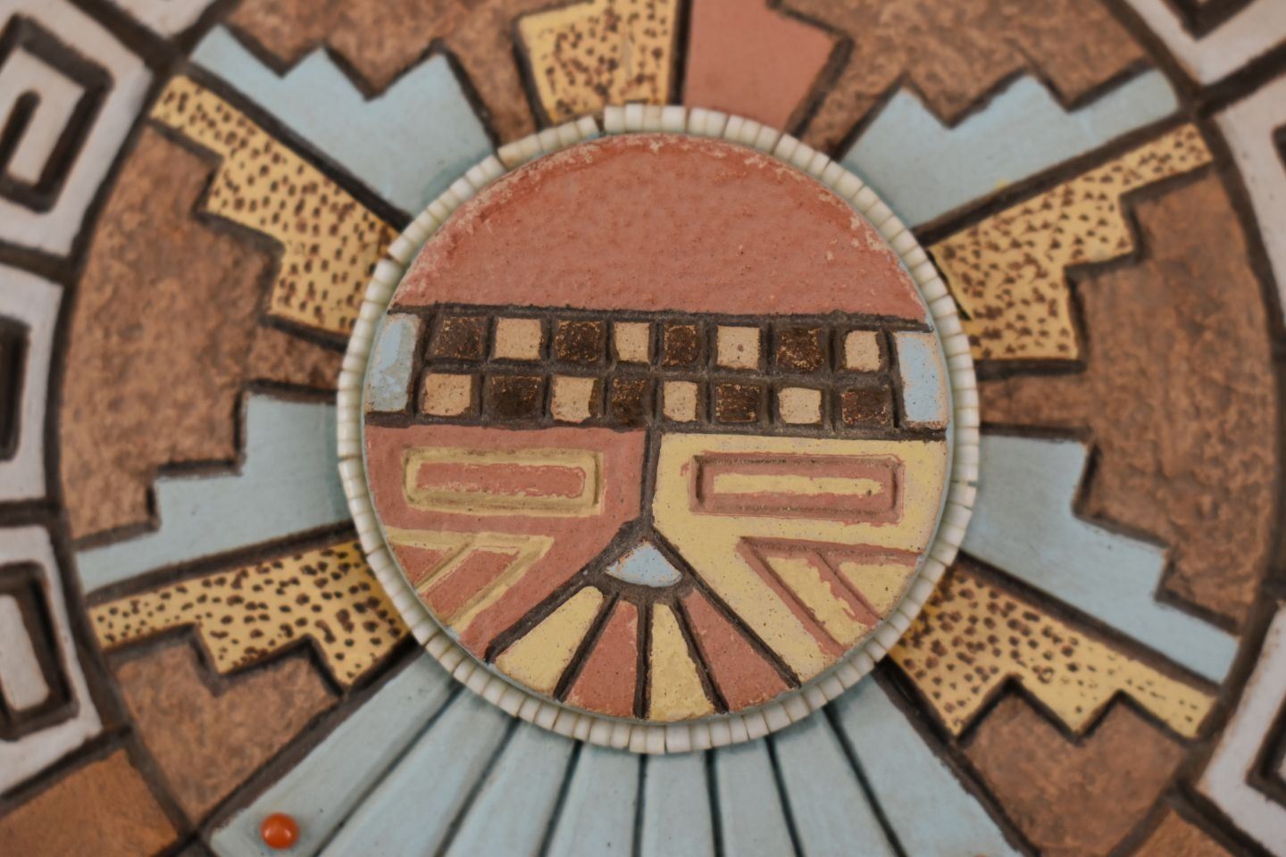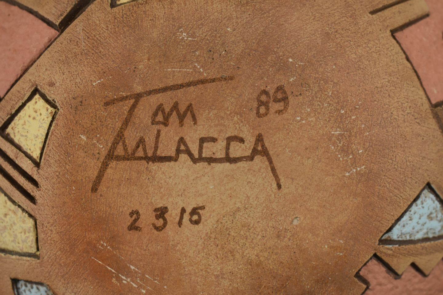 1989 Hopi, hand coiled with carved and painted polik manna and geometric design with heishi and inlaid coral by Tom Polacca 5" x 8.25"