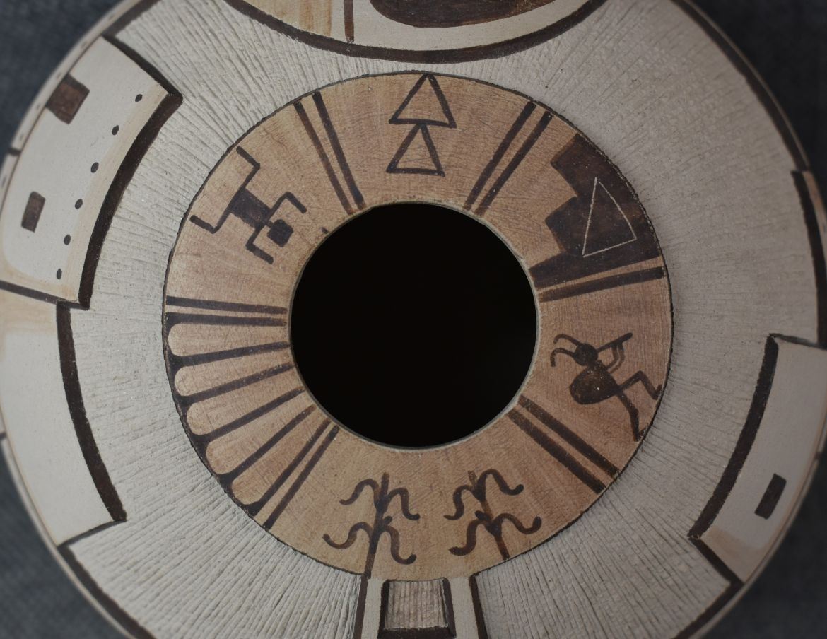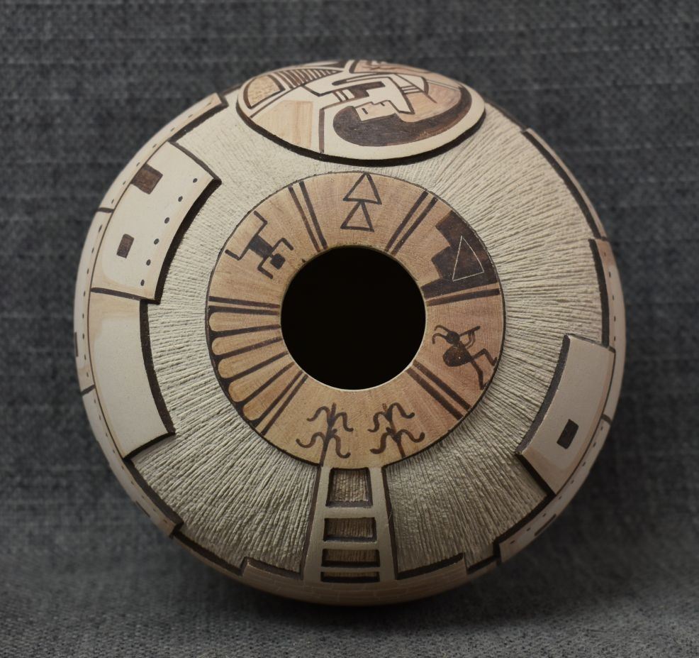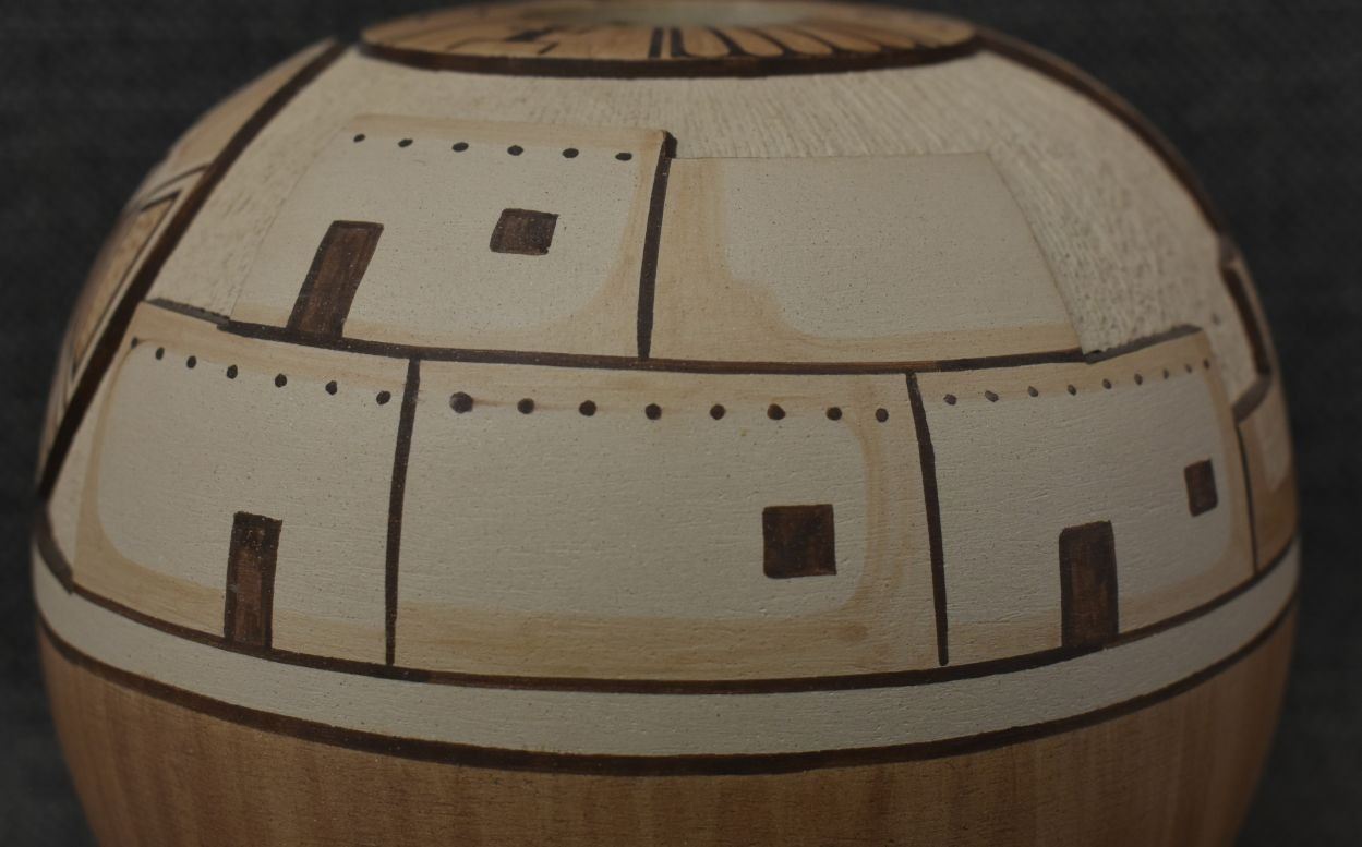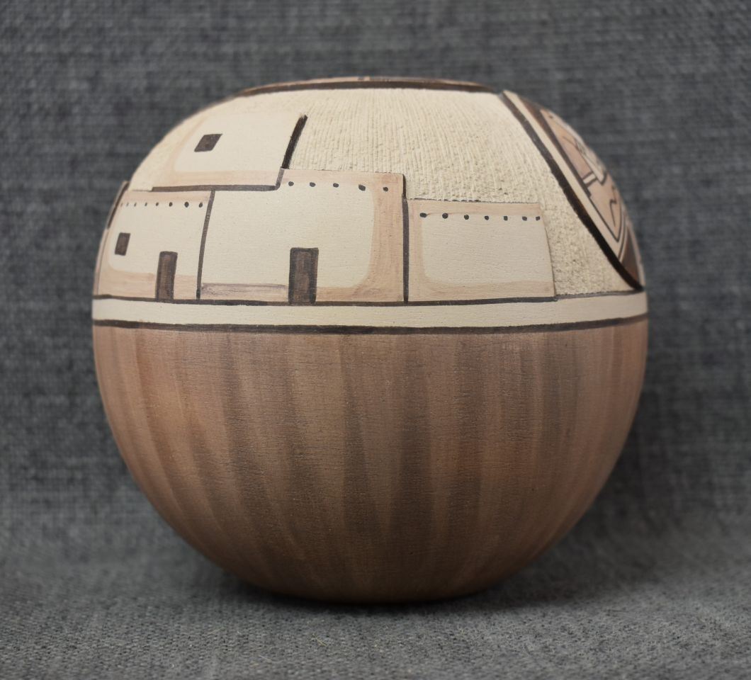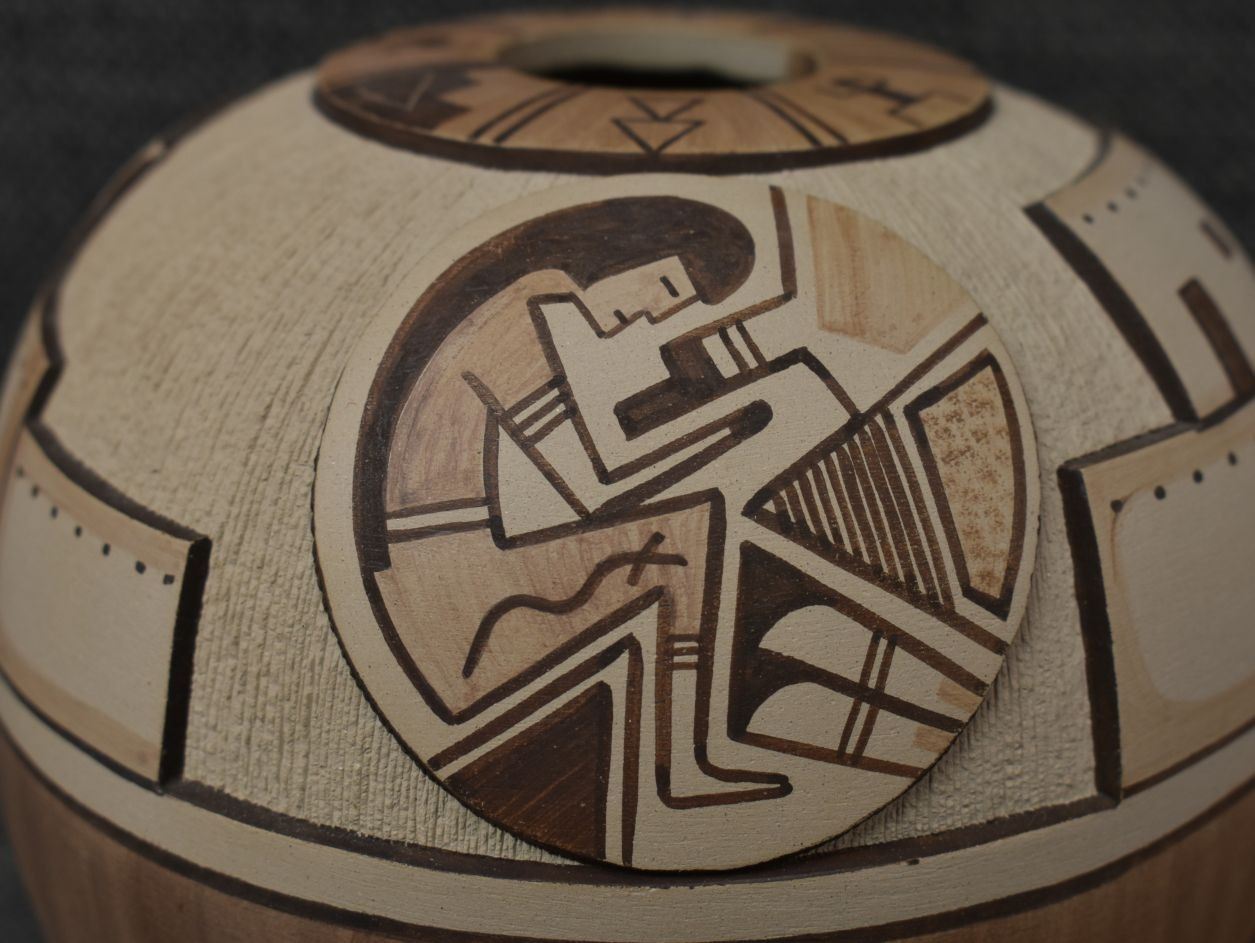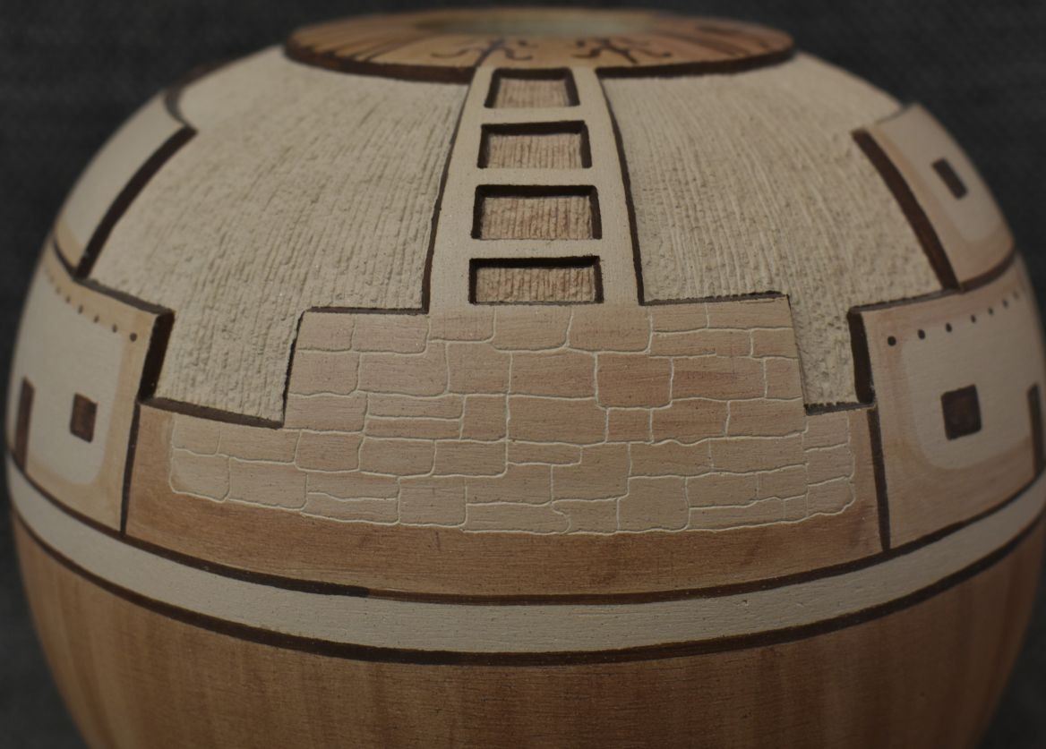 1980-90's Hopi, hand coiled with carved and painted pueblo scene by Wallace Youvella 4.75" x 5"