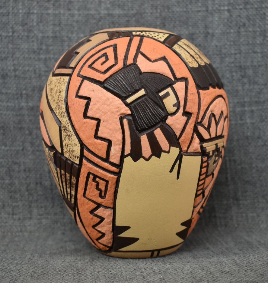 1980-90's Hopi, hand coiled with carved and painted Corn Maiden, cornstalk, and pueblo design by Carla Nampeyo 5.75" x 4.75"