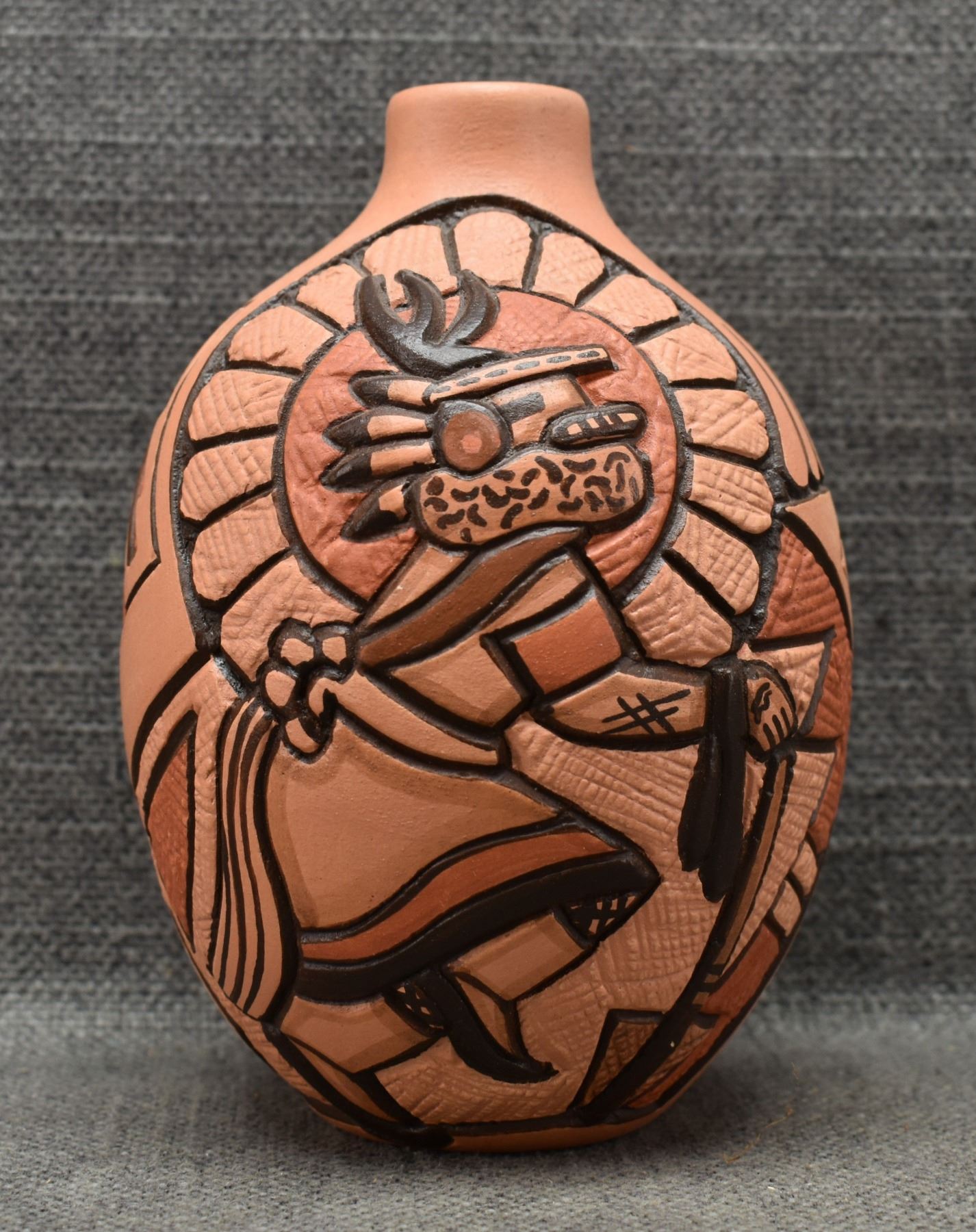1990-2000's Hopi, hand coiled with carved and painted pueblo and deer dancer kachina design by Carla Nampeyo 5.75" x 4"