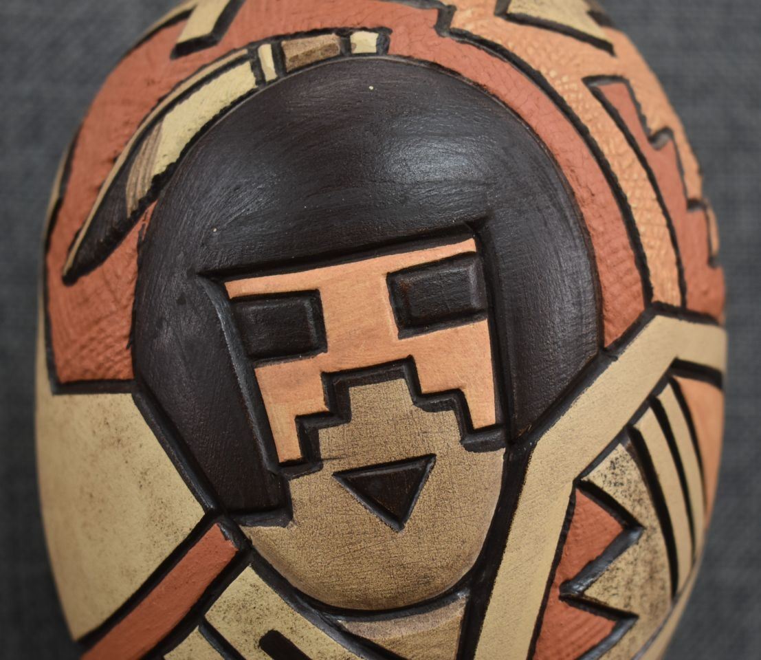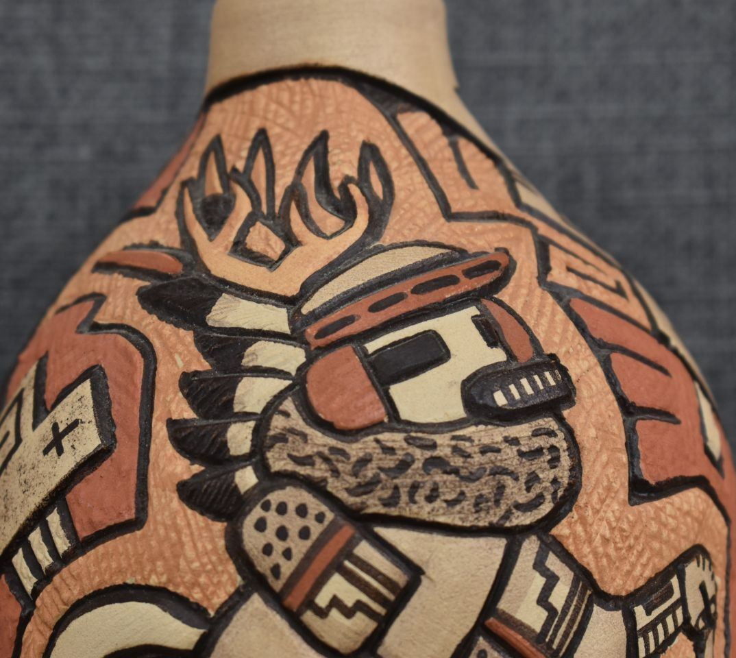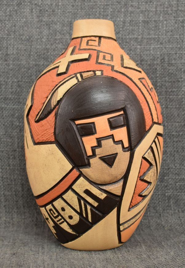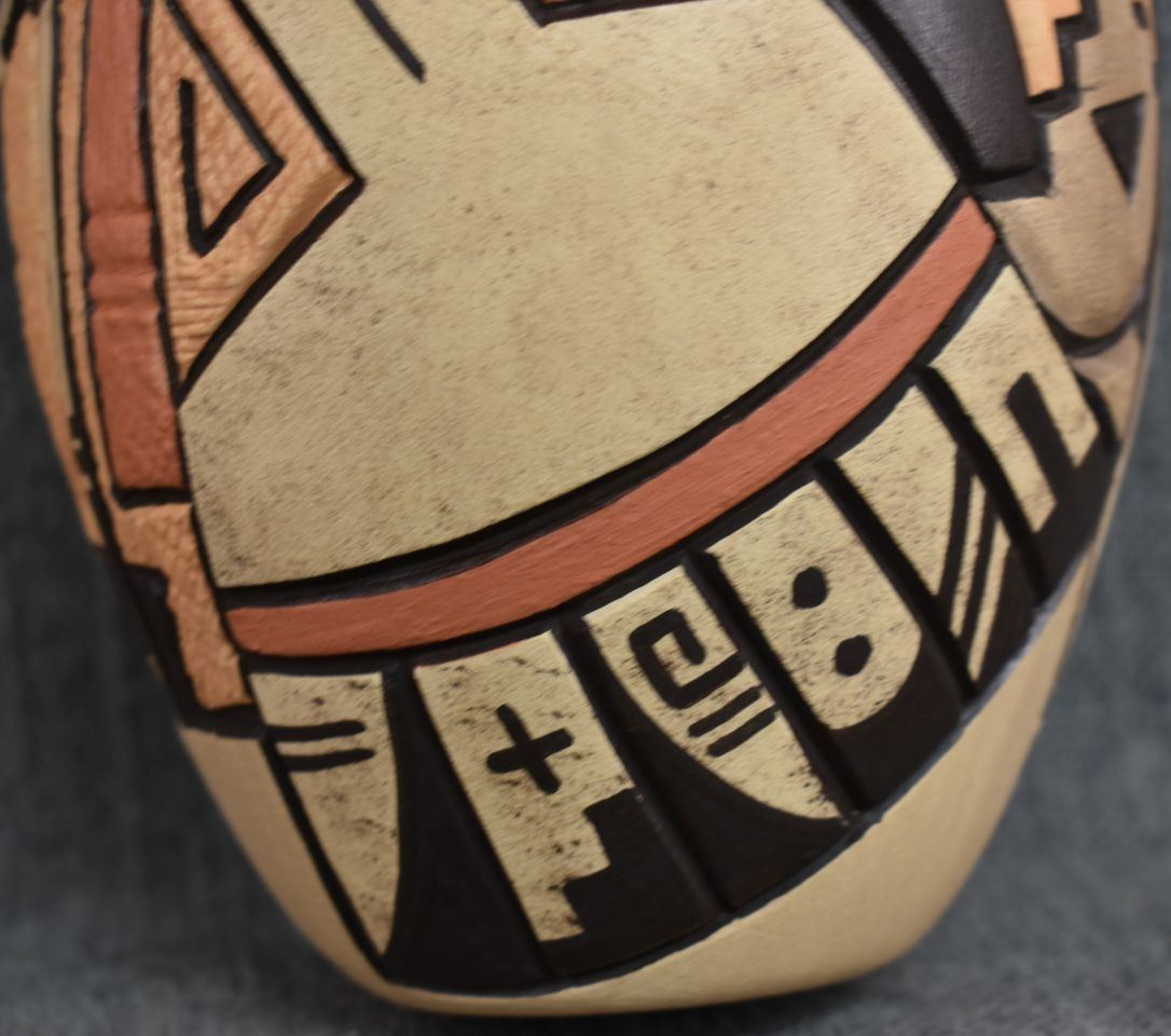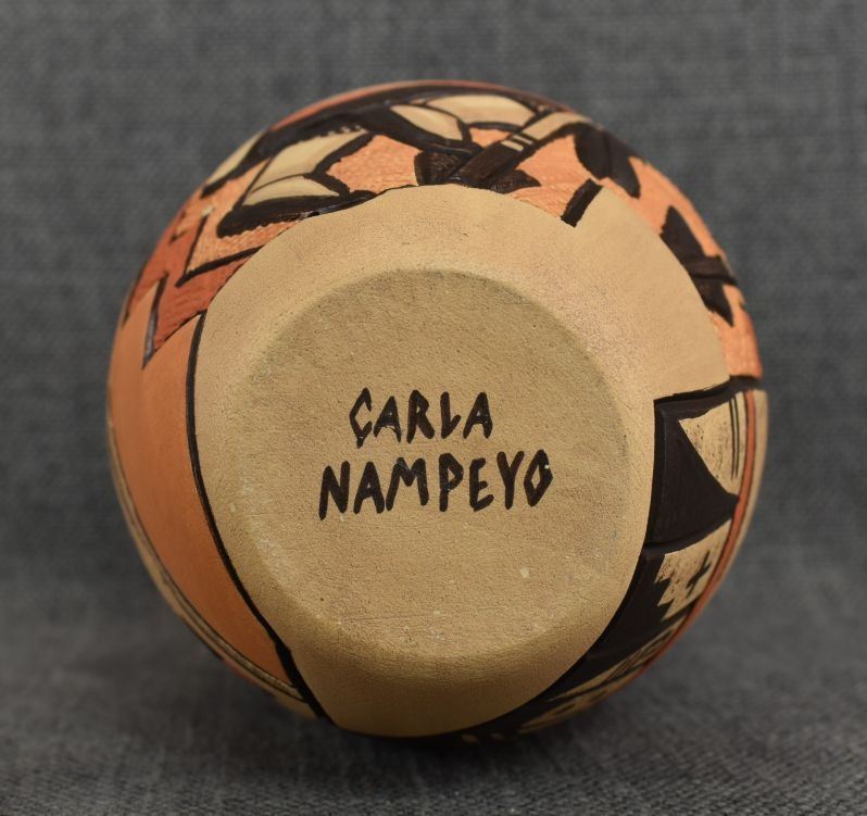 1980-90's Hopi, hand coiled with carved and painted kachina figure and geometric design by Carla Nampeyo 7.75" x 4.5"