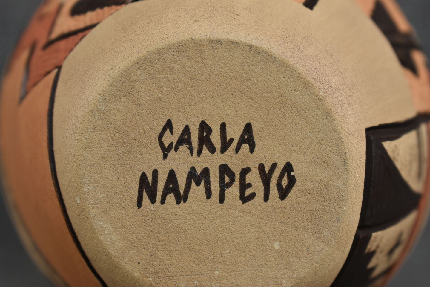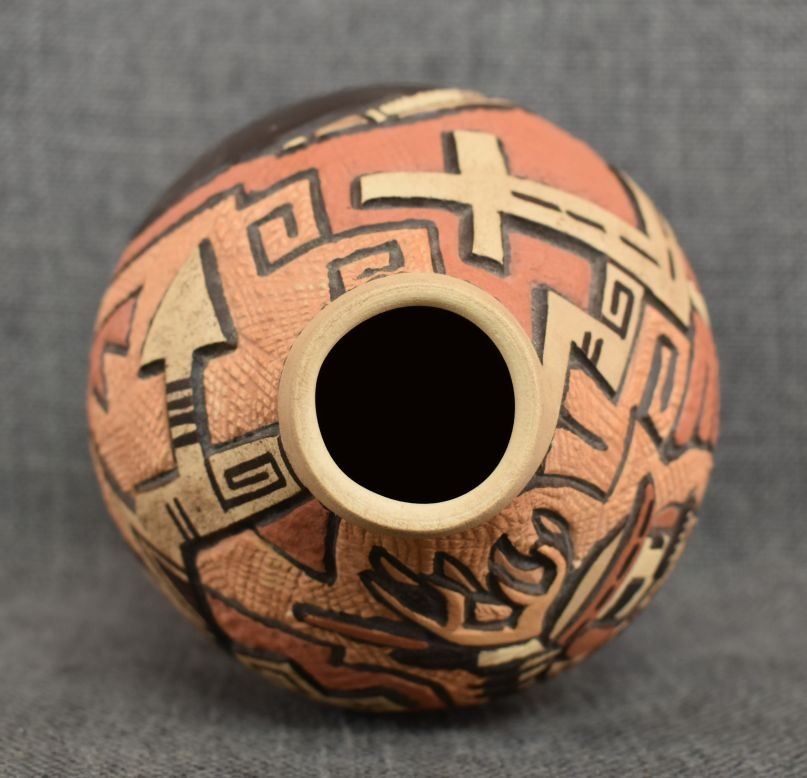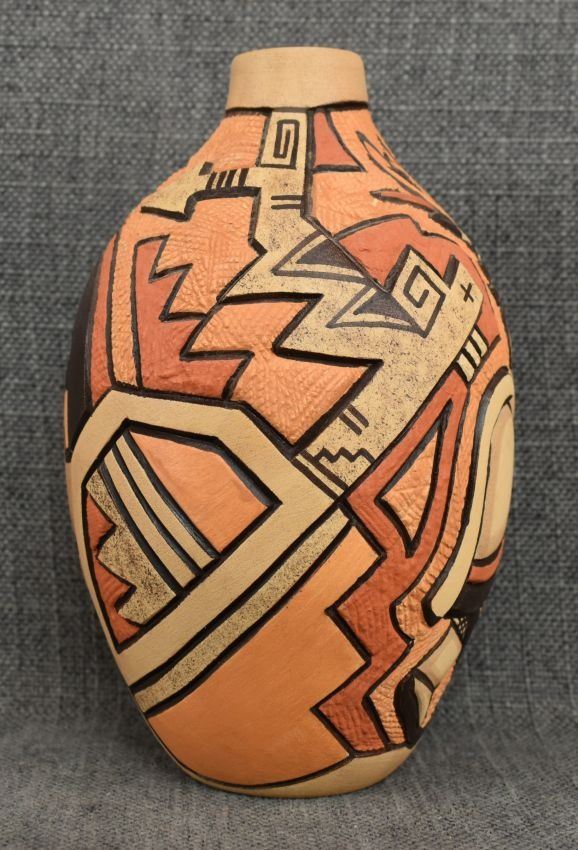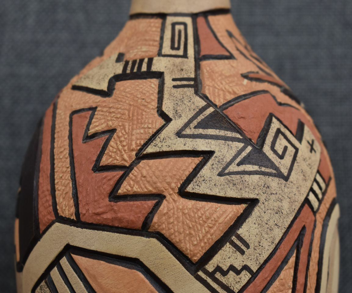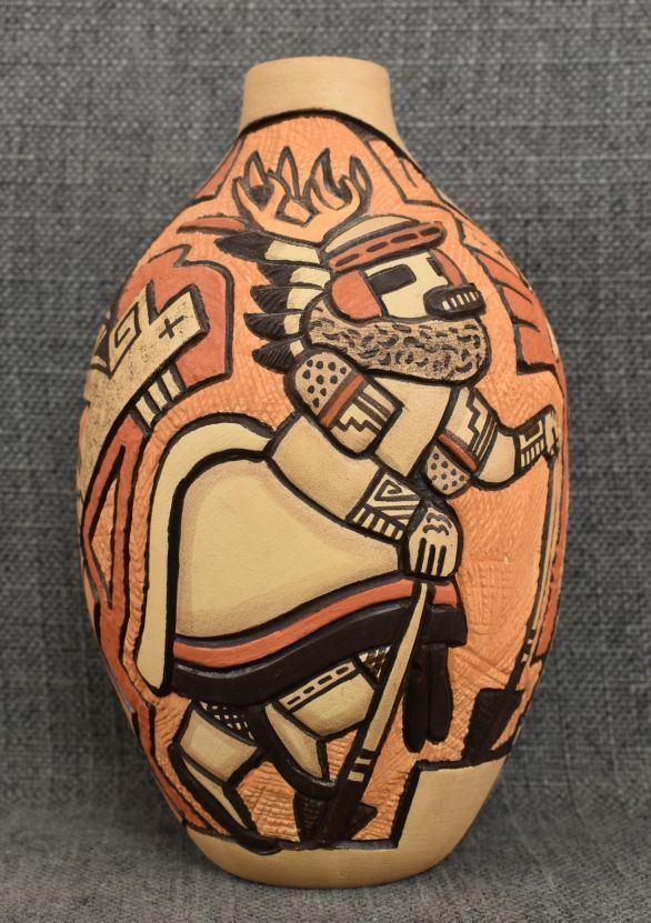 1980-90's Hopi, hand coiled with carved and painted kachina figure and geometric design by Carla Nampeyo 7.75" x 4.5"