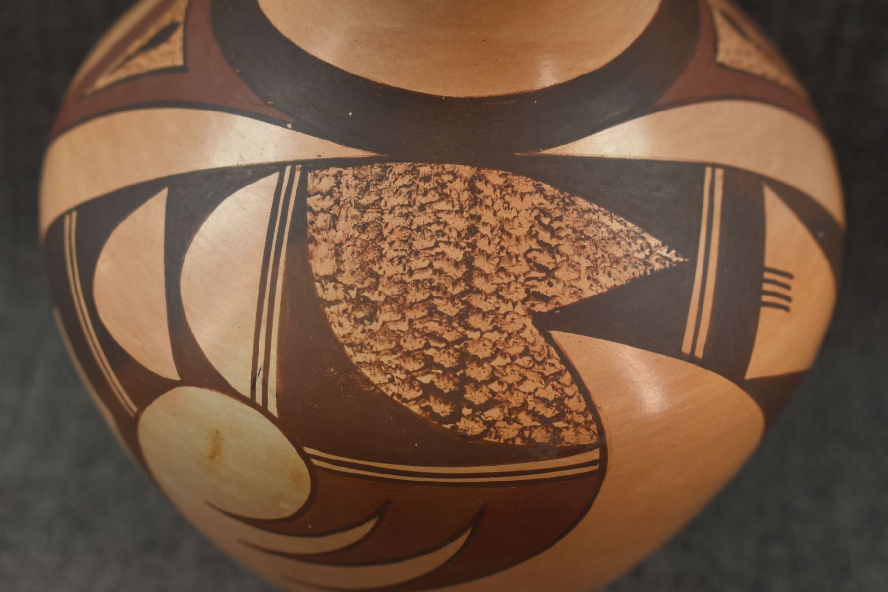 1980's Hopi . Hand coiled and painted polychrome design pottery vase. Signed White Swan. 5'' x 4.5''