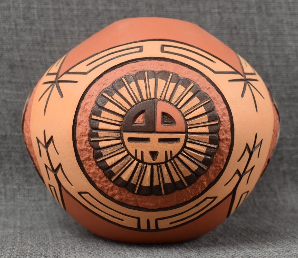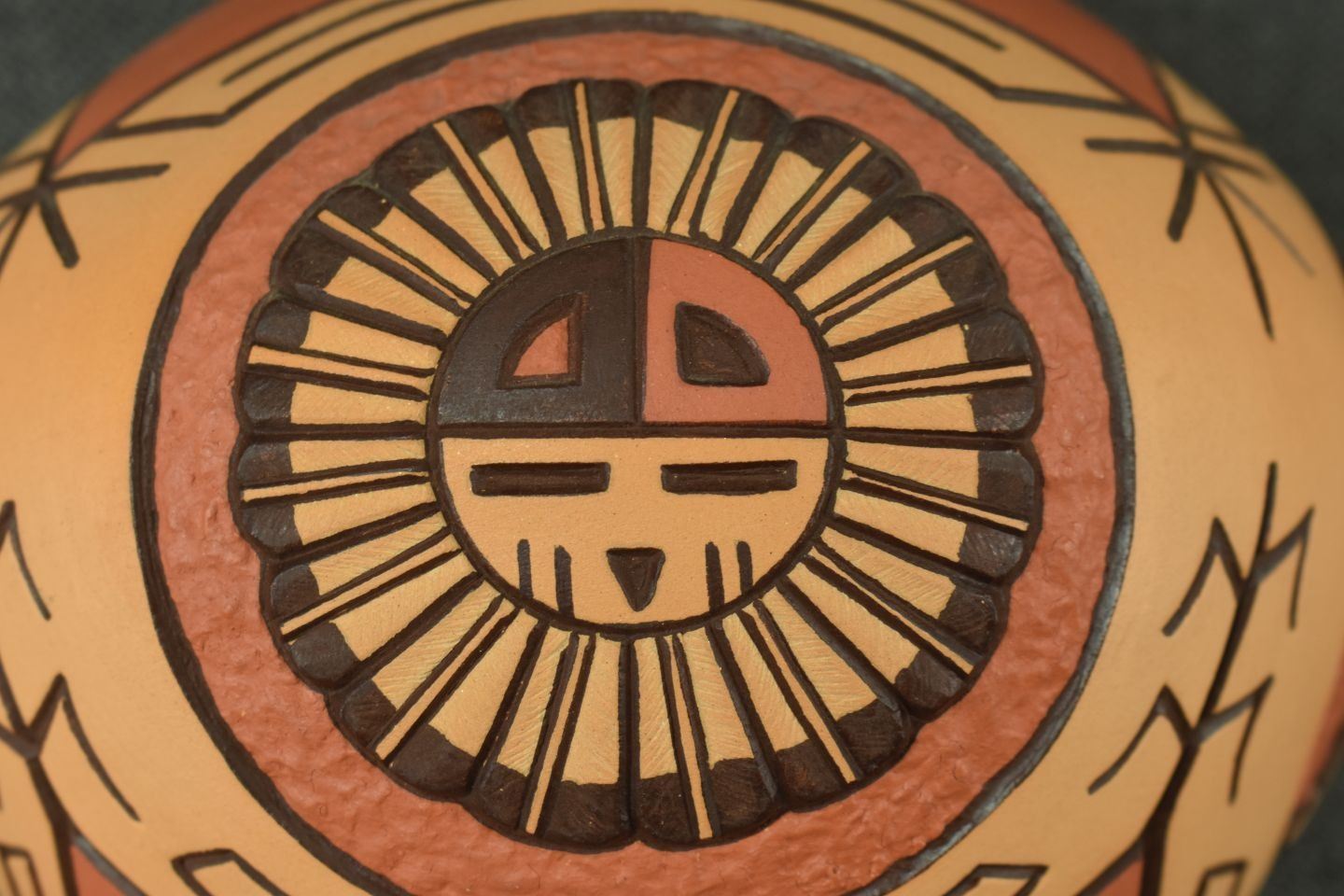 1990's Hopi, hand coiled with carved and painted flute player and sun face design by Elson Seckletstewa 5.5" x 6.5"