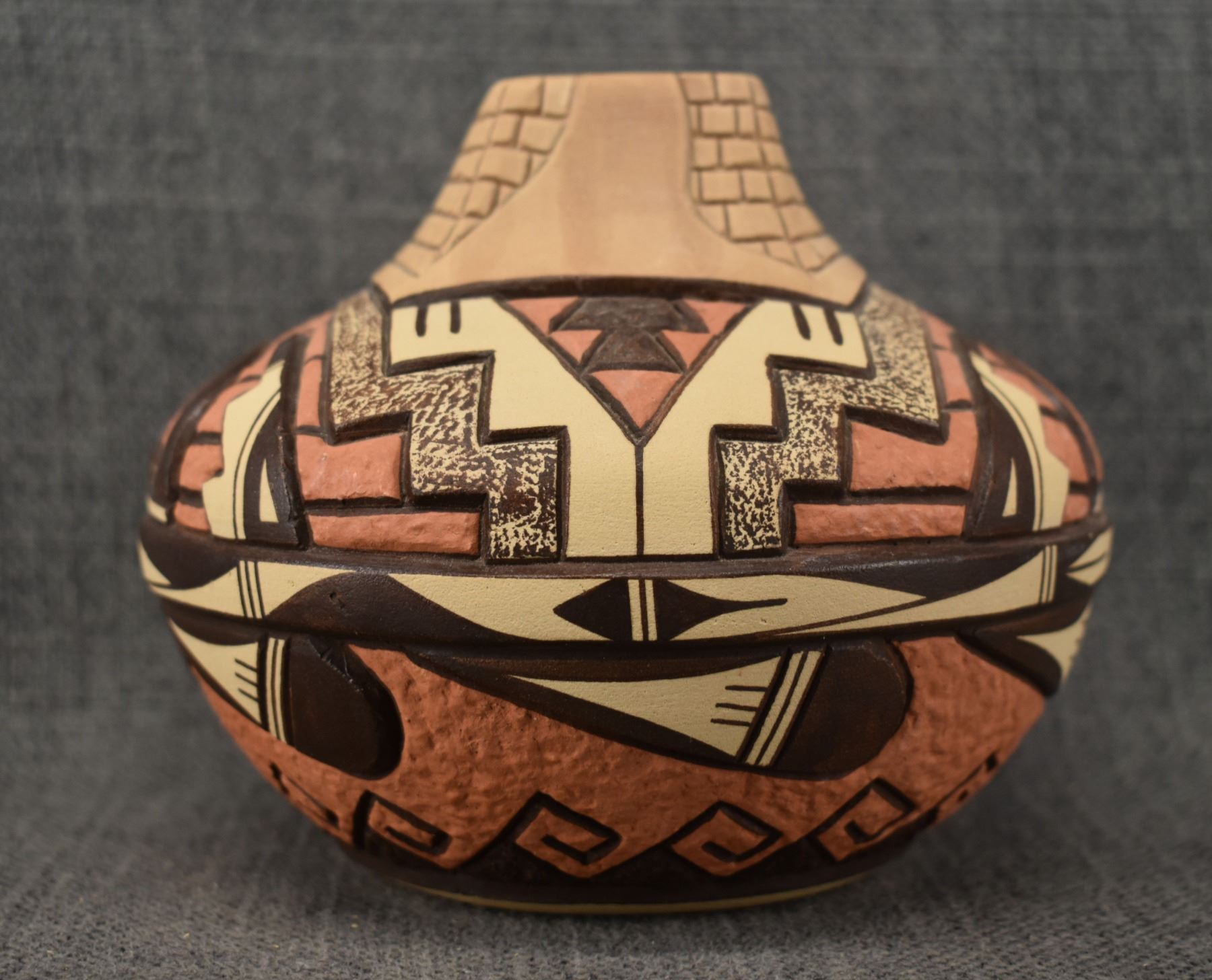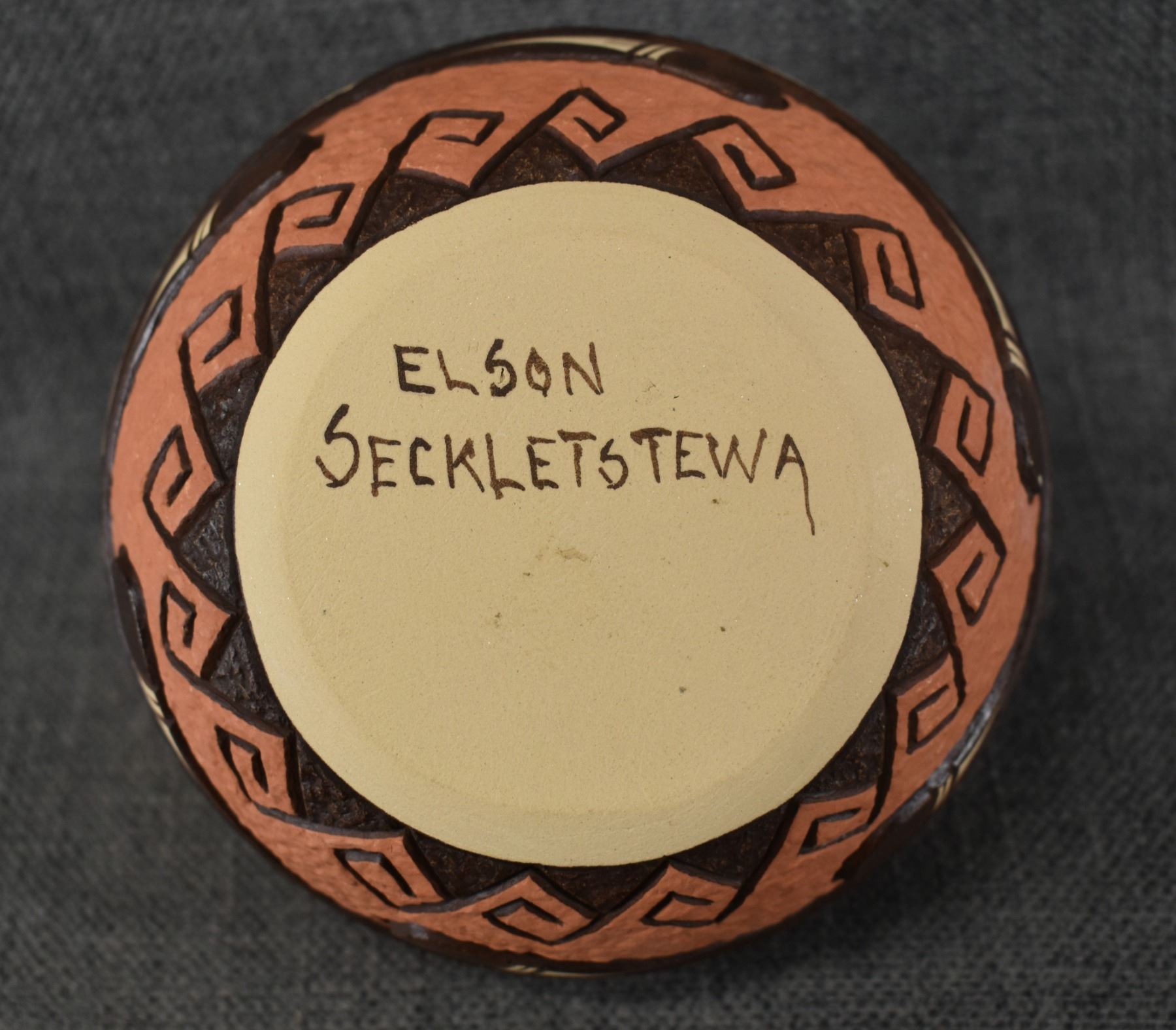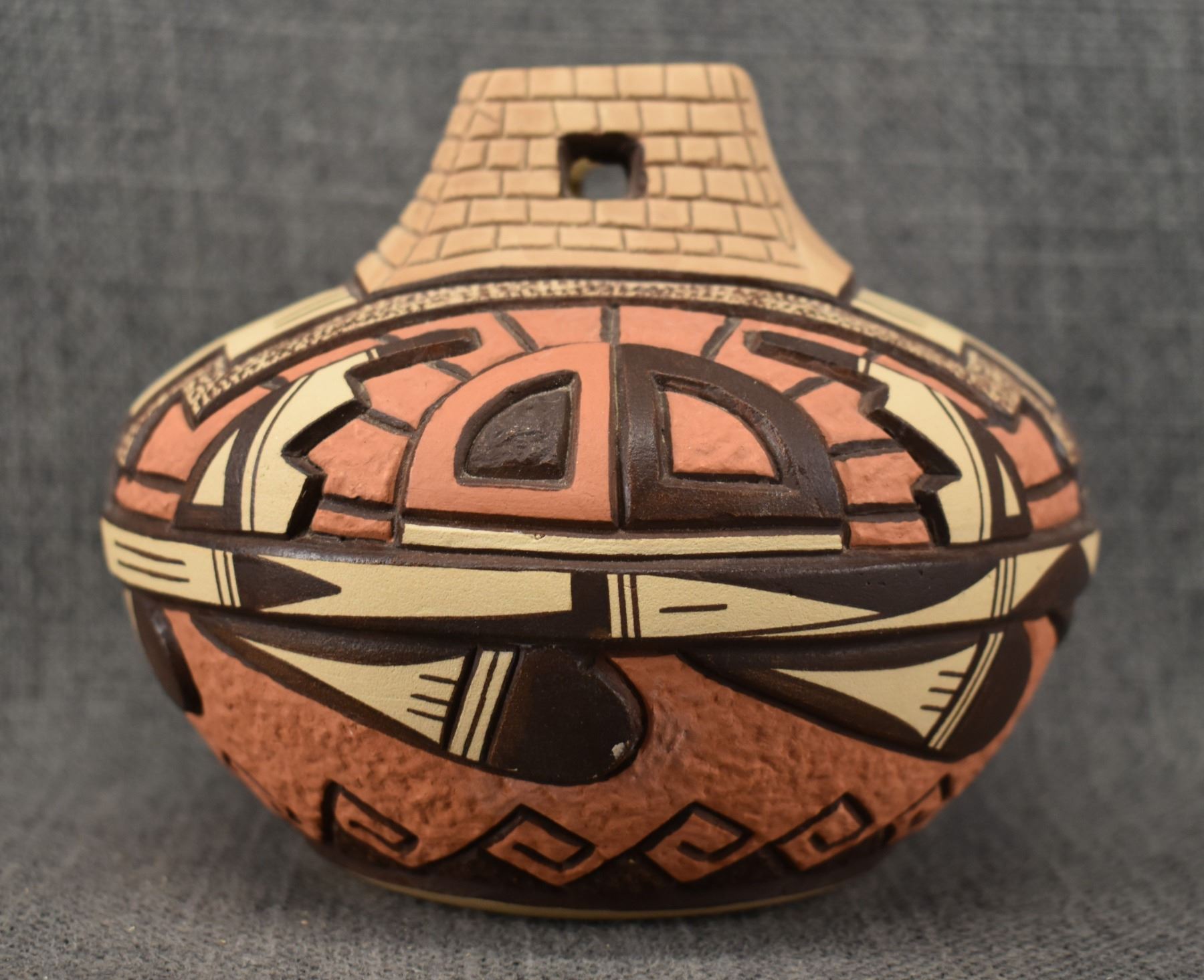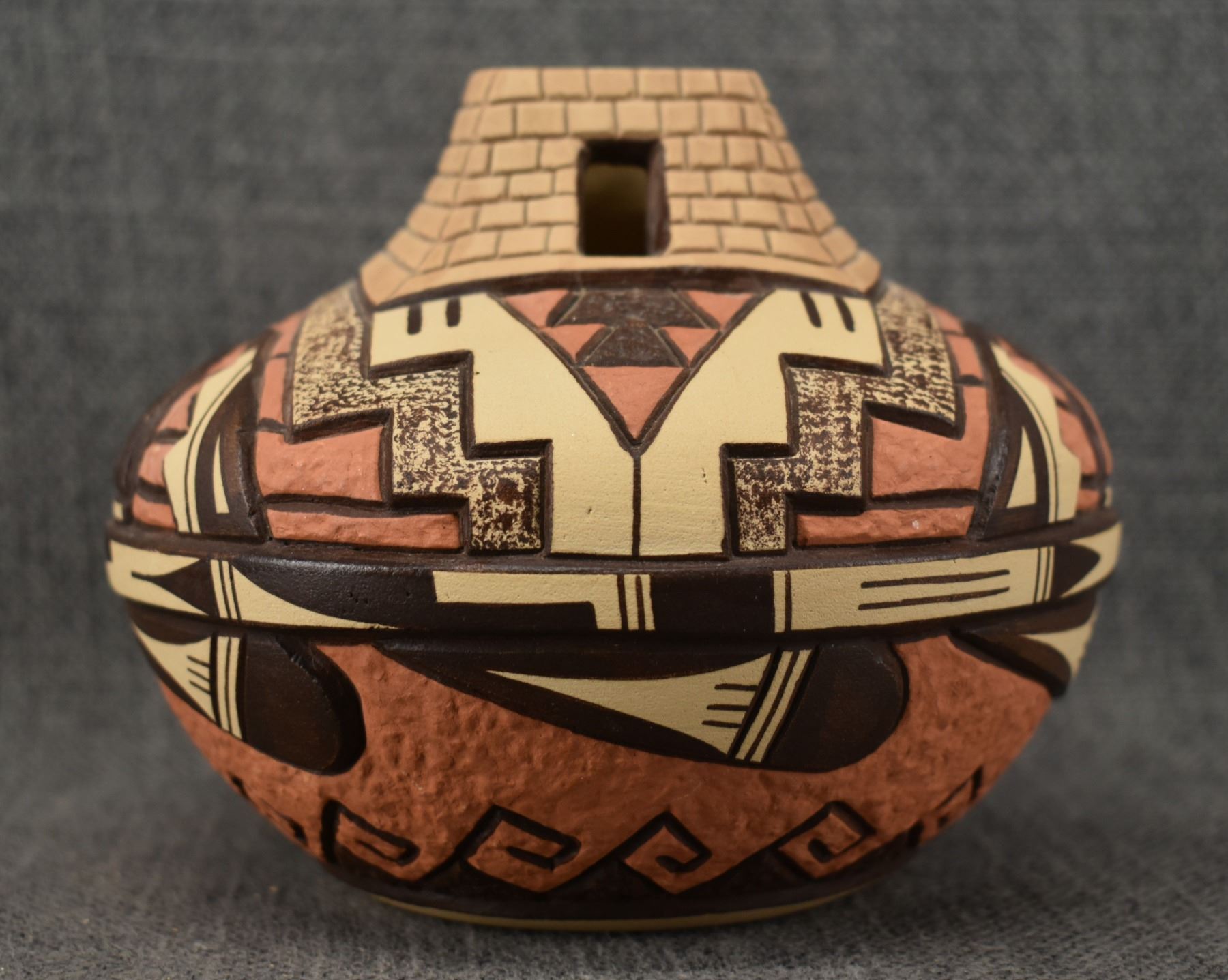 1990's Hopi, hand coiled with carved and painted design by Elson Seckletstewa 4.5" x 5.5"