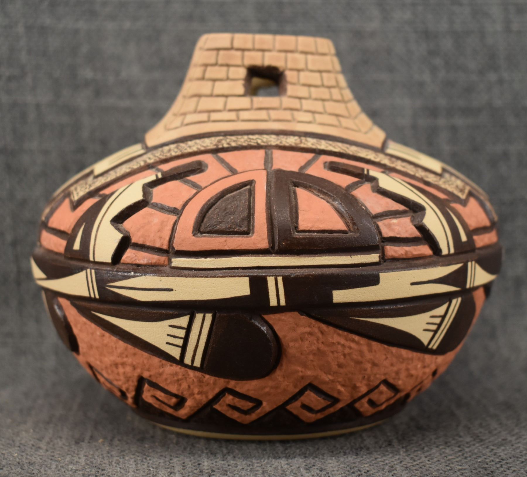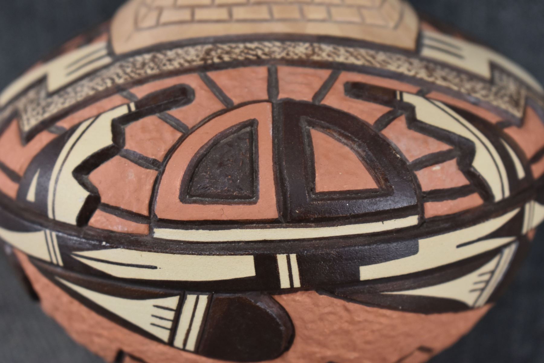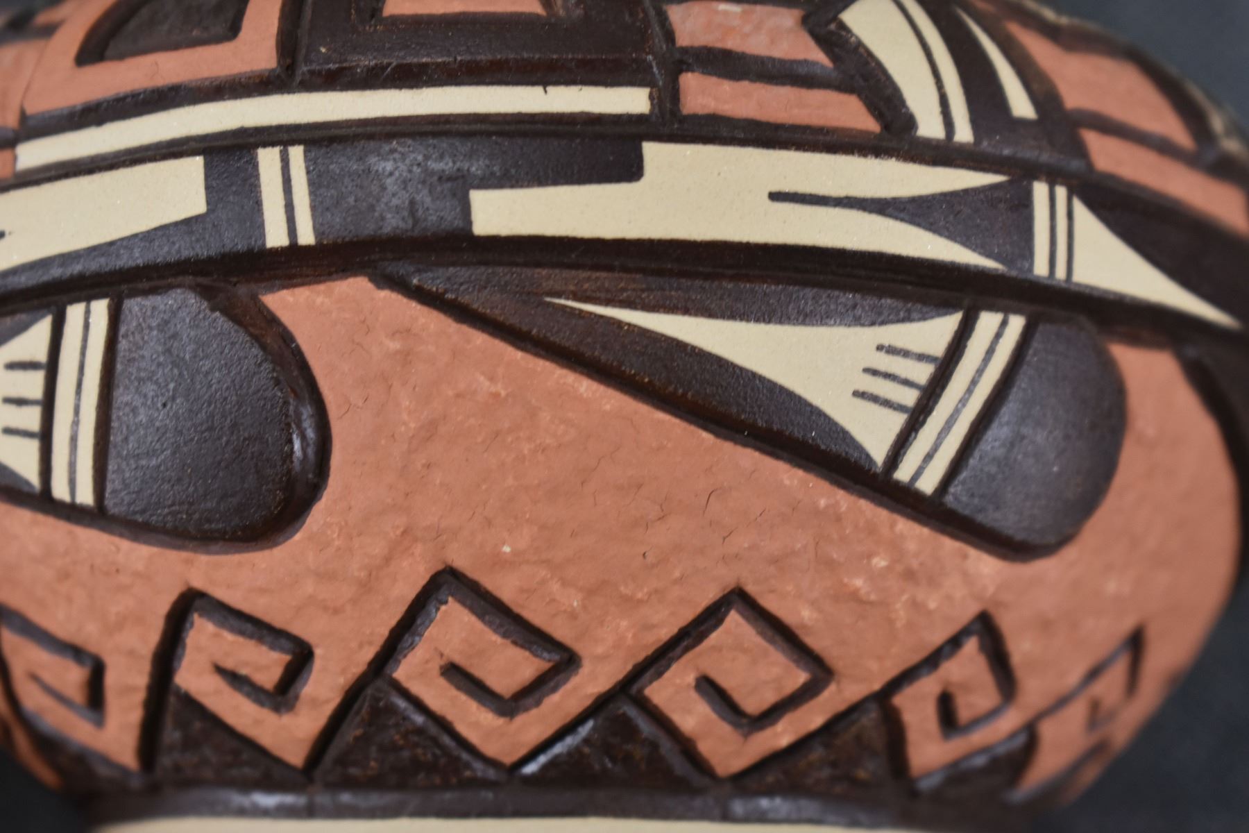 1990's Hopi, hand coiled with carved and painted design by Elson Seckletstewa 4.5" x 5.5"