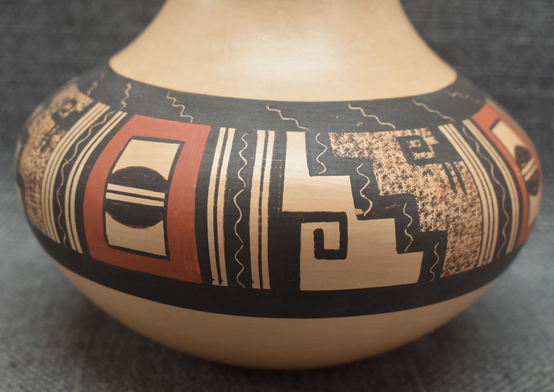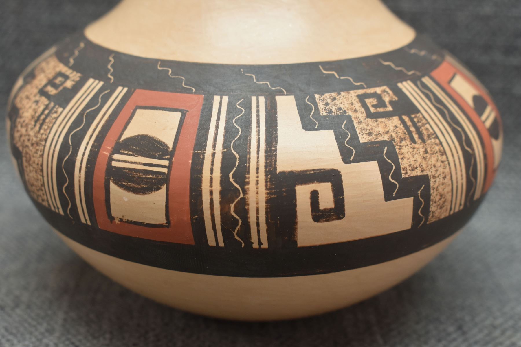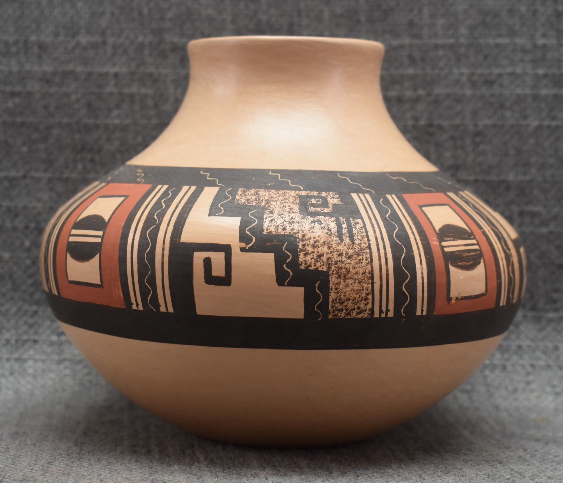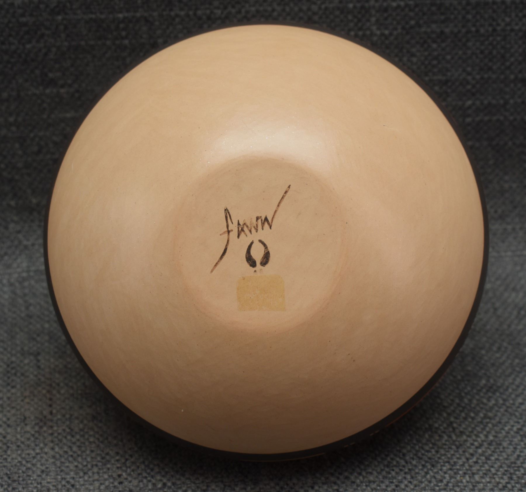 1980's Hopi. Hand coiled and painted polychrome design pottery vase signed Fawn. 5'' x 5''
