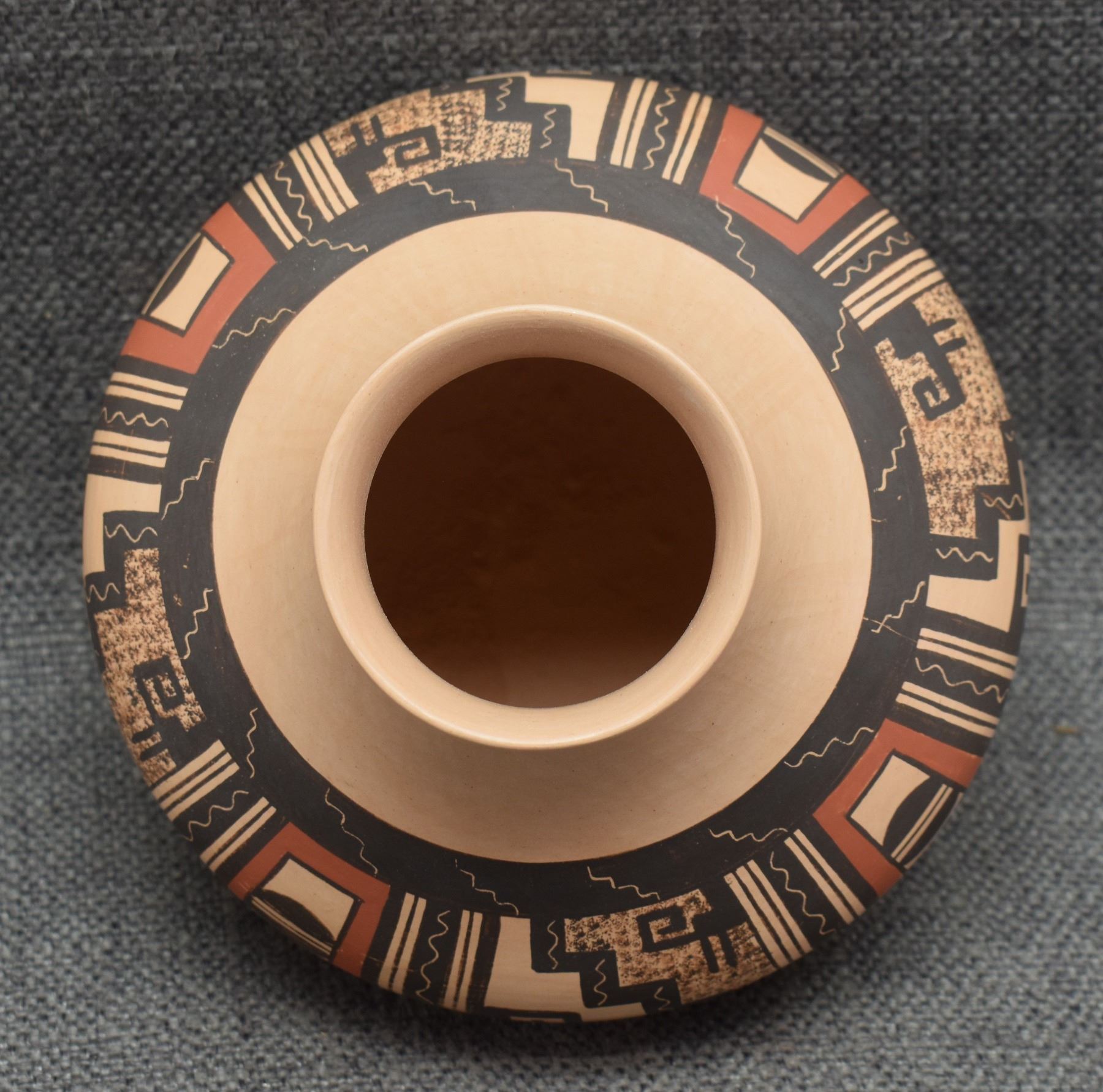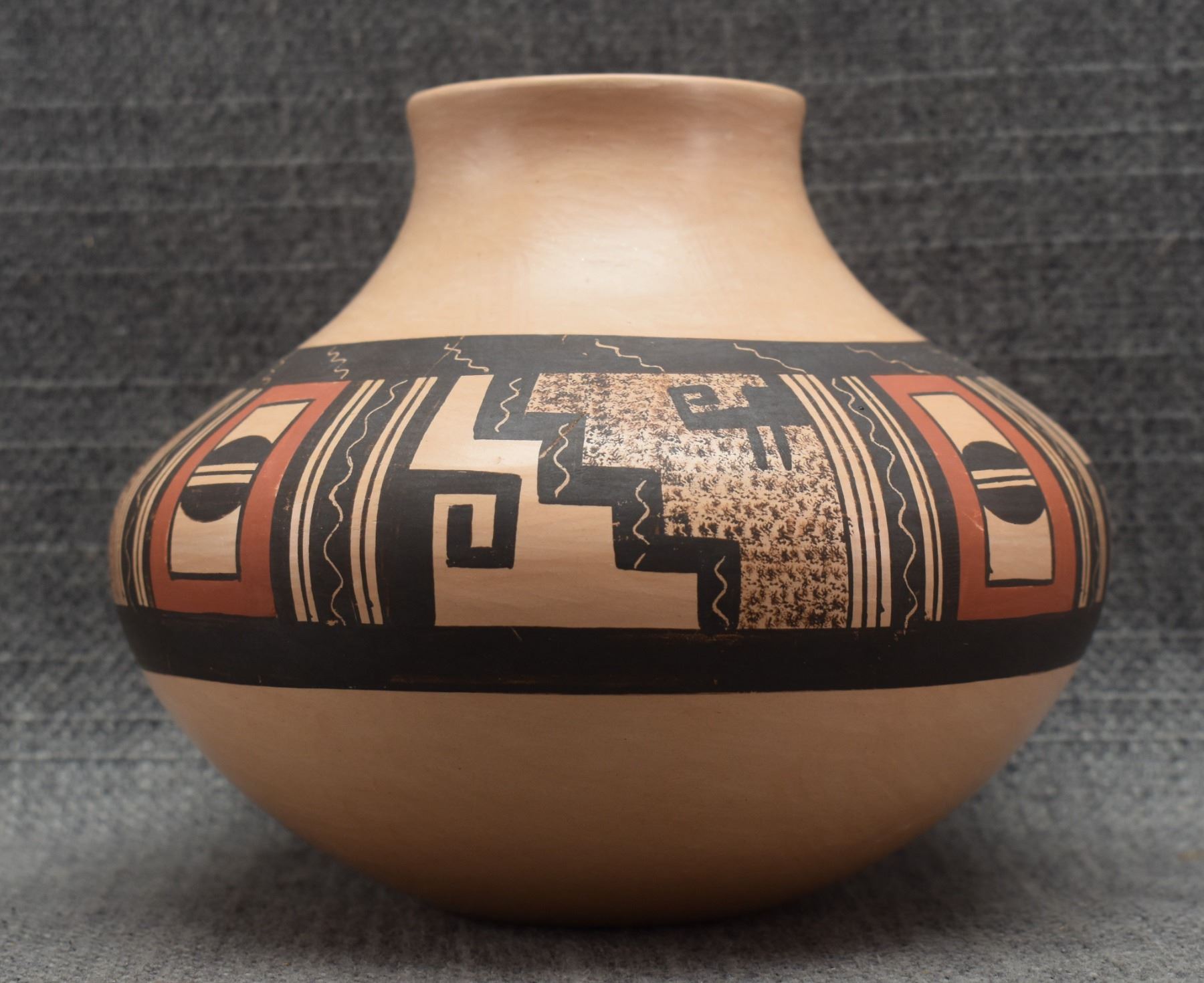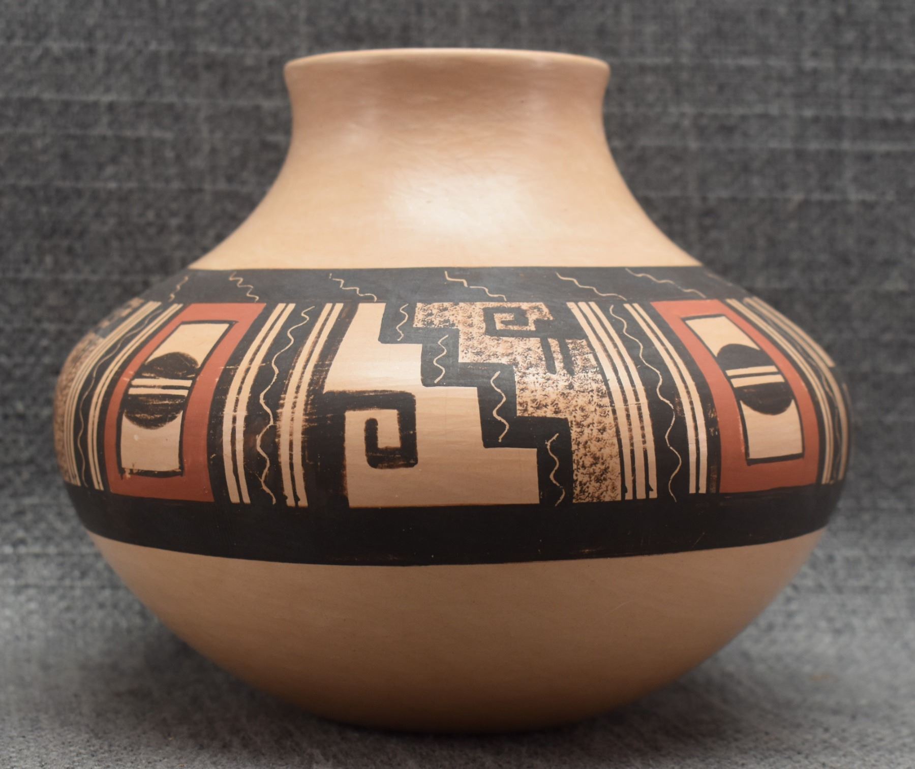 1980's Hopi. Hand coiled and painted polychrome design pottery vase signed Fawn. 5'' x 5''