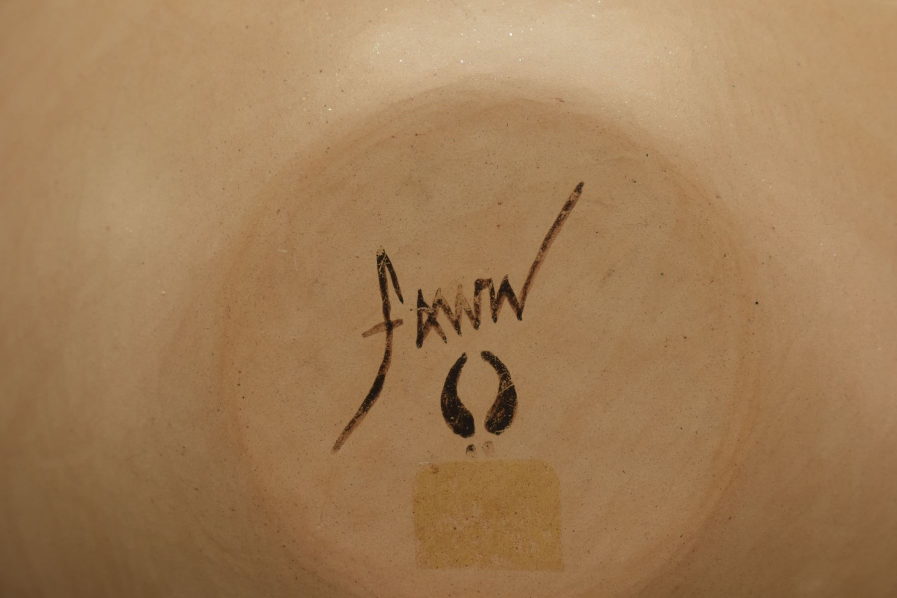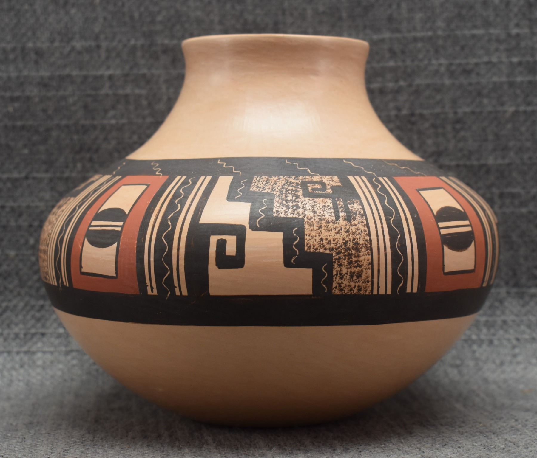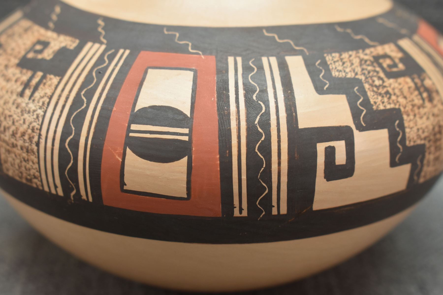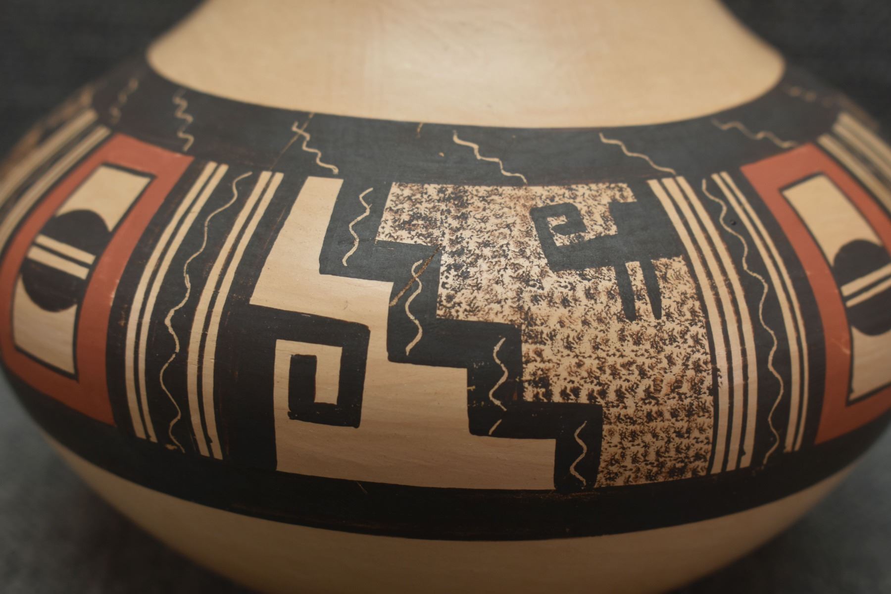 1980's Hopi. Hand coiled and painted polychrome design pottery vase signed Fawn. 5'' x 5''