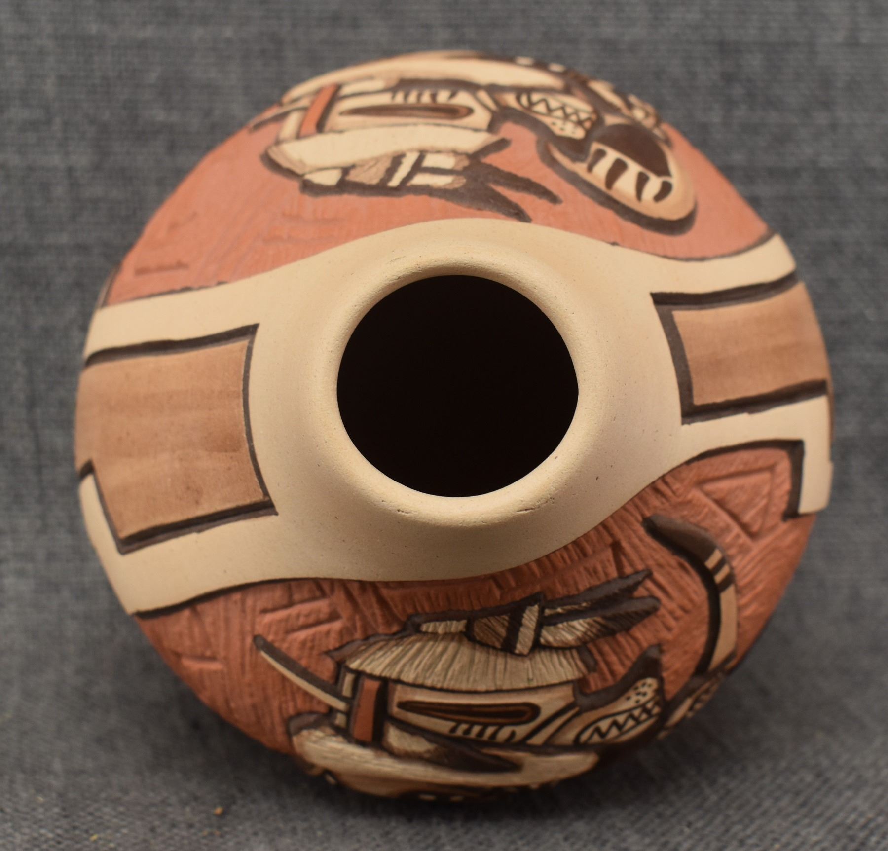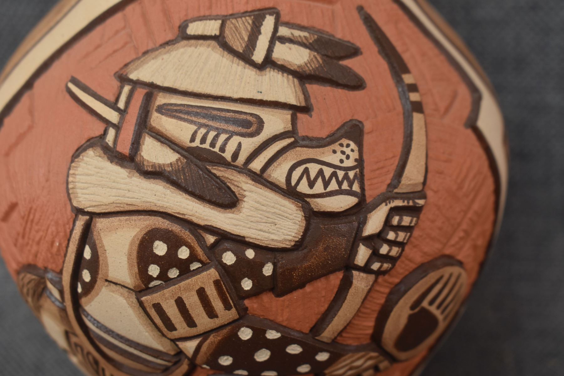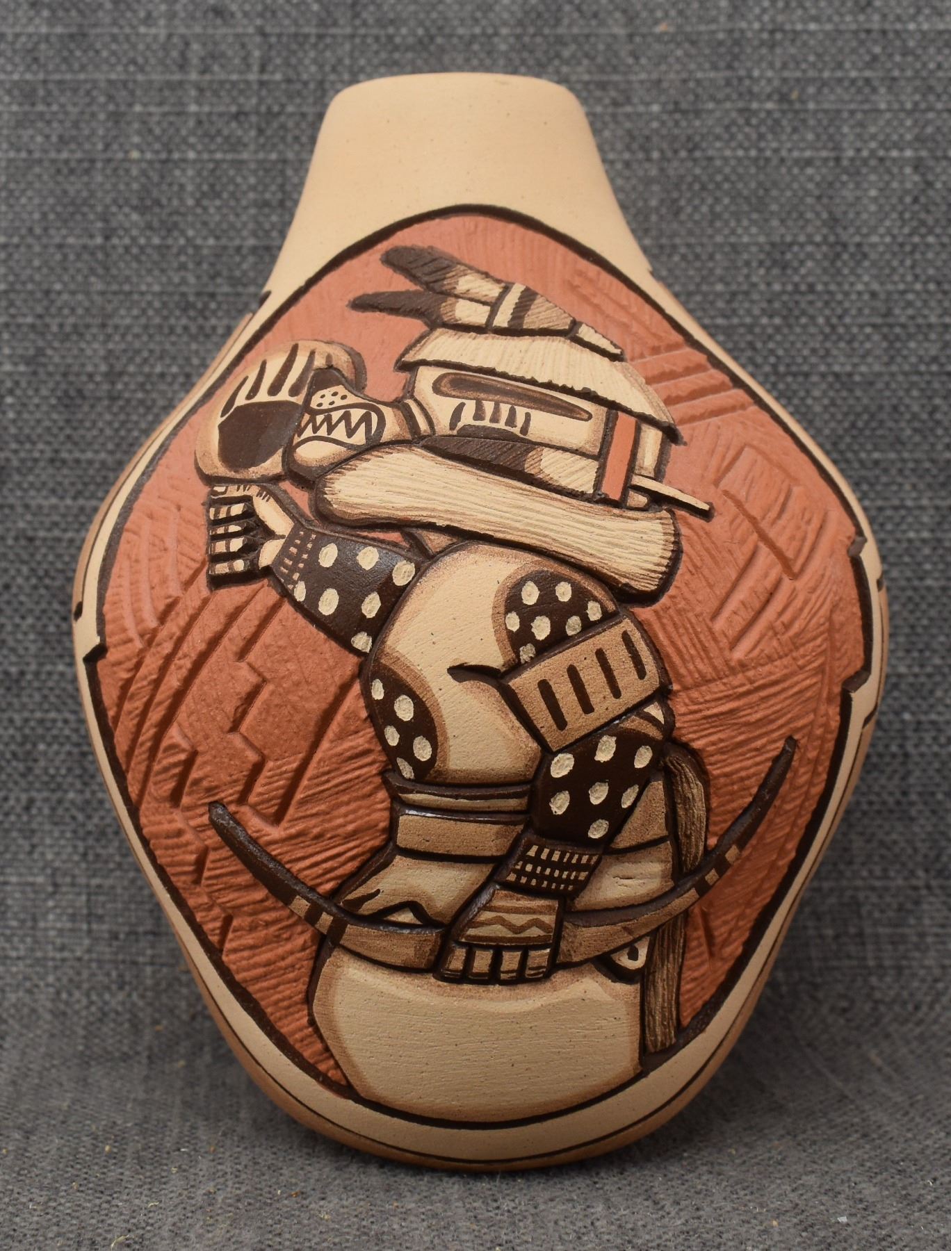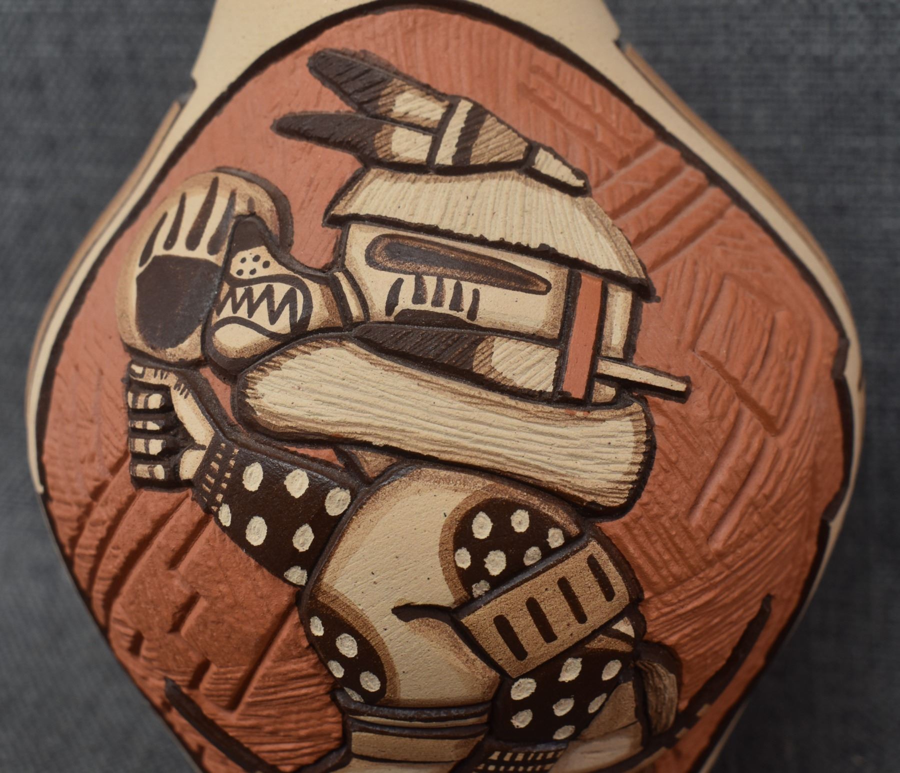 1990's Hopi. Hand coiled painted and carved design depicting kachinas. Signed Marty and Elvira Naha. 7.5'' x 5.5''