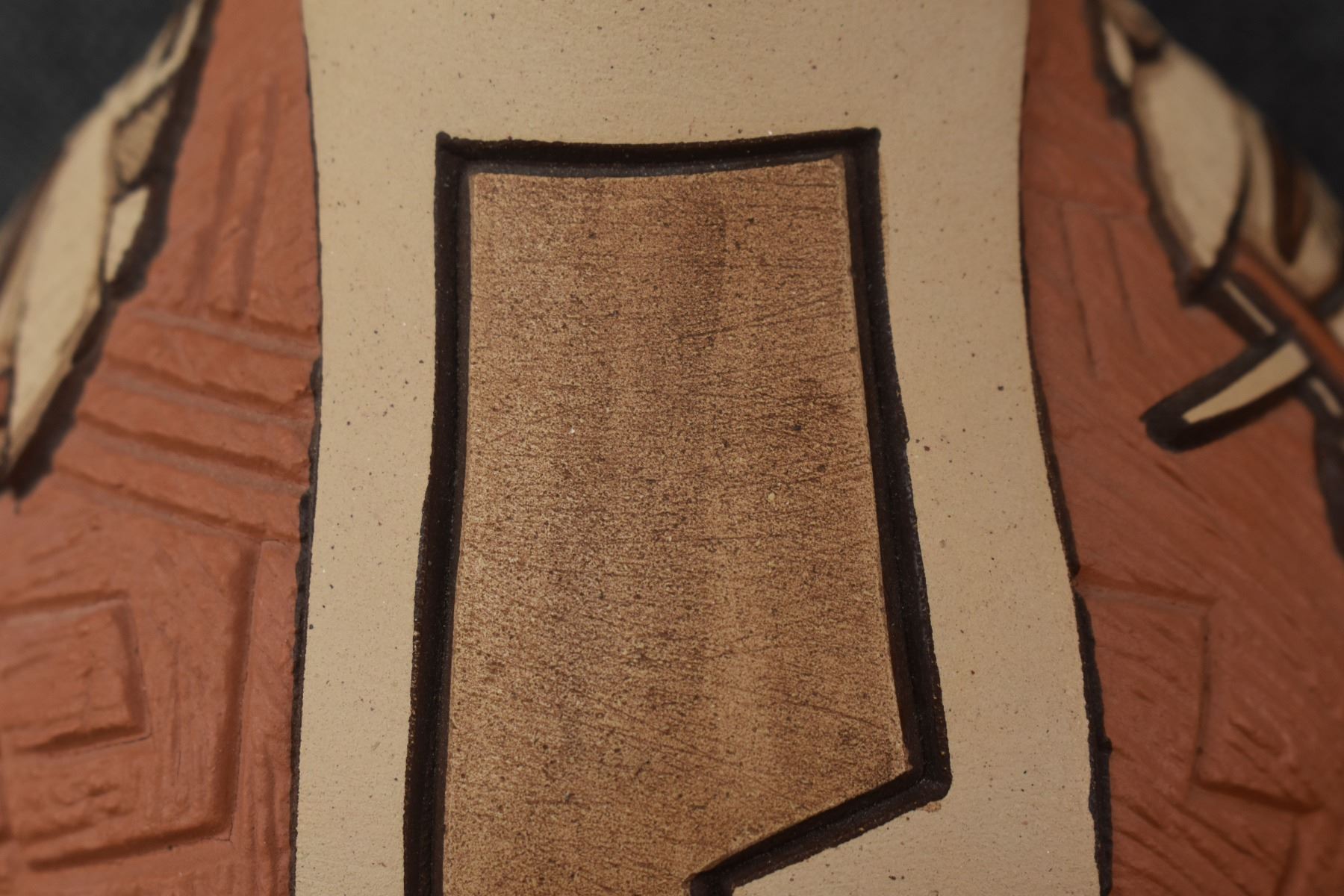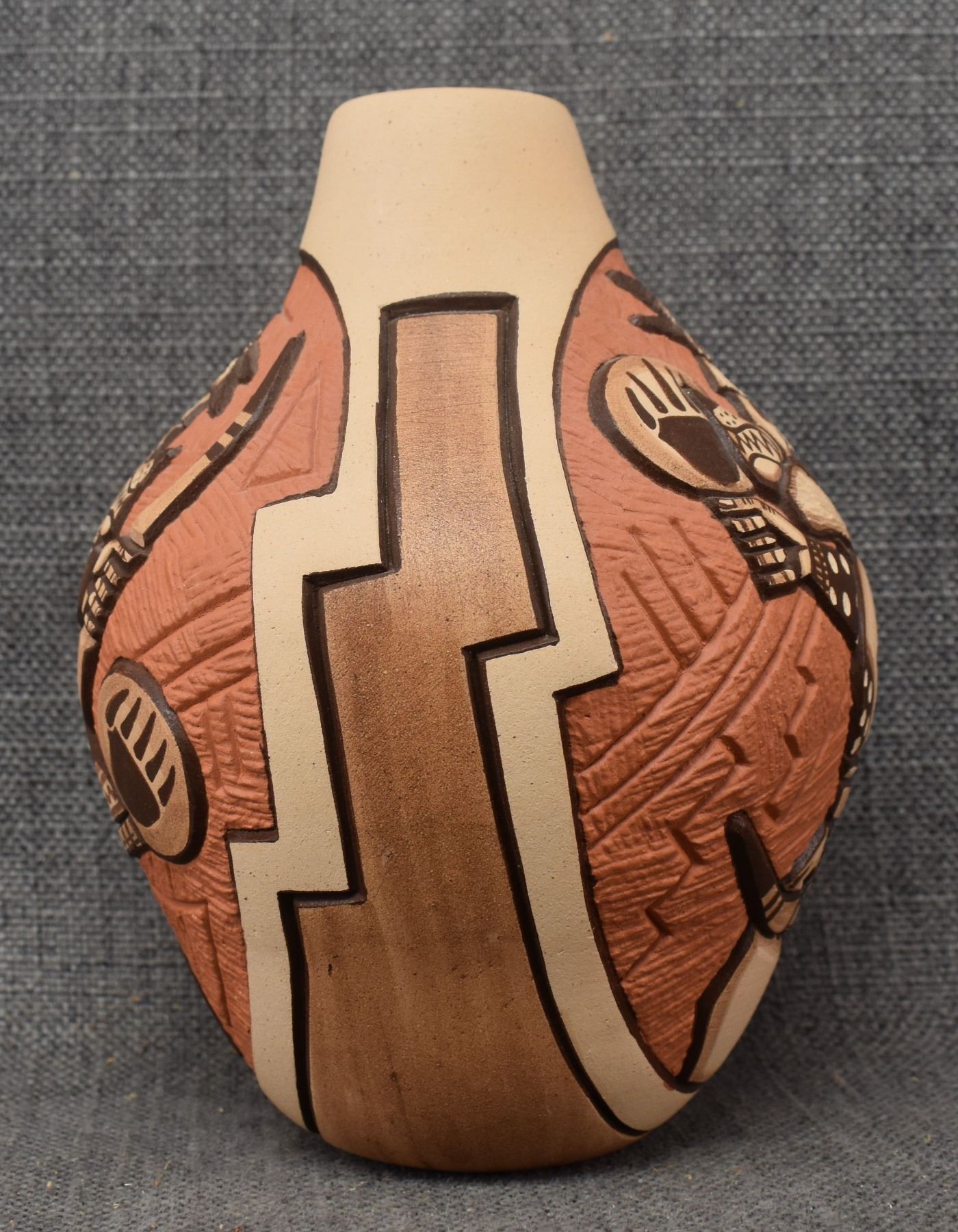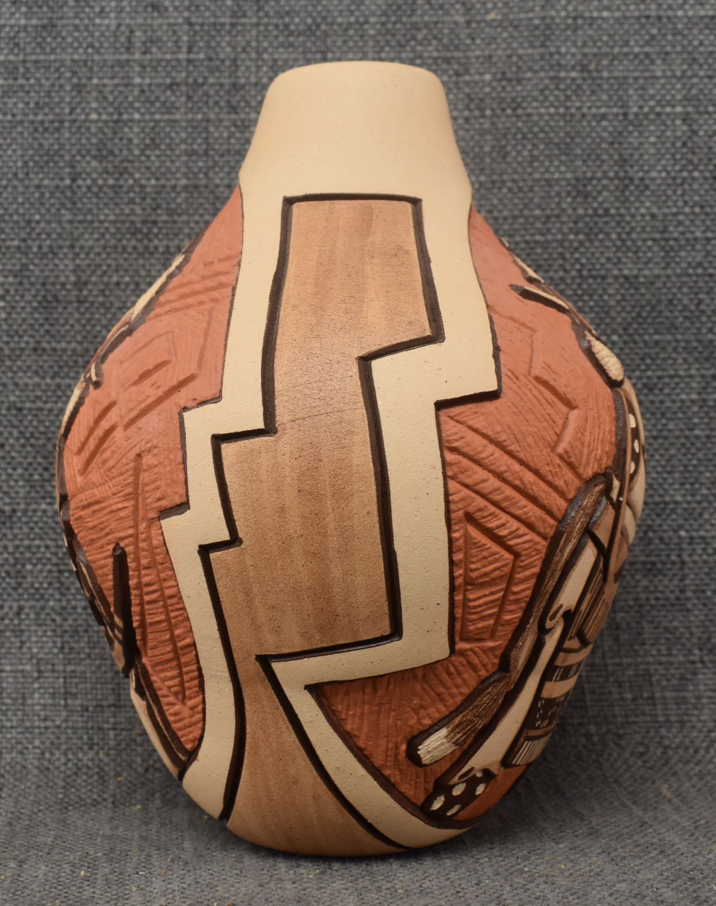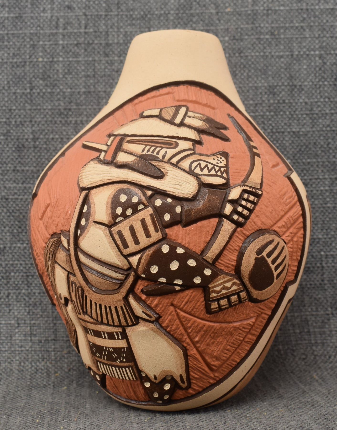 1990's Hopi. Hand coiled painted and carved design depicting kachinas. Signed Marty and Elvira Naha. 7.5'' x 5.5''