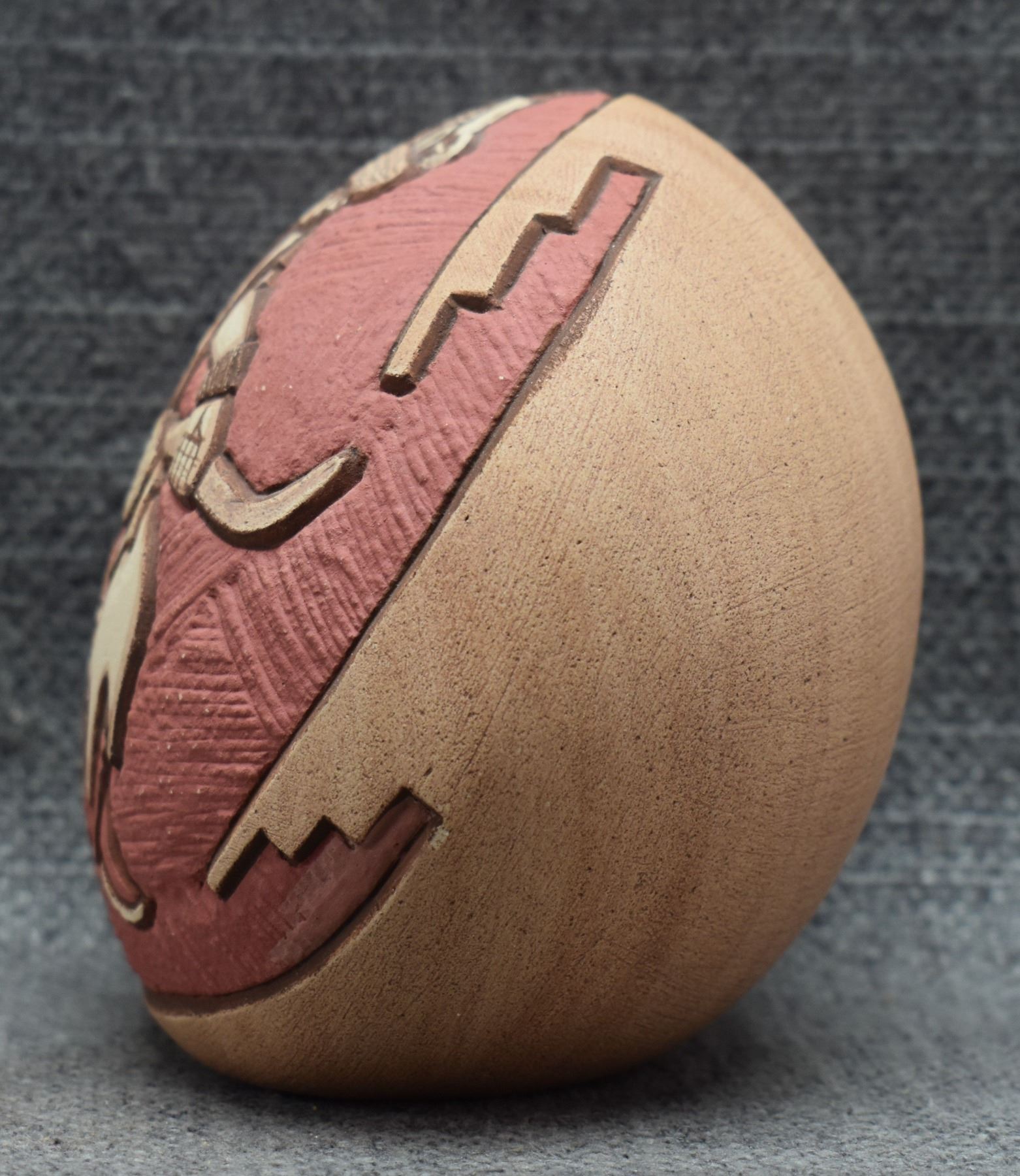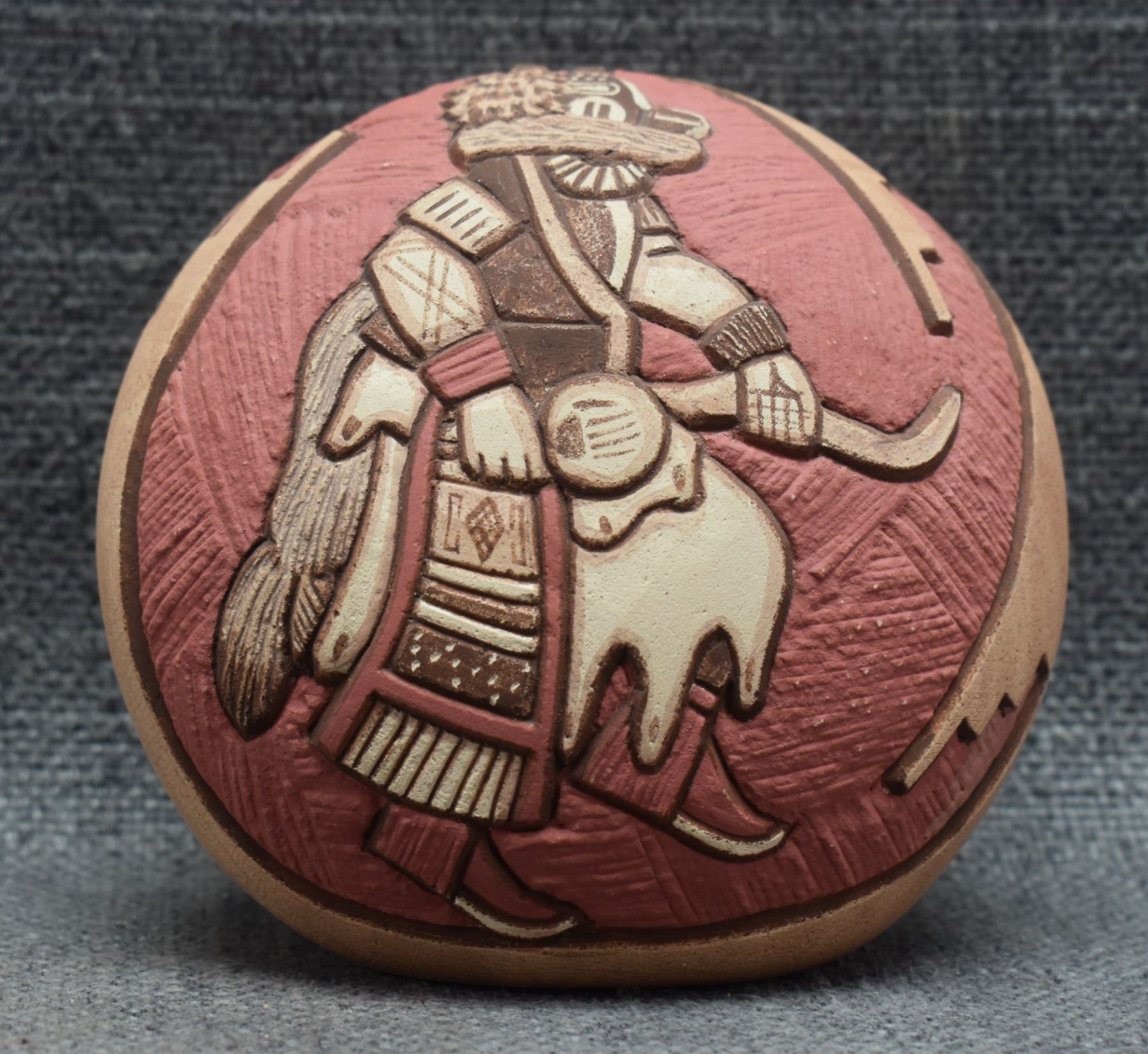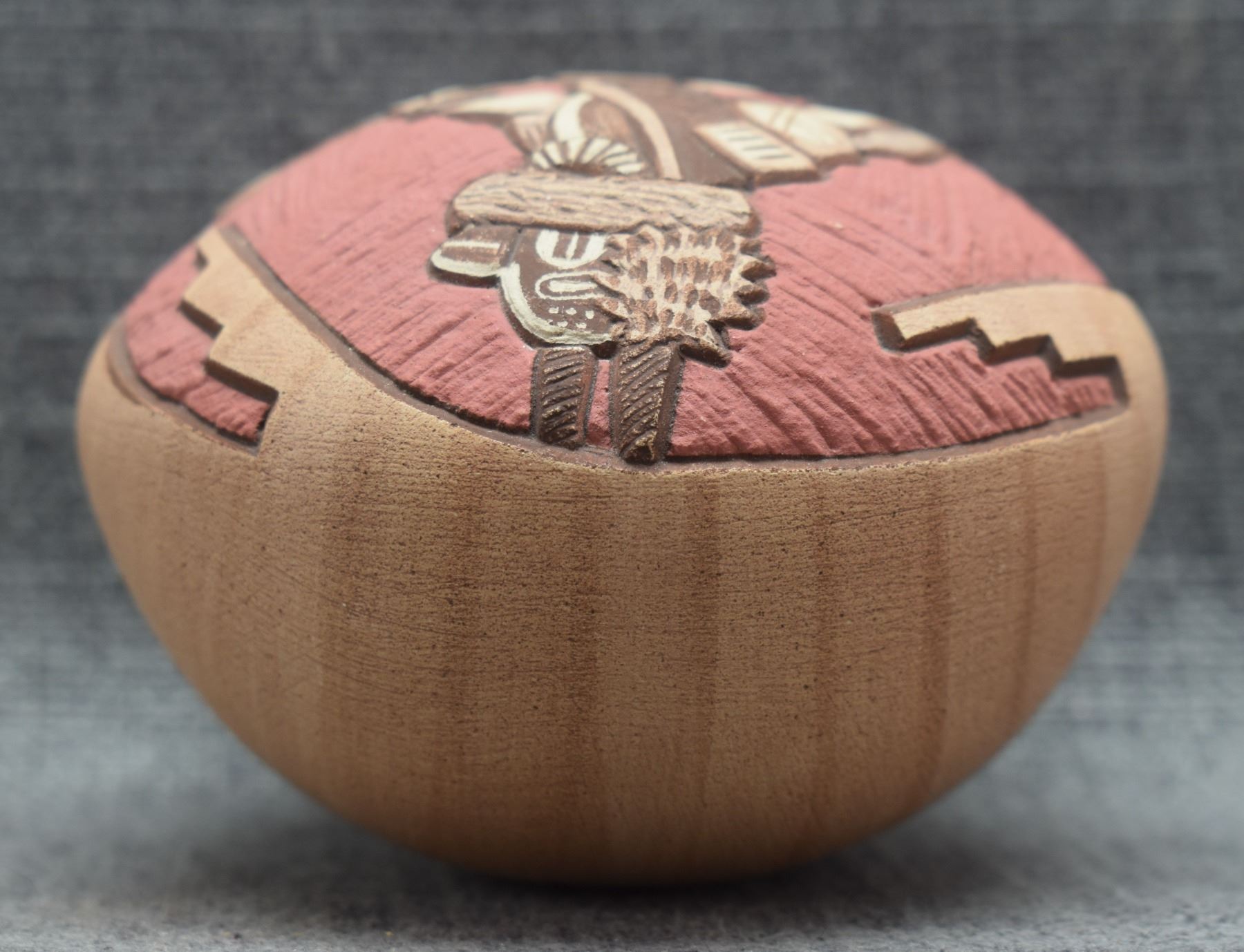 1992 Hopi, hand coiled with carved and painted wolf kachina signed Marty and Elvira Nampeyo. 3.5'' x 4'' x 3''