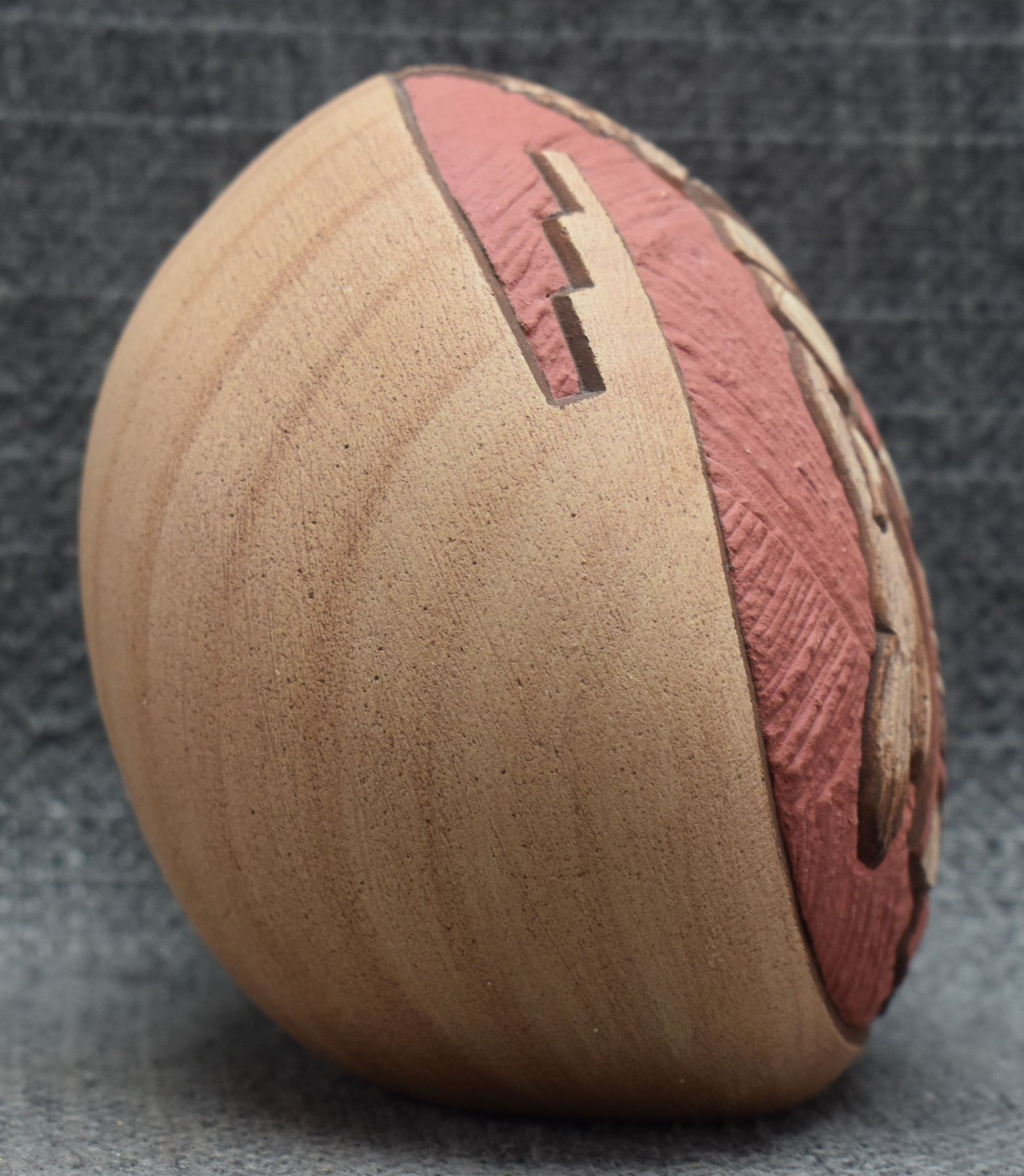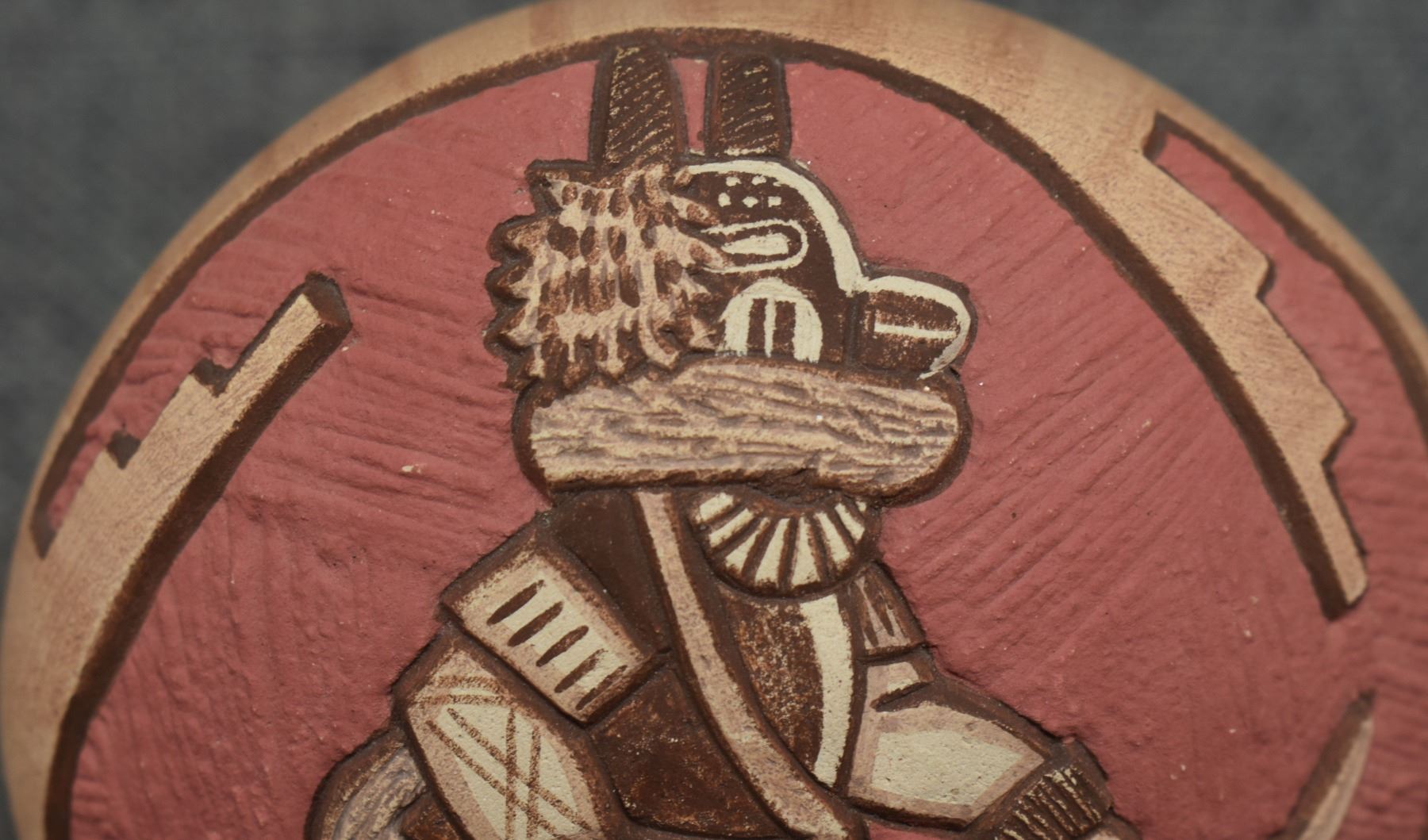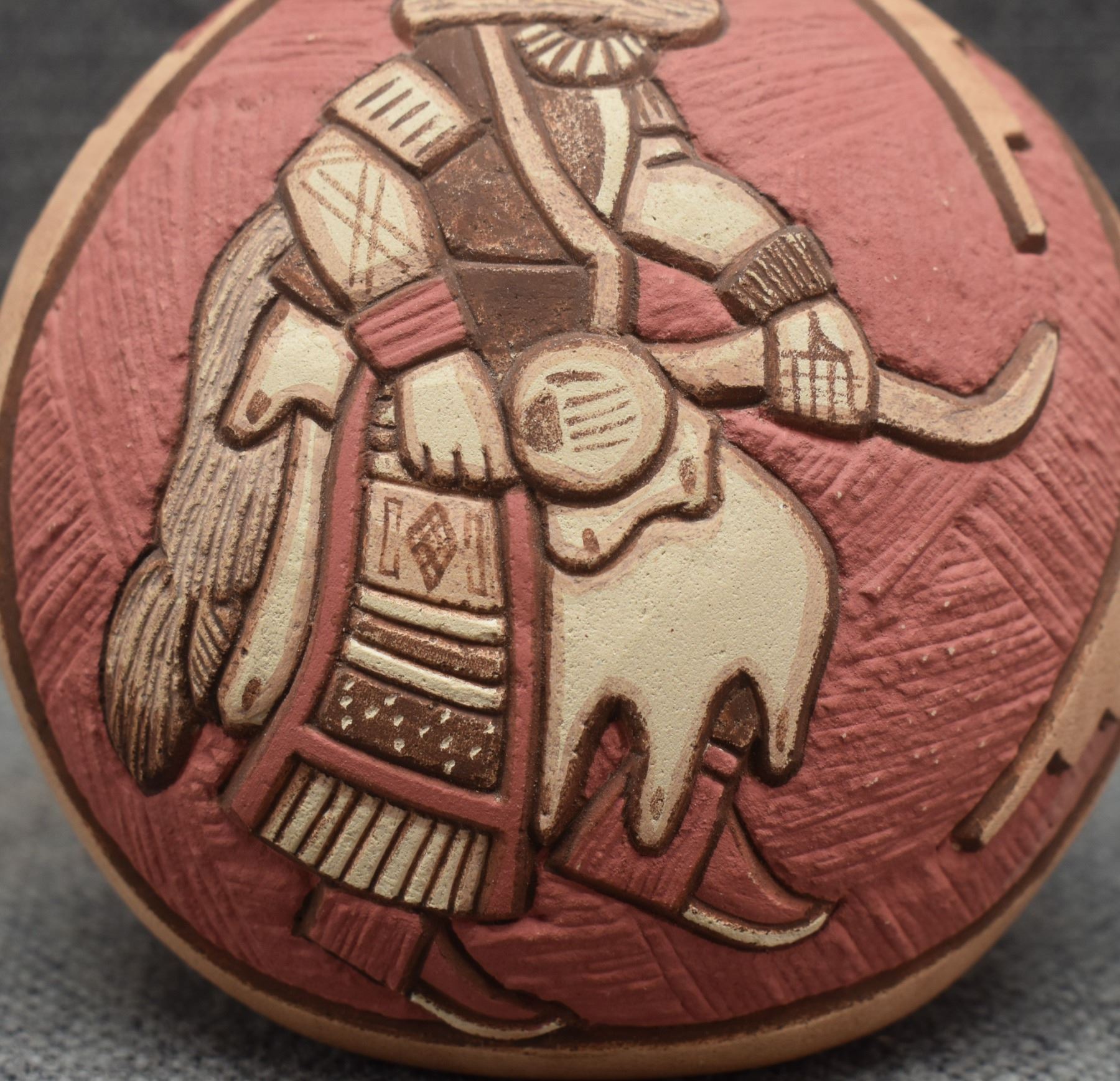 1992 Hopi, hand coiled with carved and painted wolf kachina signed Marty and Elvira Nampeyo. 3.5'' x 4'' x 3''