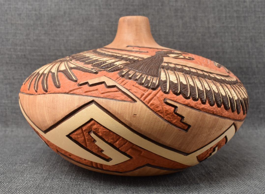 1990-2000's Hopi, hand coiled with carved and painted design titled "Eagle Dancer and Eagle Boy" by Marty & Elvira Nampeyo 7.5" x 11.5"