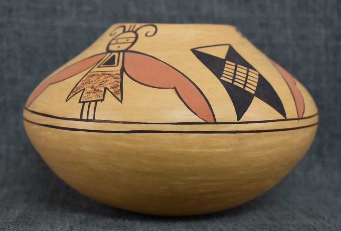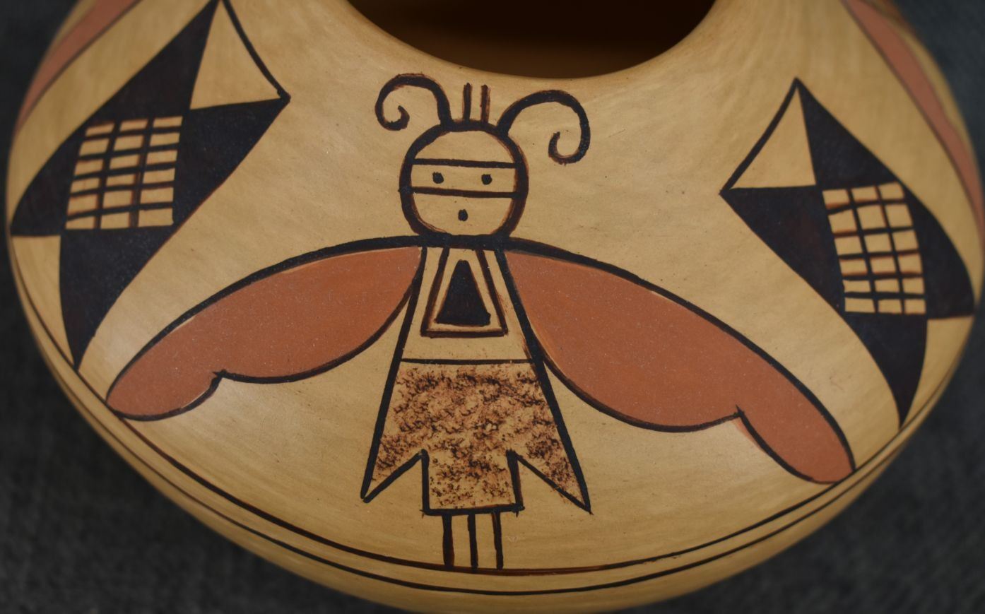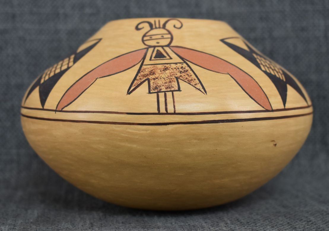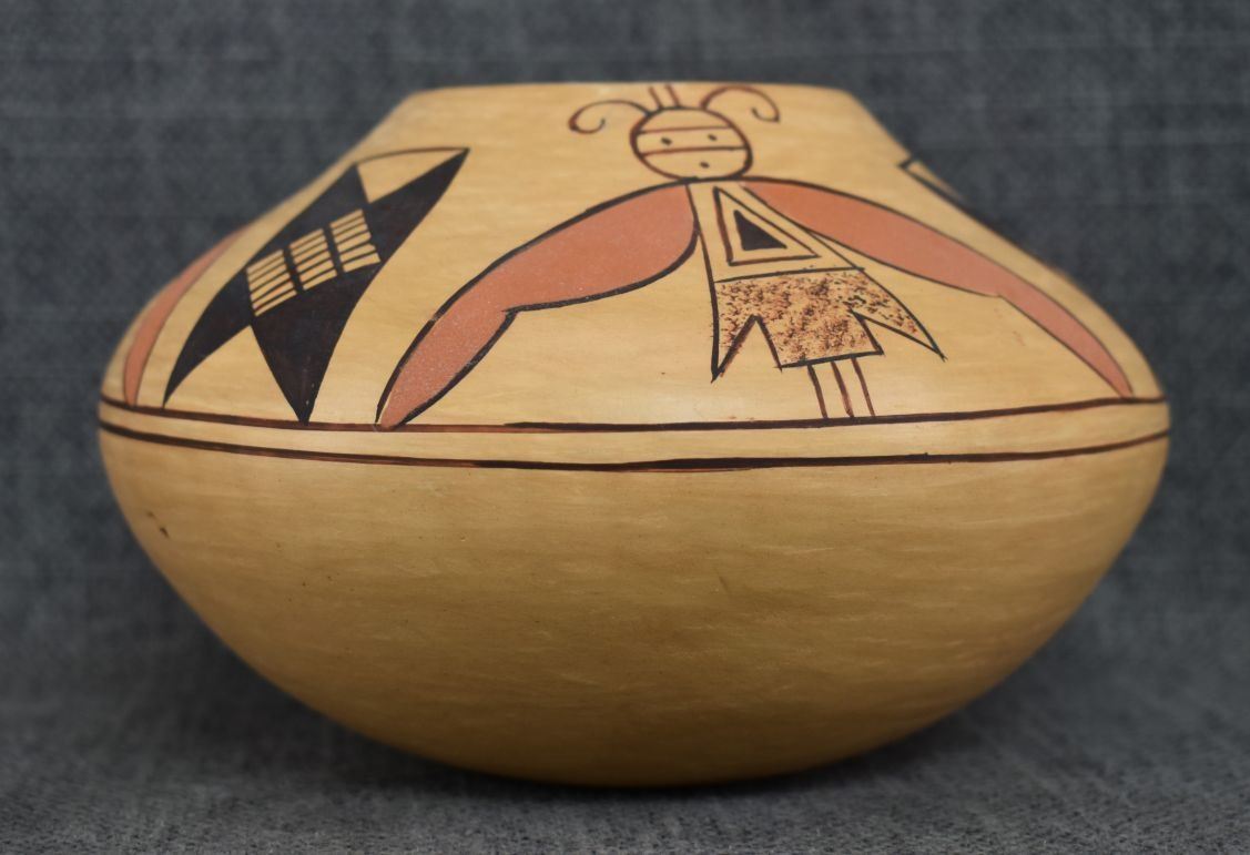 1980's Hopi. hand coiled and painted polychrome stylized butterfly design signed Colleen Poleahla 4'' x 6''