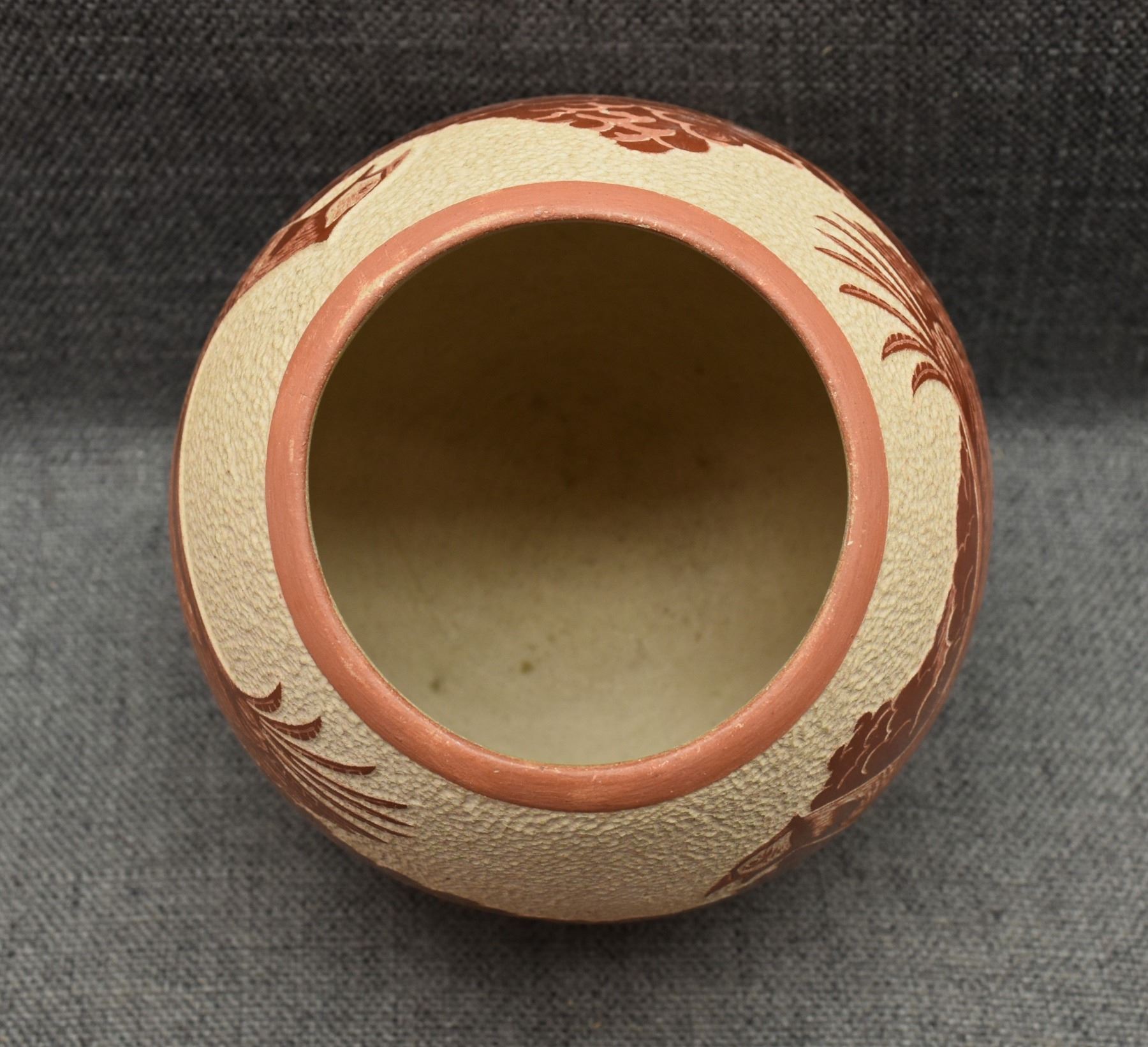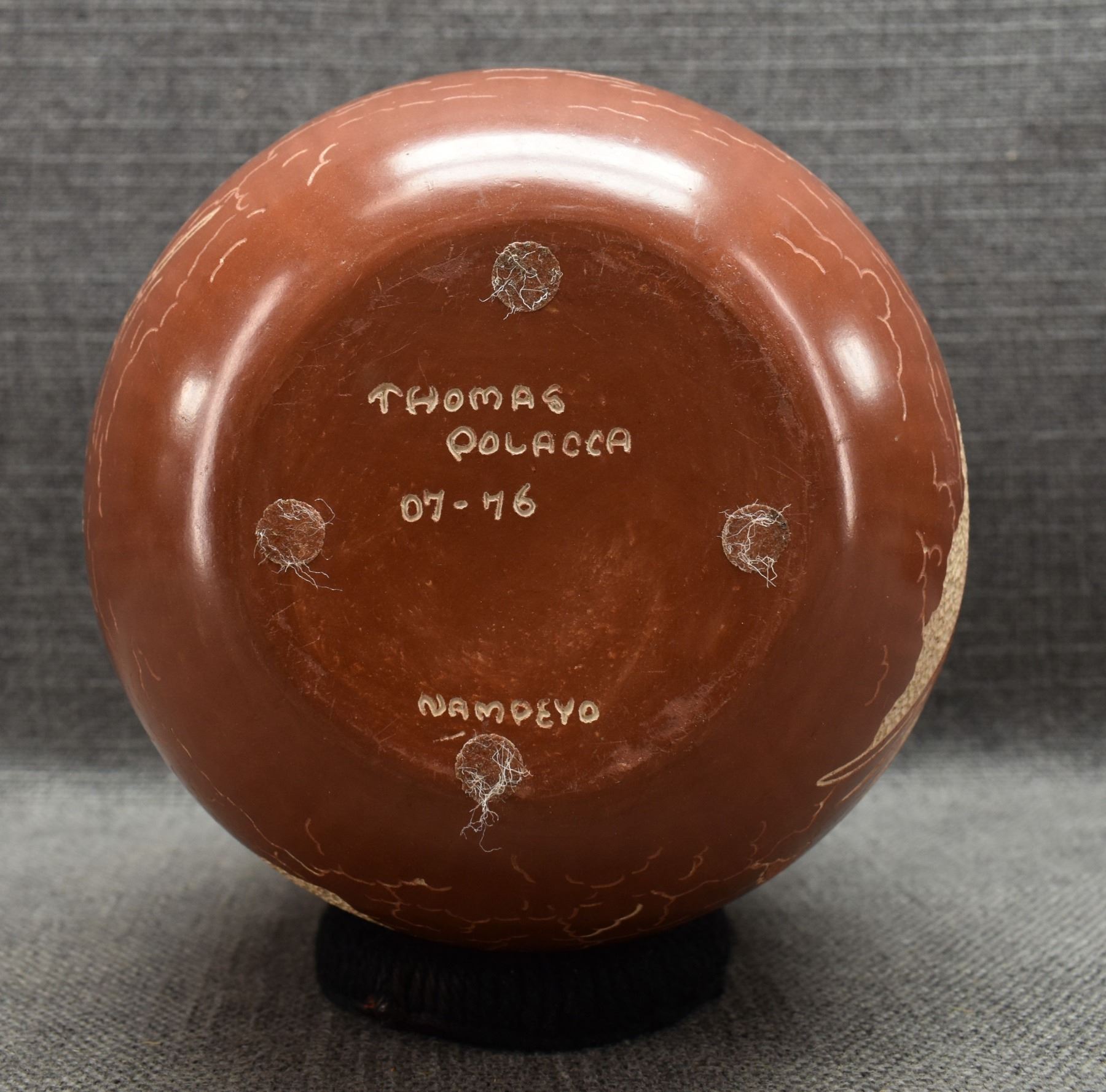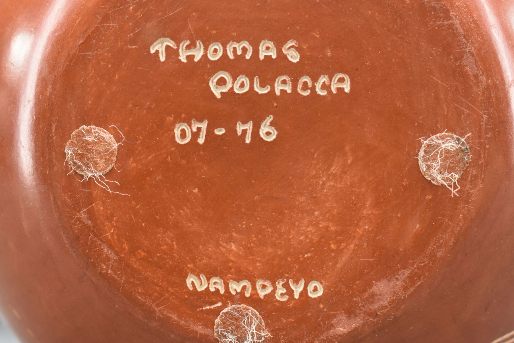 1976 Hopi. Hand coiled and sgraffito design signed Thomas Polacca. 6.5'' x 6''