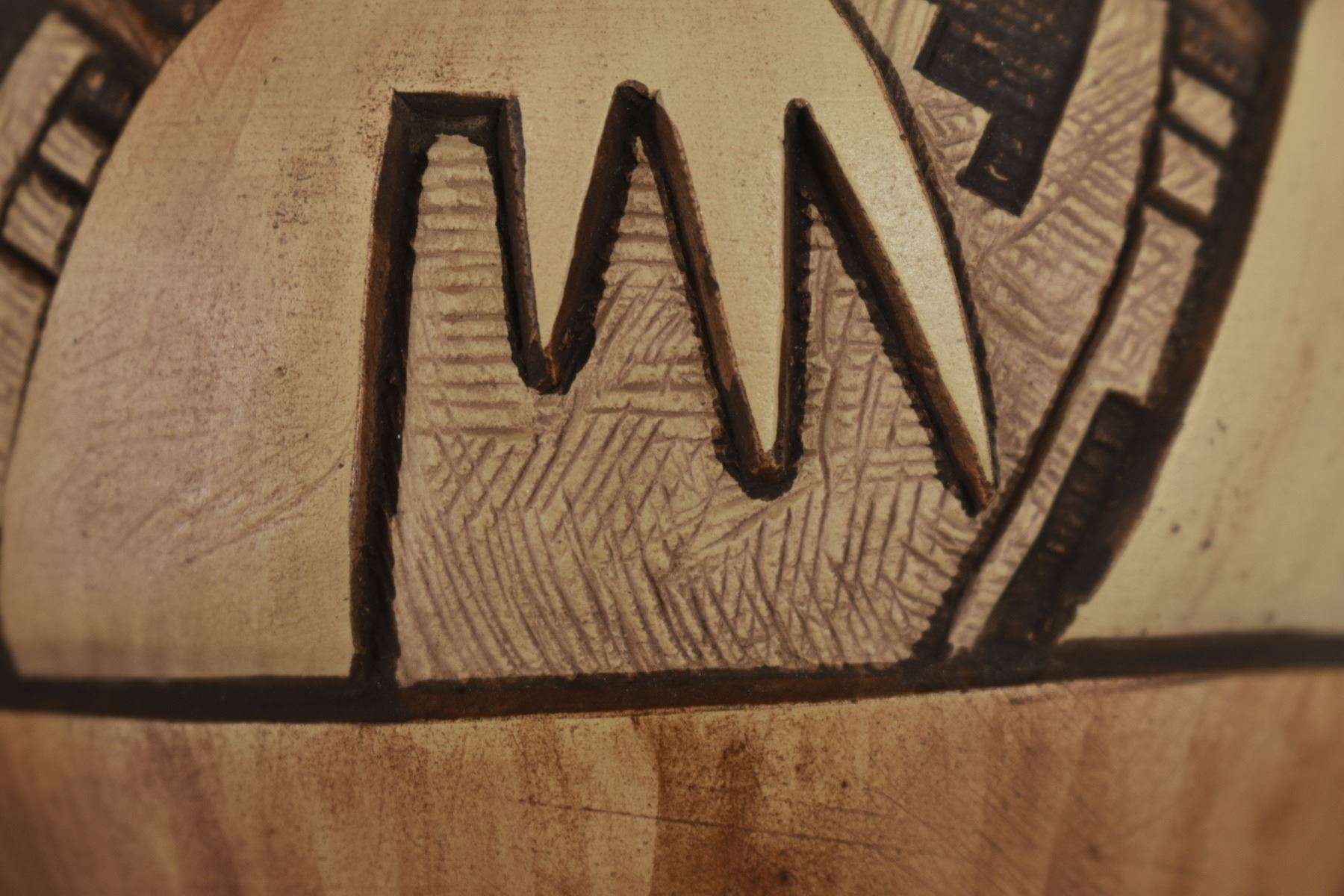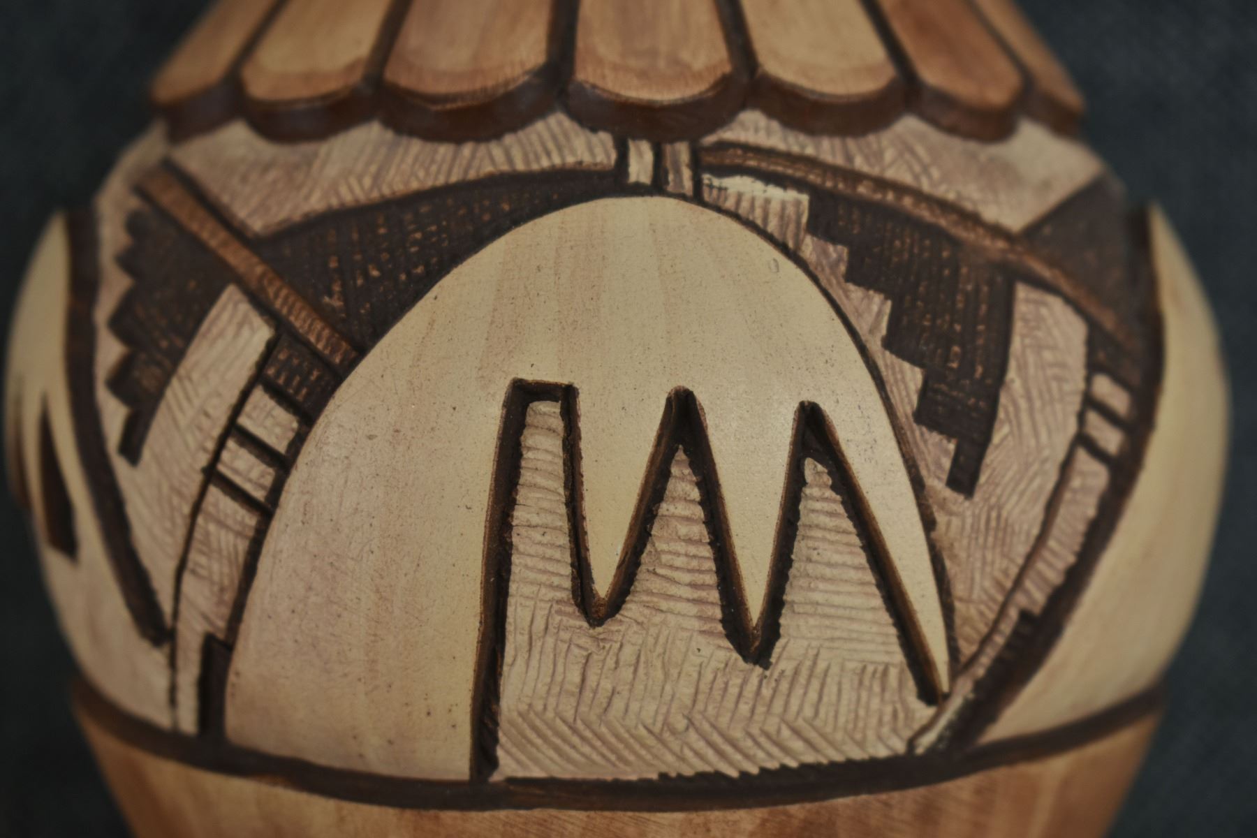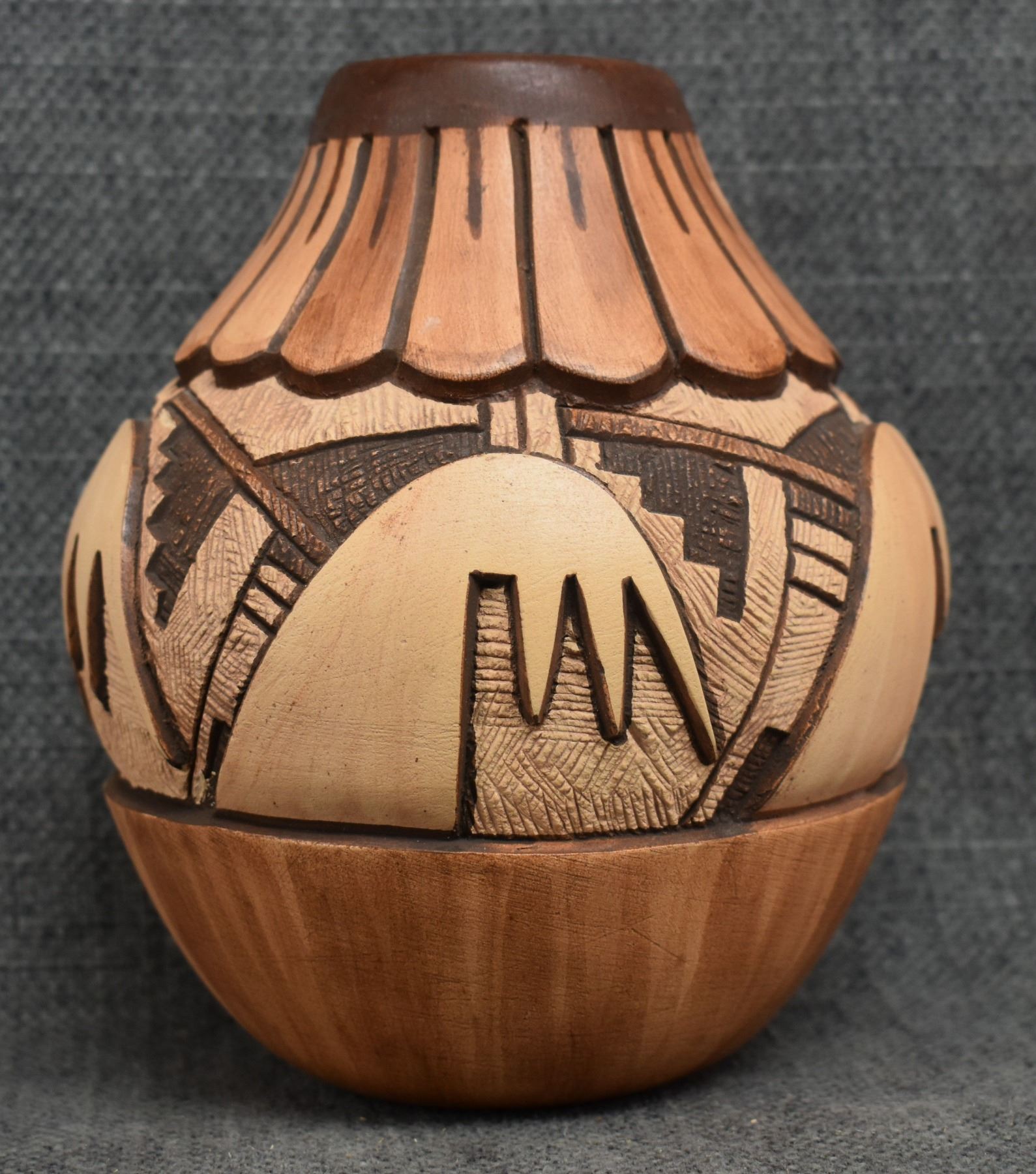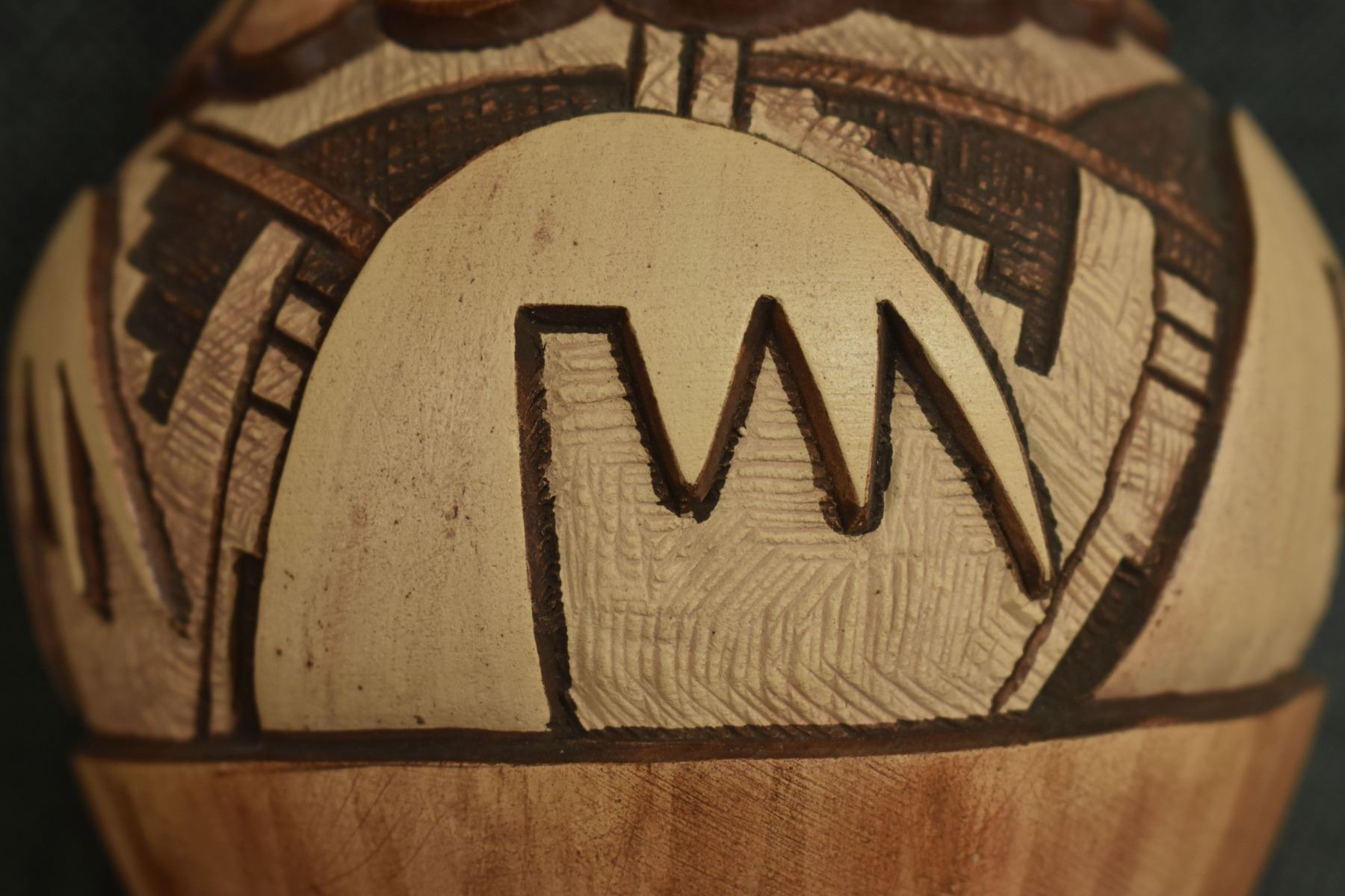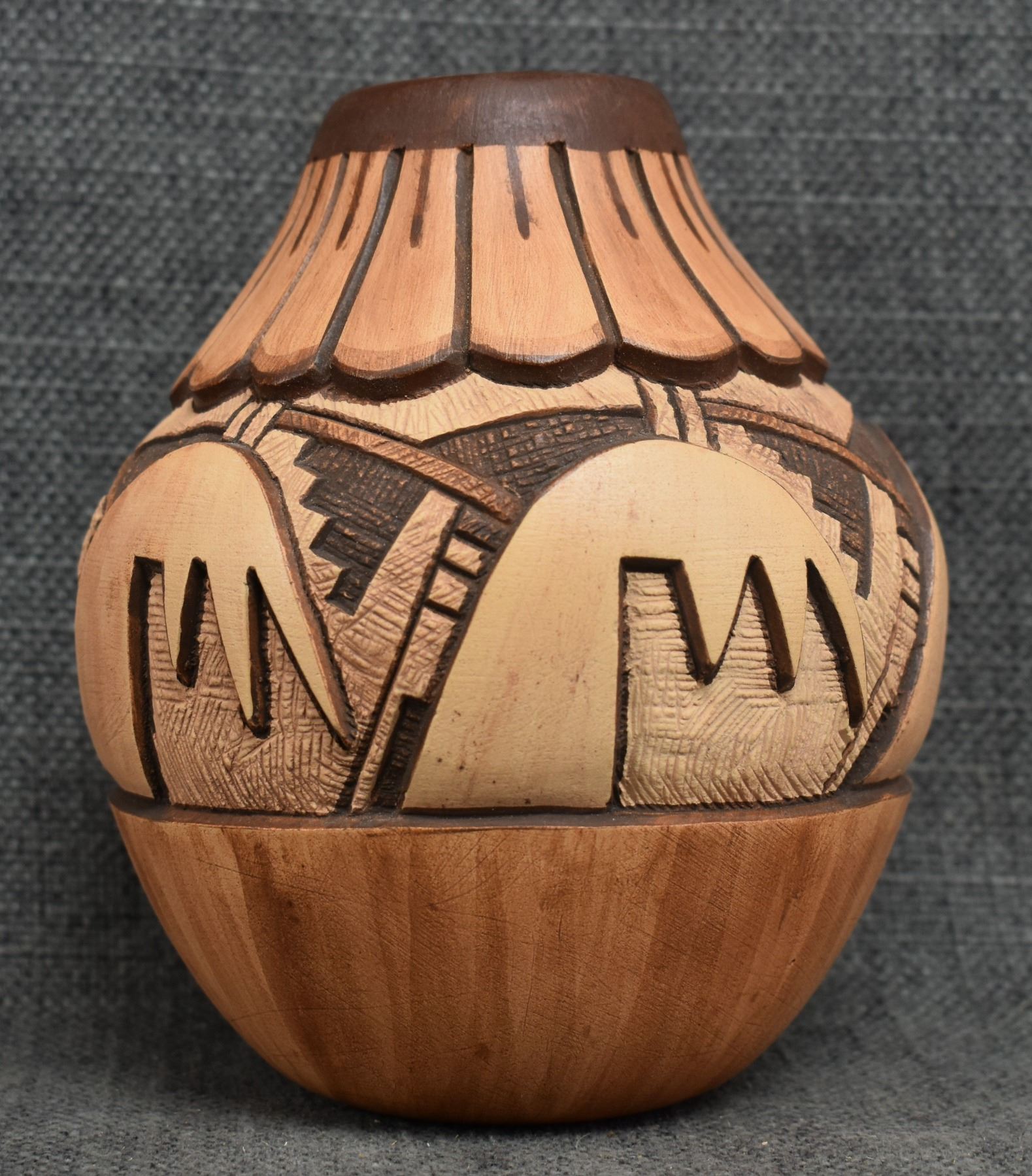 1990's Hopi. Hand coiled caved and painted design pottery vase . Signed Tom Polacca, 6'' x 5''