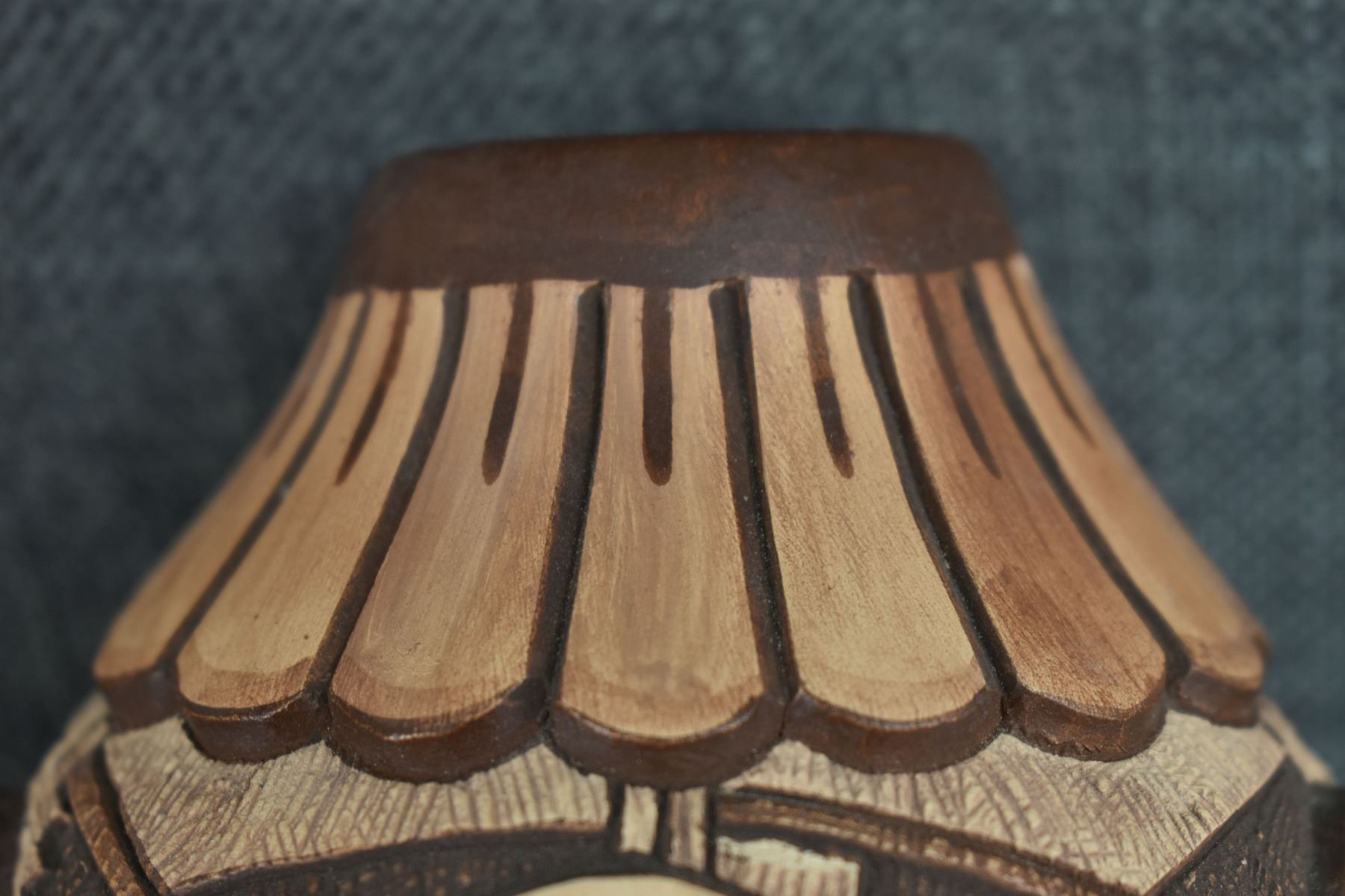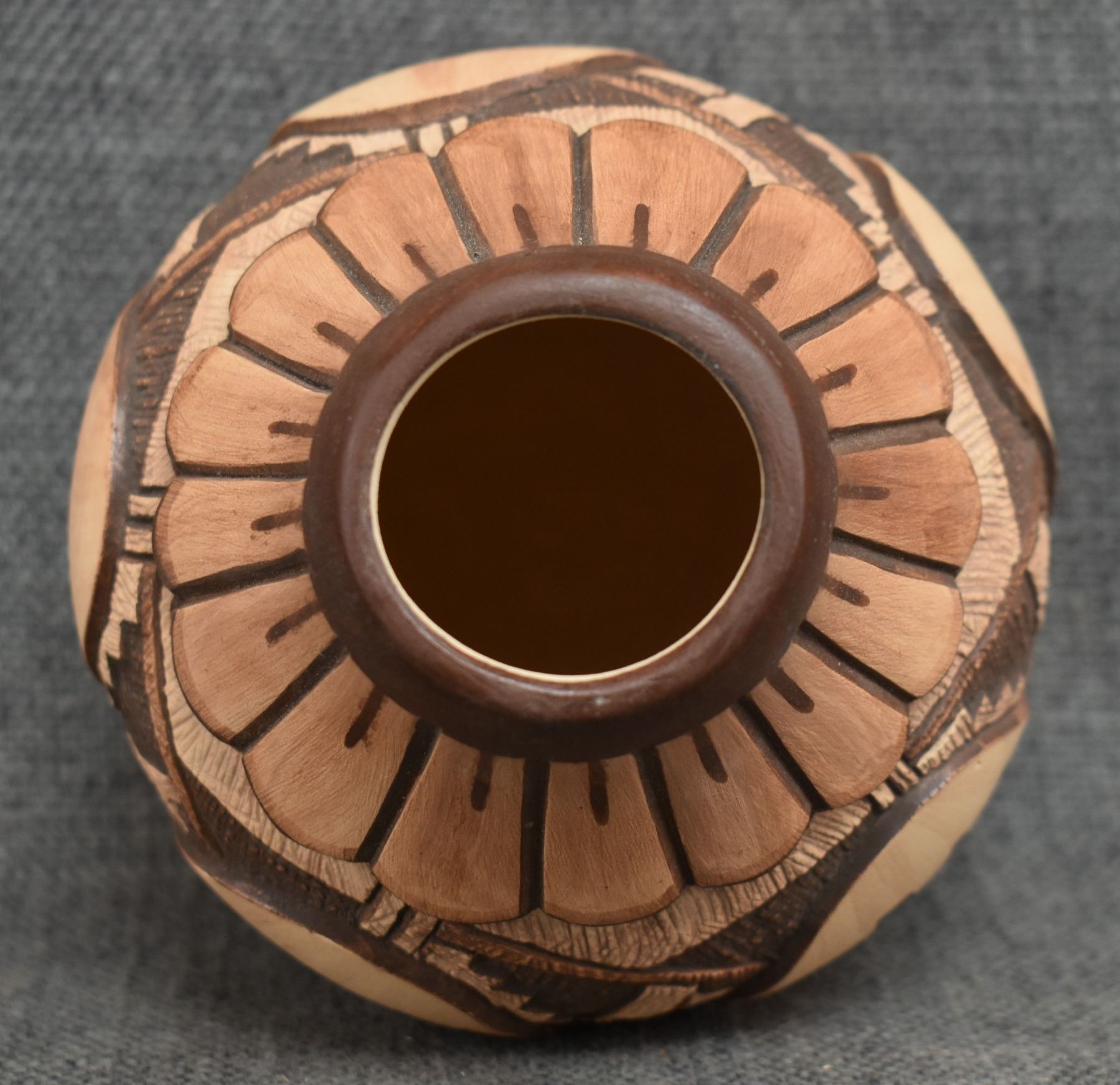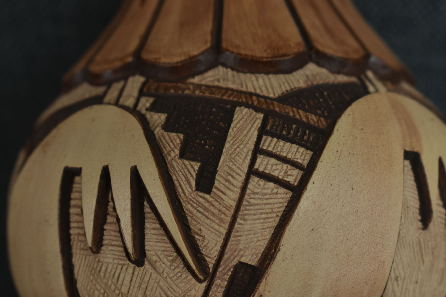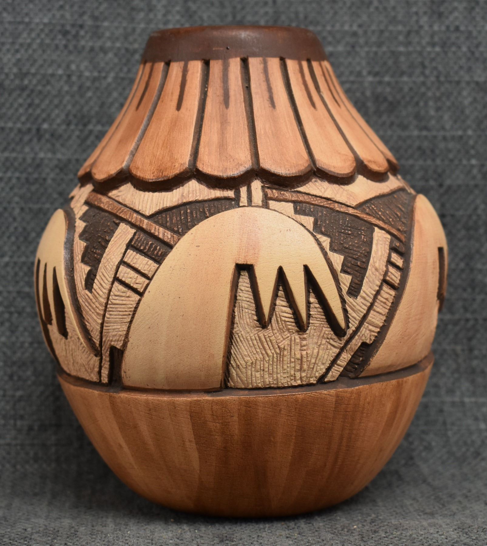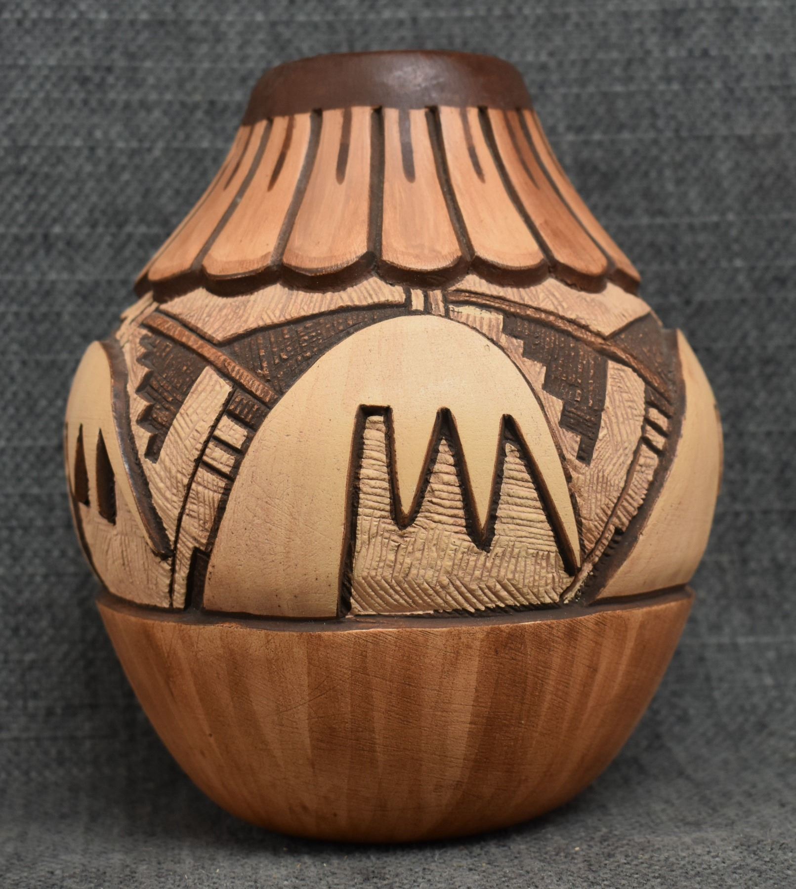 1990's Hopi. Hand coiled caved and painted design pottery vase . Signed Tom Polacca, 6'' x 5''