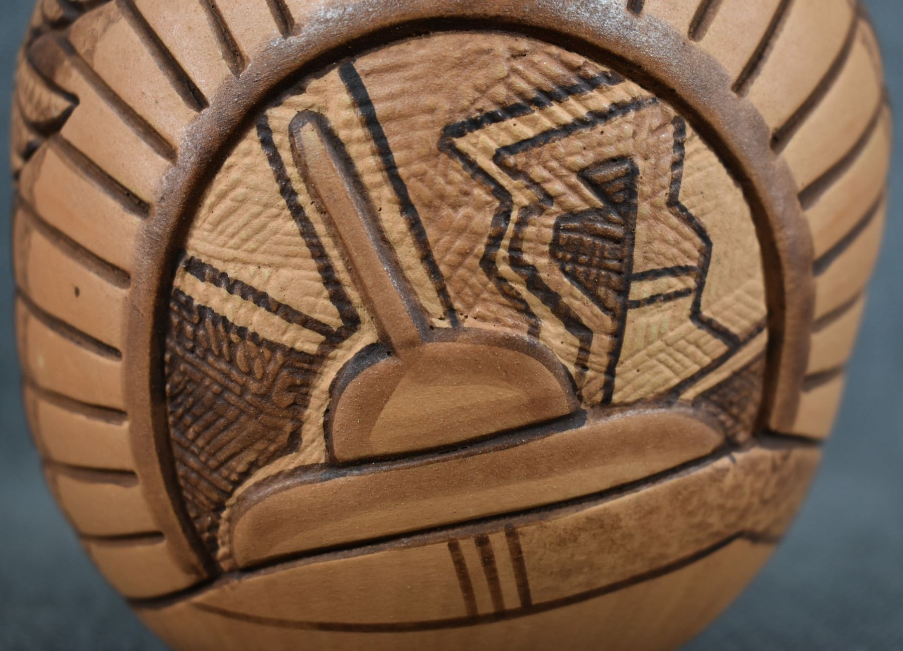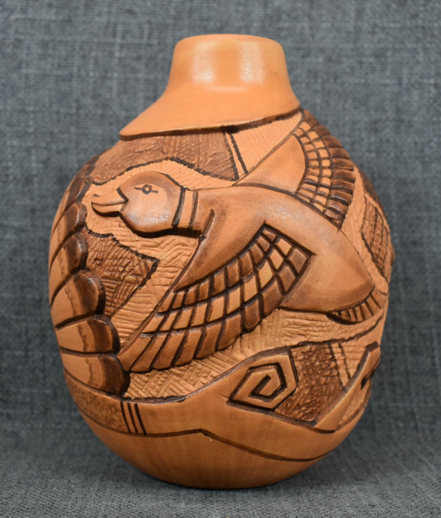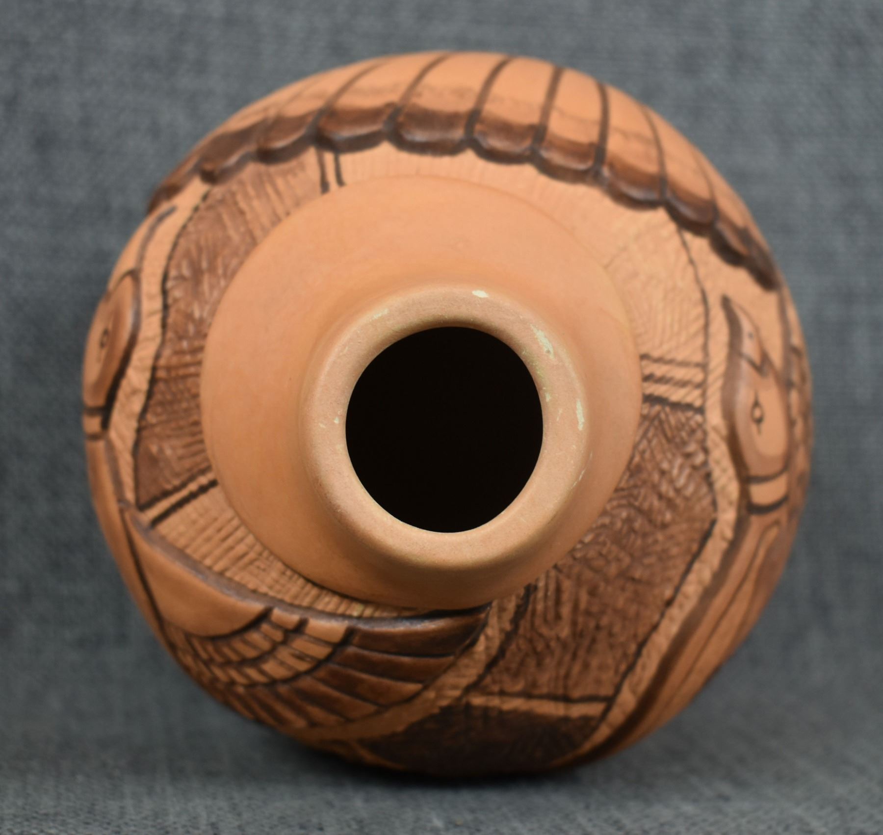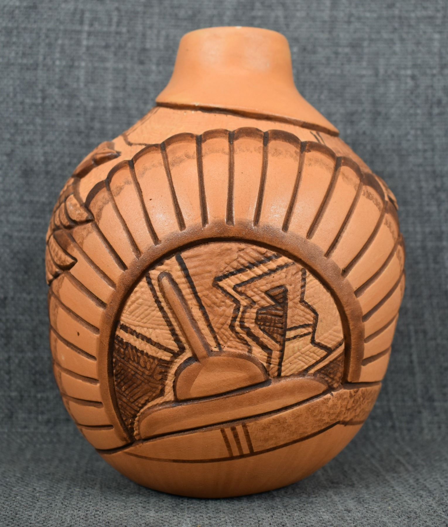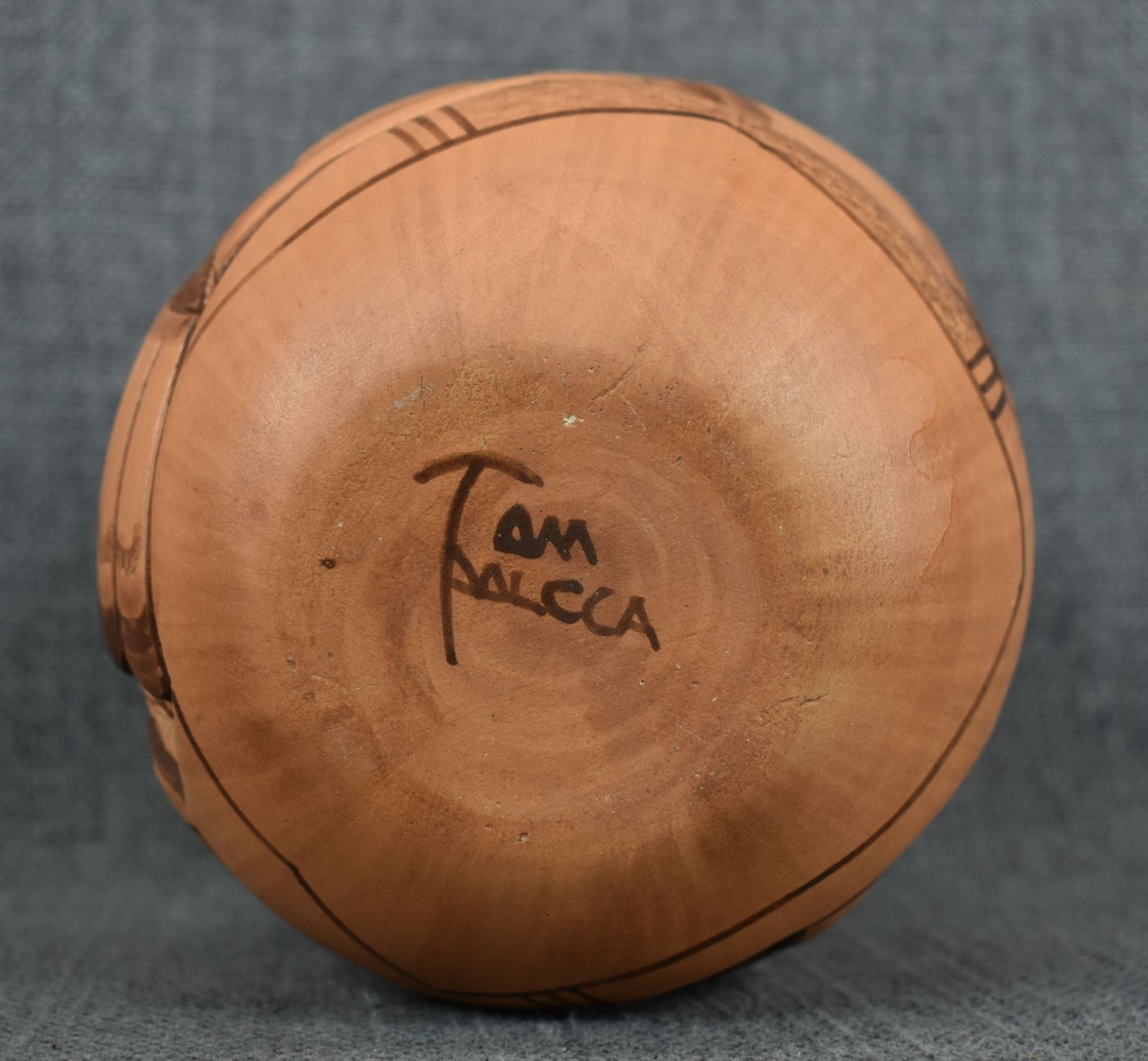 1990-2000's Hopi, hand coiled with carved and painted duck and kachina design by Tom Polacca, 6.5" x 5"