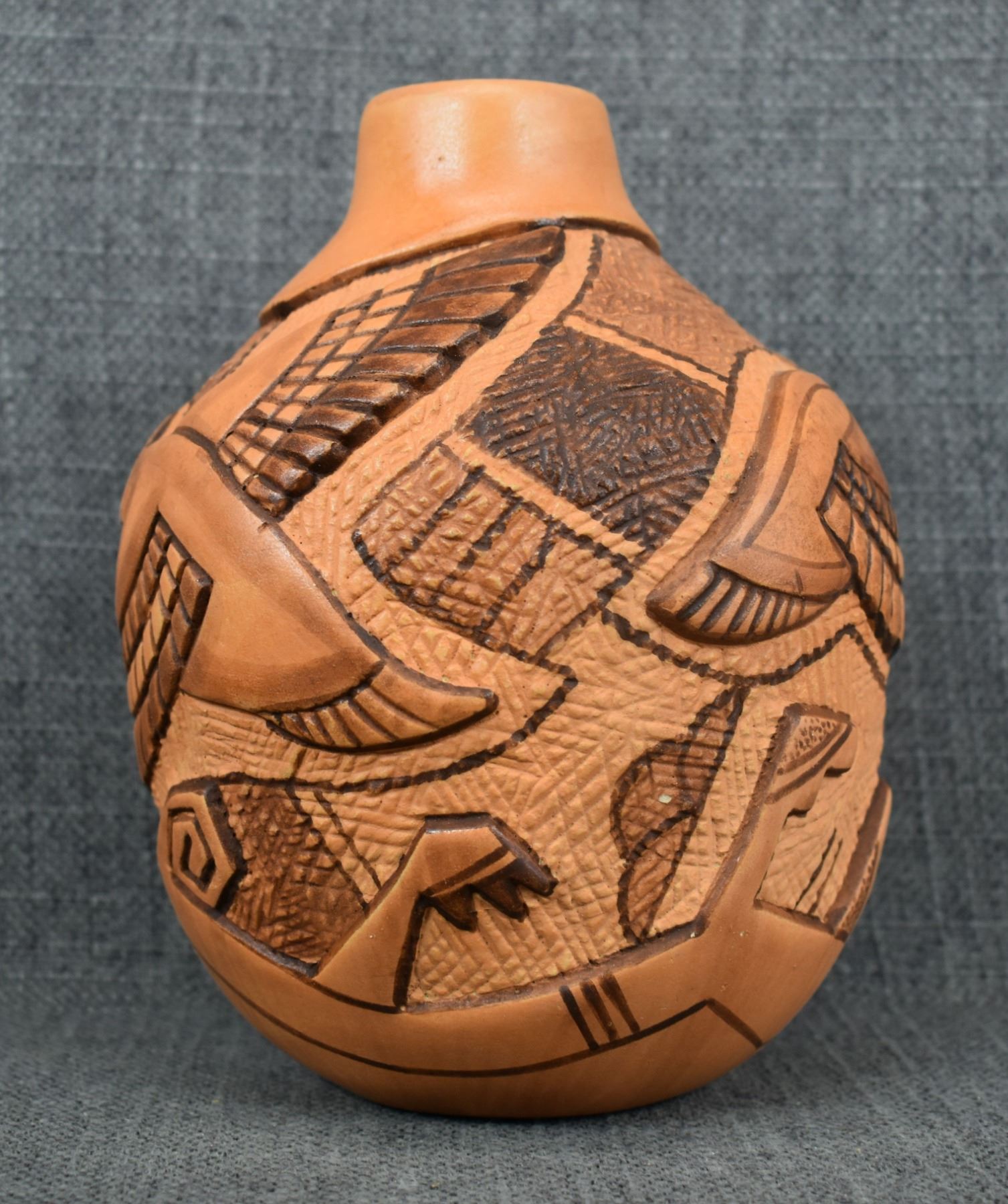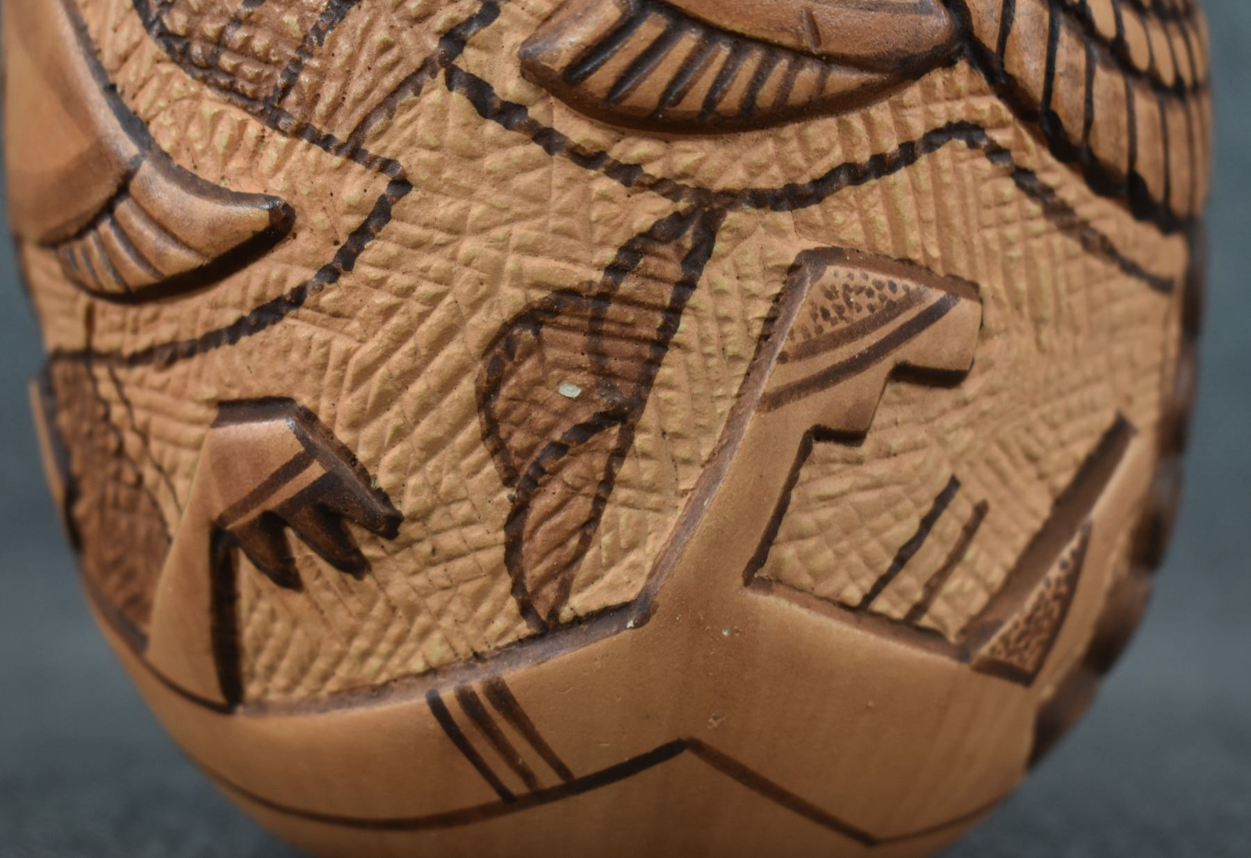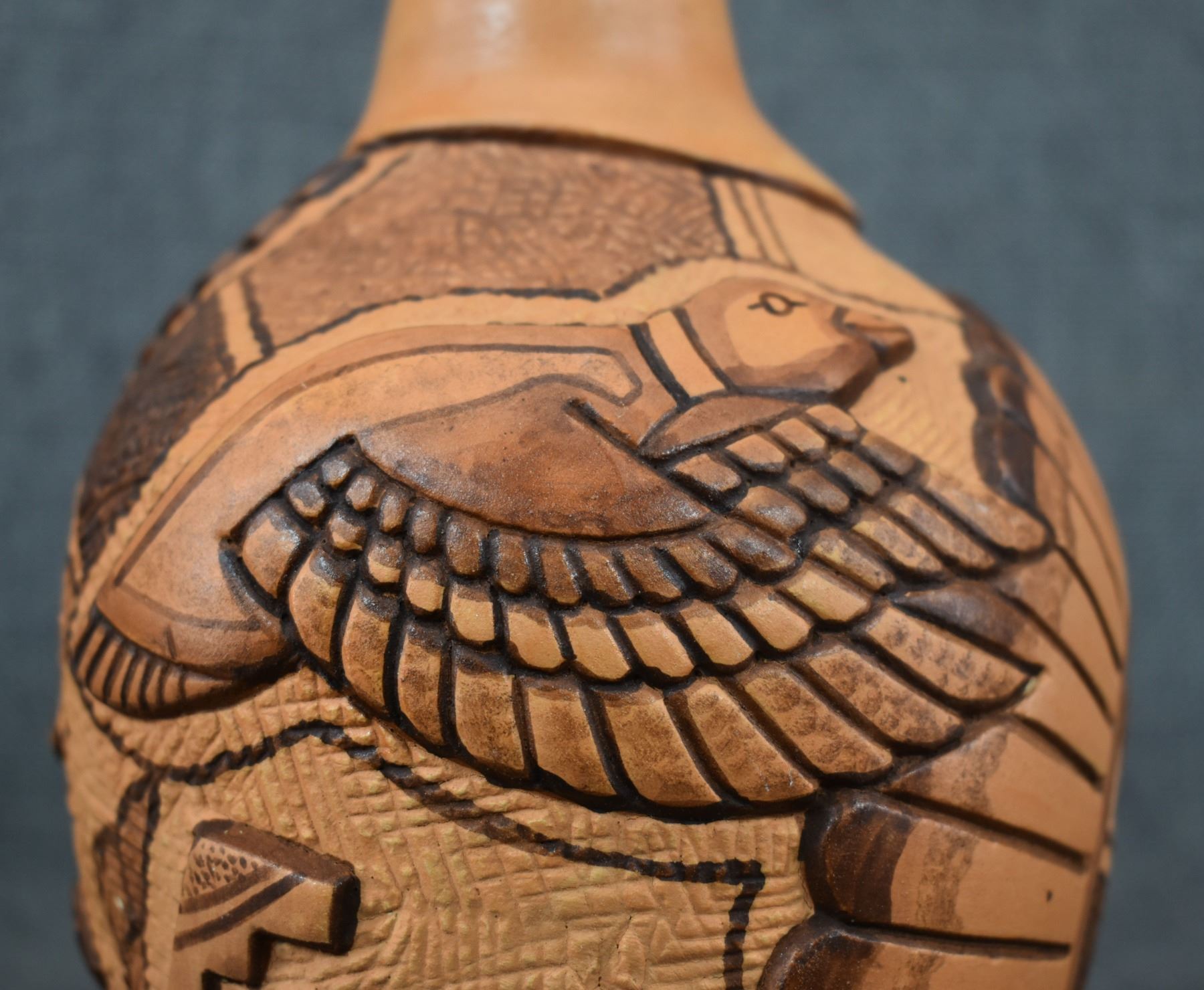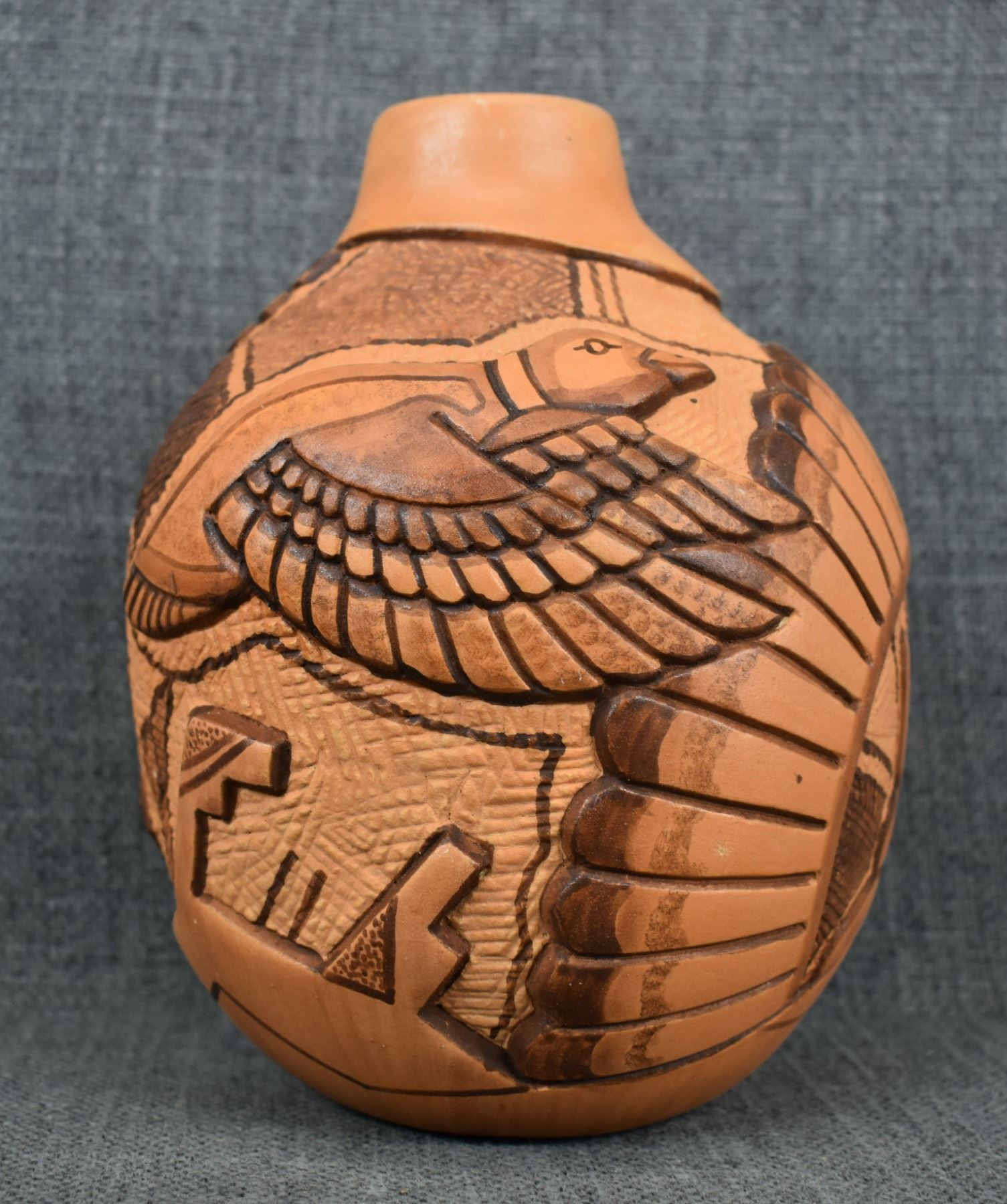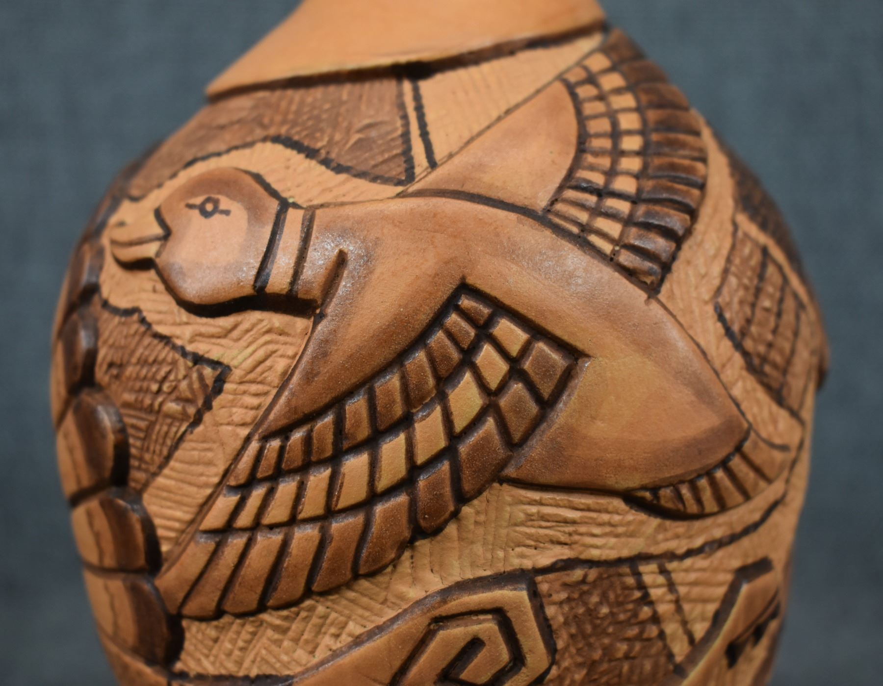1990-2000's Hopi, hand coiled with carved and painted duck and kachina design by Tom Polacca, 6.5" x 5"