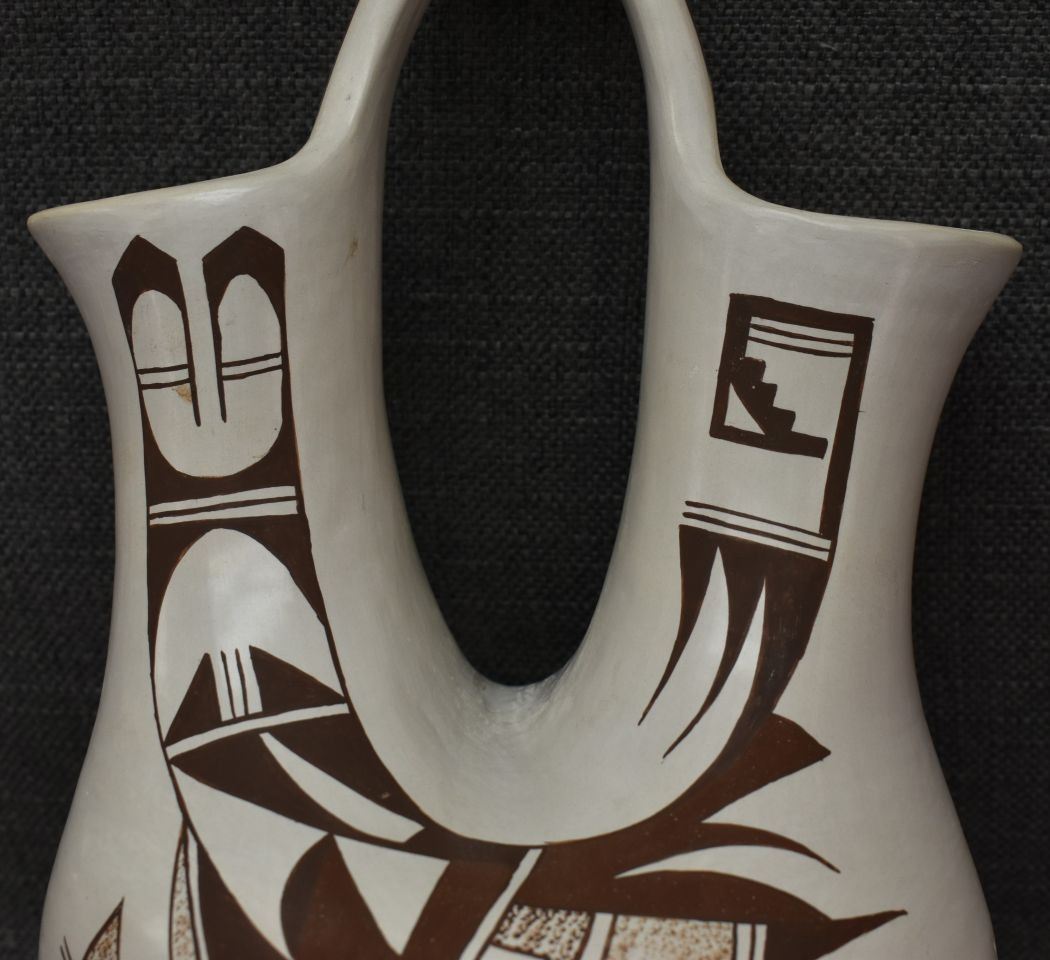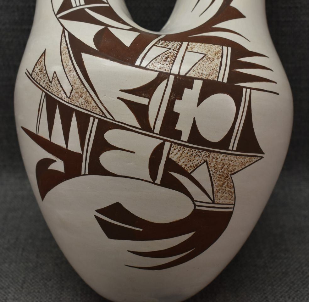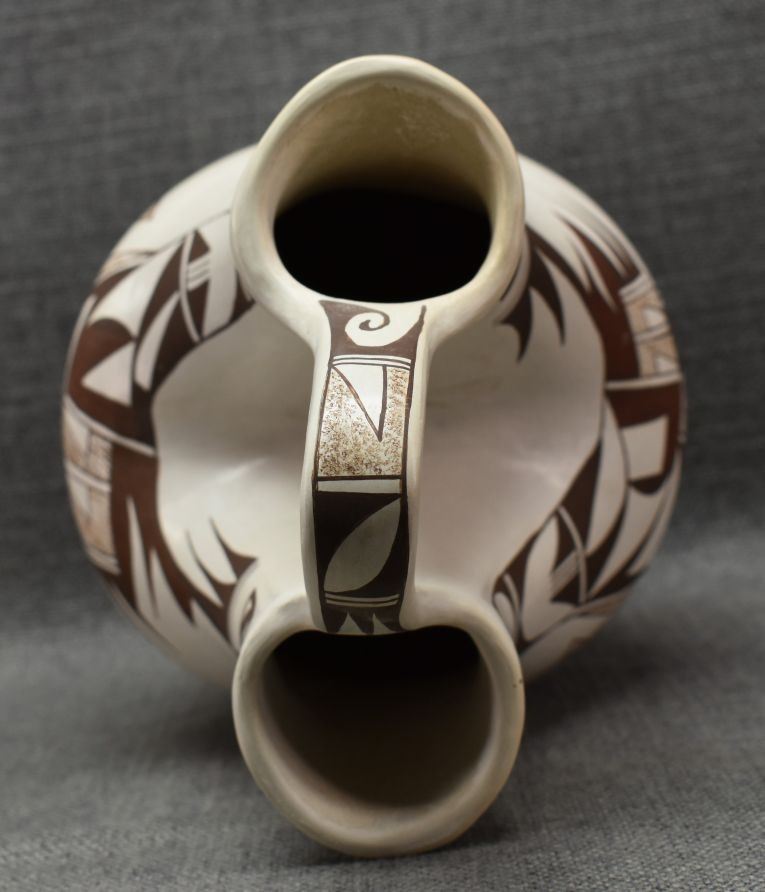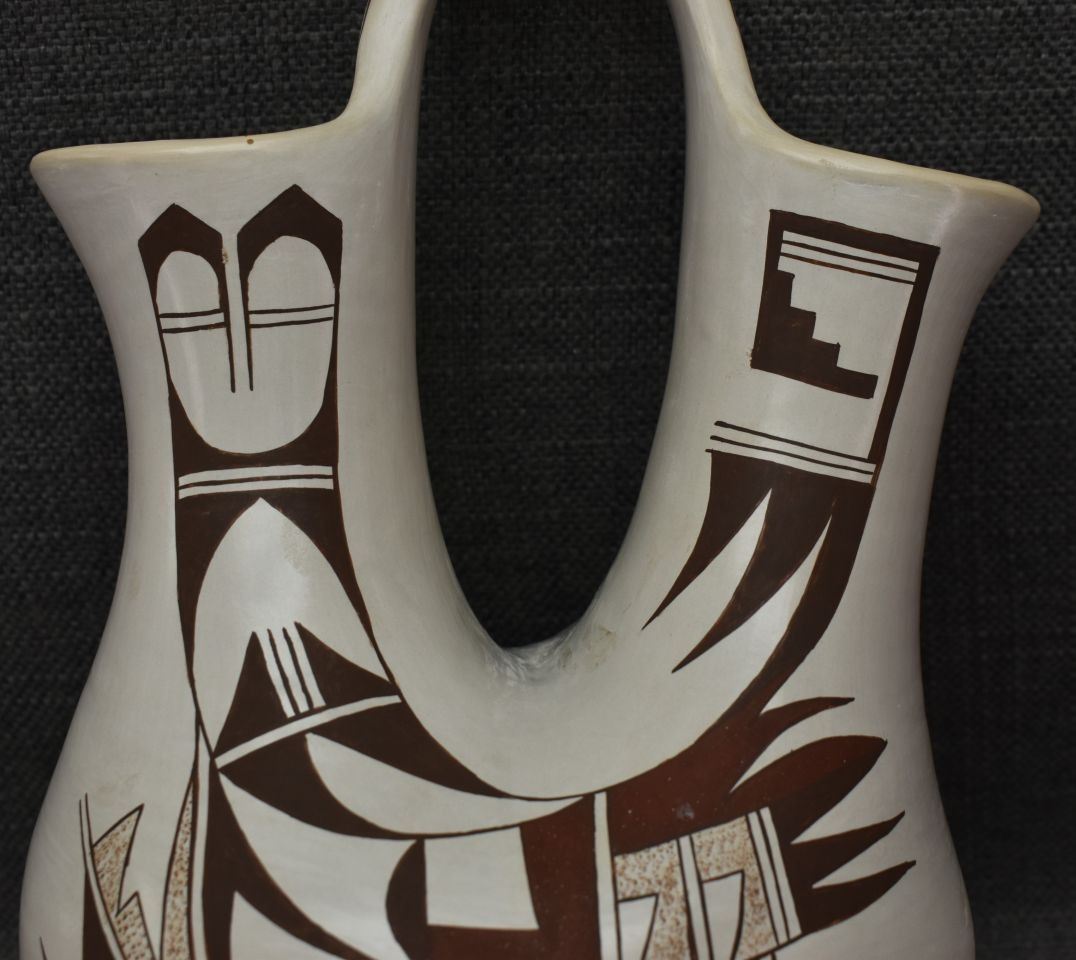 1970-80's Hopi hand coiled and polychrome painted design wedding vase signed with frog logo for Joy Navasie. 12.5" x 7"
