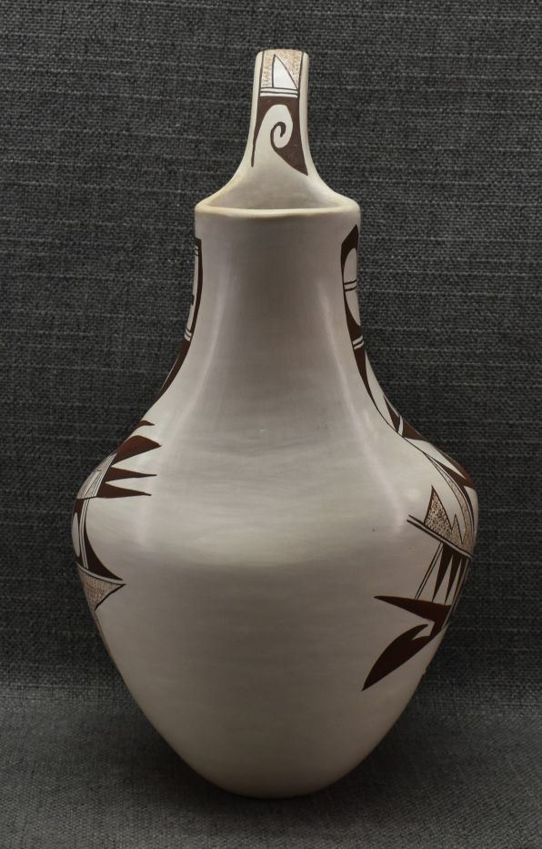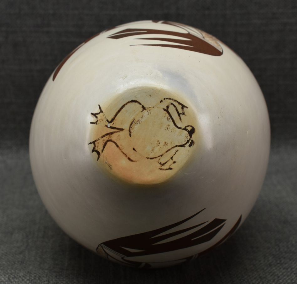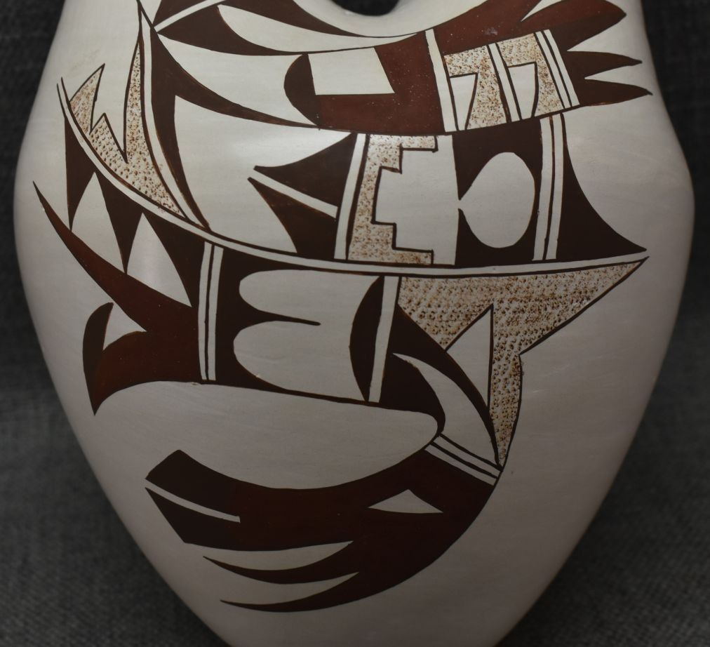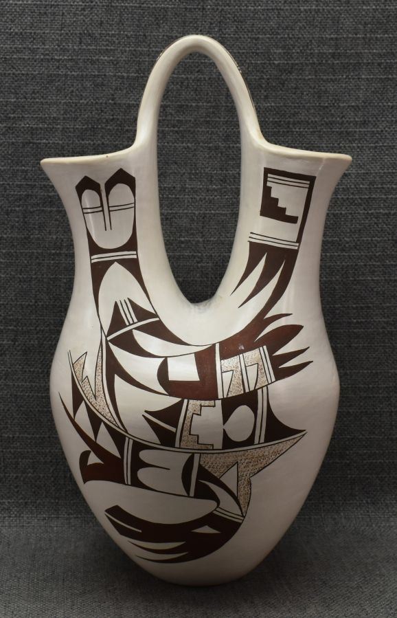 1970-80's Hopi hand coiled and polychrome painted design wedding vase signed with frog logo for Joy Navasie. 12.5" x 7"