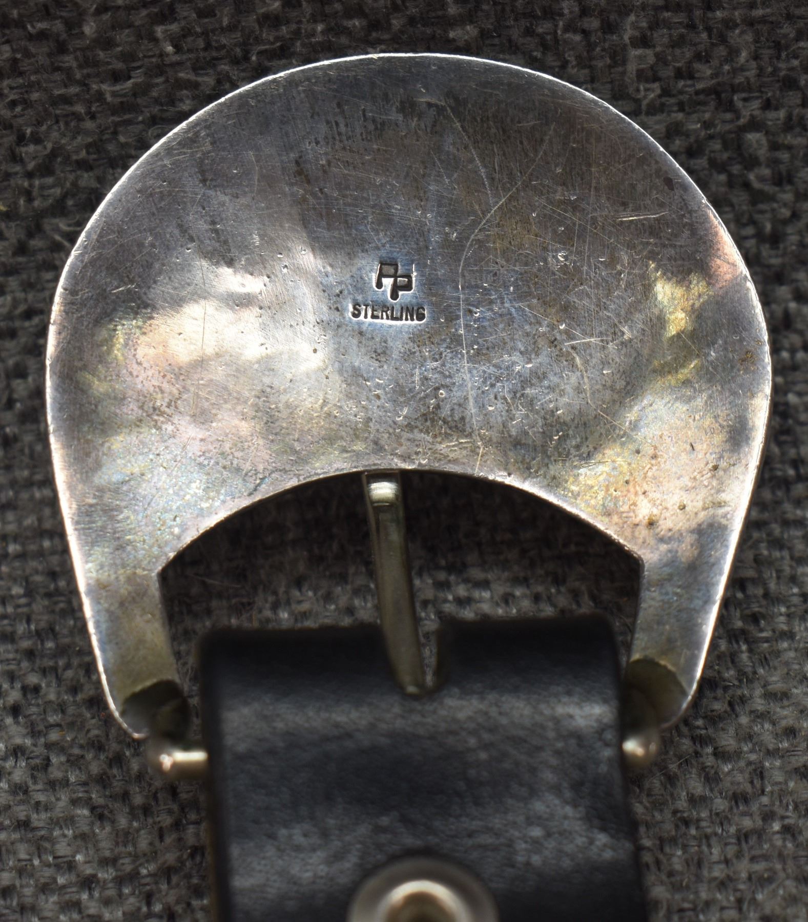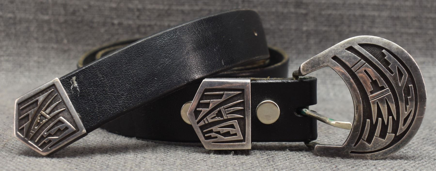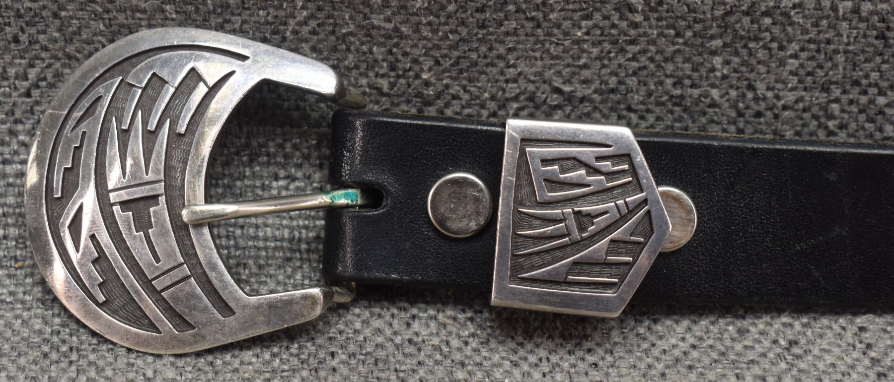 1990's Hopi. Sterling silver ranger buckle 2'' x 2'' signed PP. keeper and tip. 1'' x 40'' leather belt