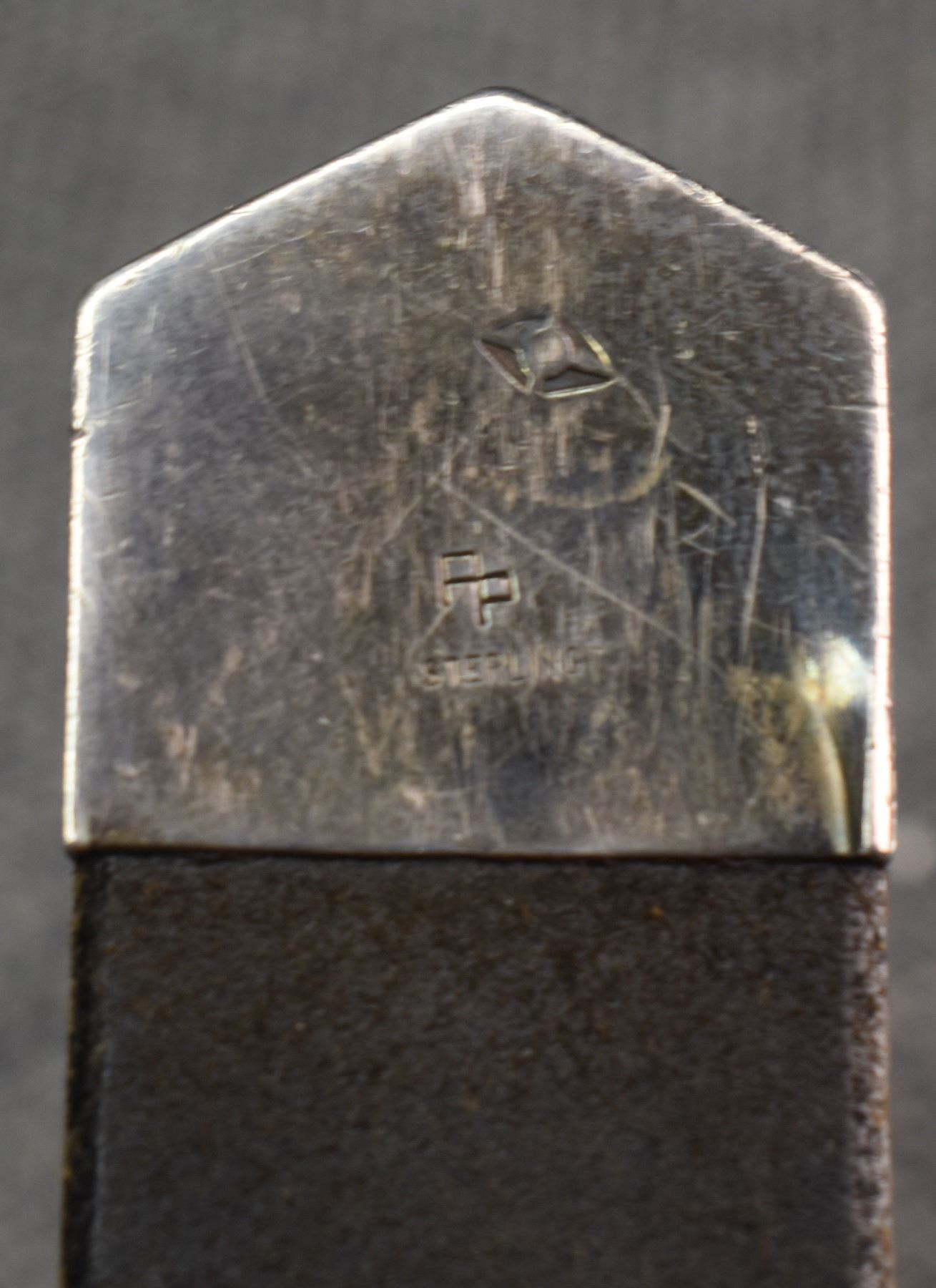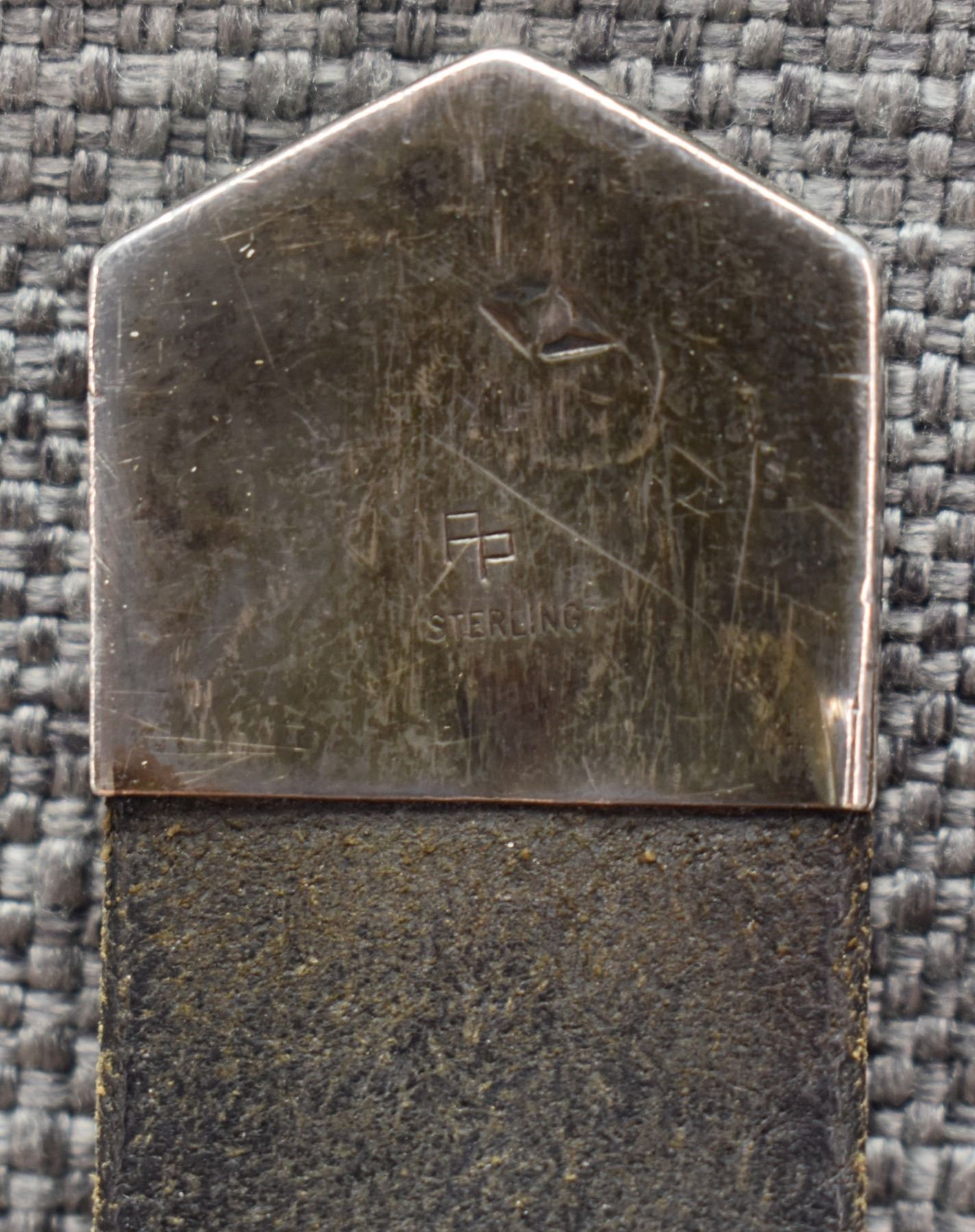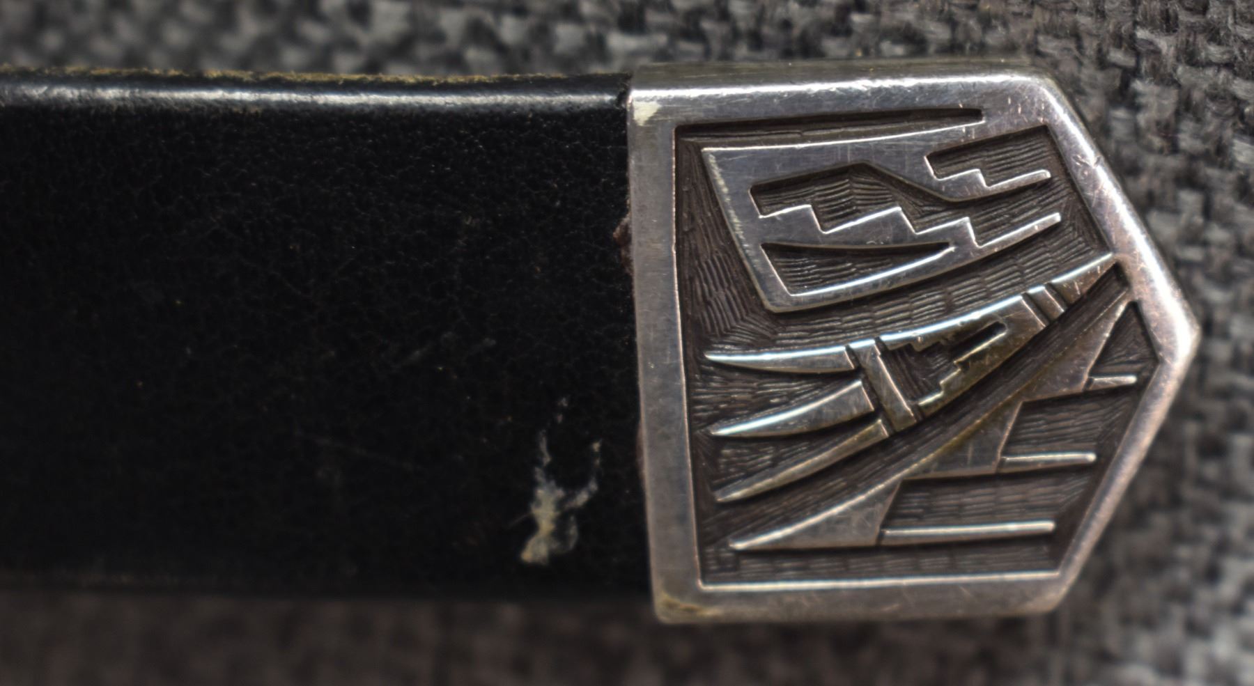 1990's Hopi. Sterling silver ranger buckle 2'' x 2'' signed PP. keeper and tip. 1'' x 40'' leather belt