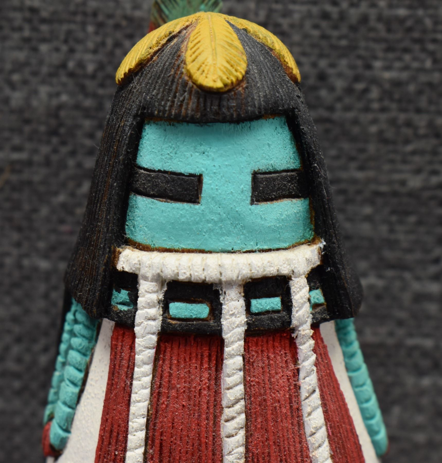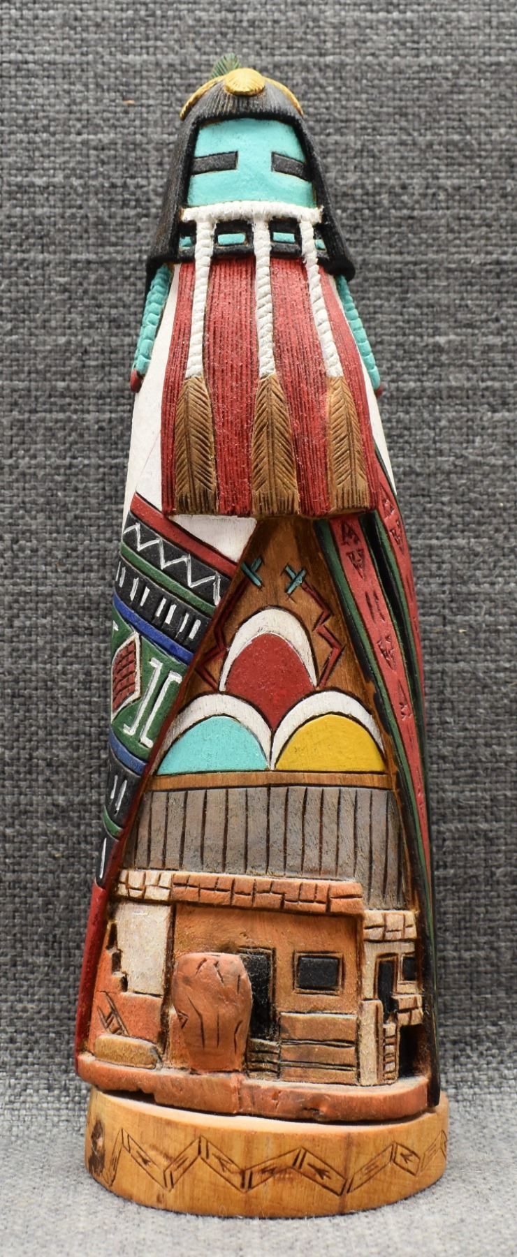 1990's Hopi/Tewa kachina depicting Maiden over pueblo scene. 9" x 2.5"