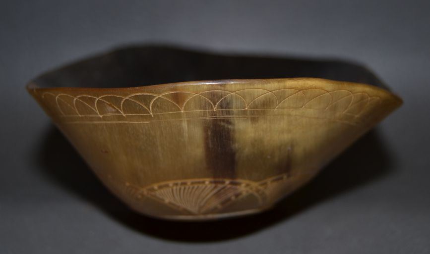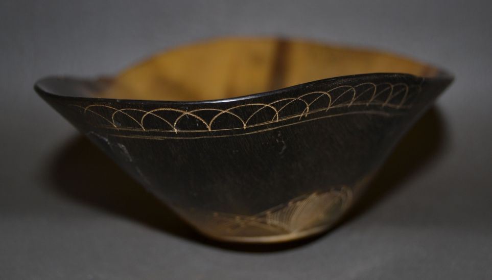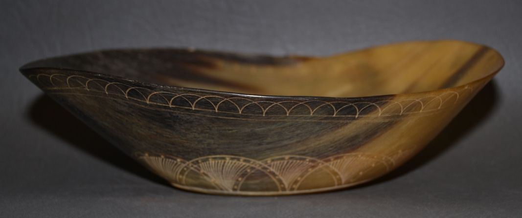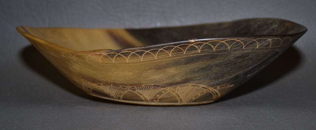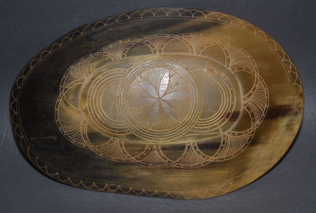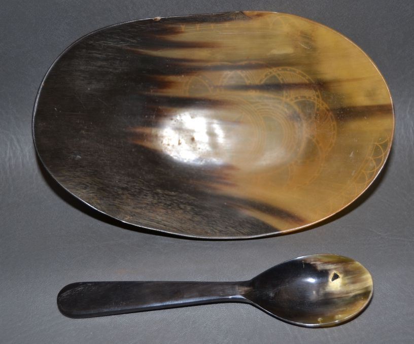 1950's hand made from horn translucent bowl with sgraffito design on bottom 5" x 8" x 4" hand carved horn spoon 6.5" long