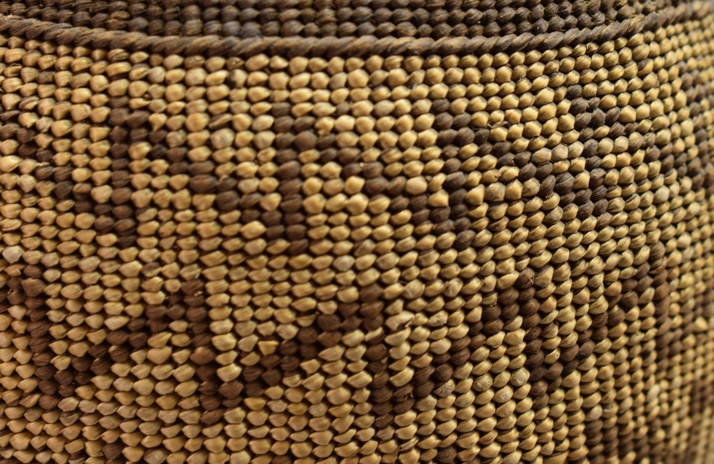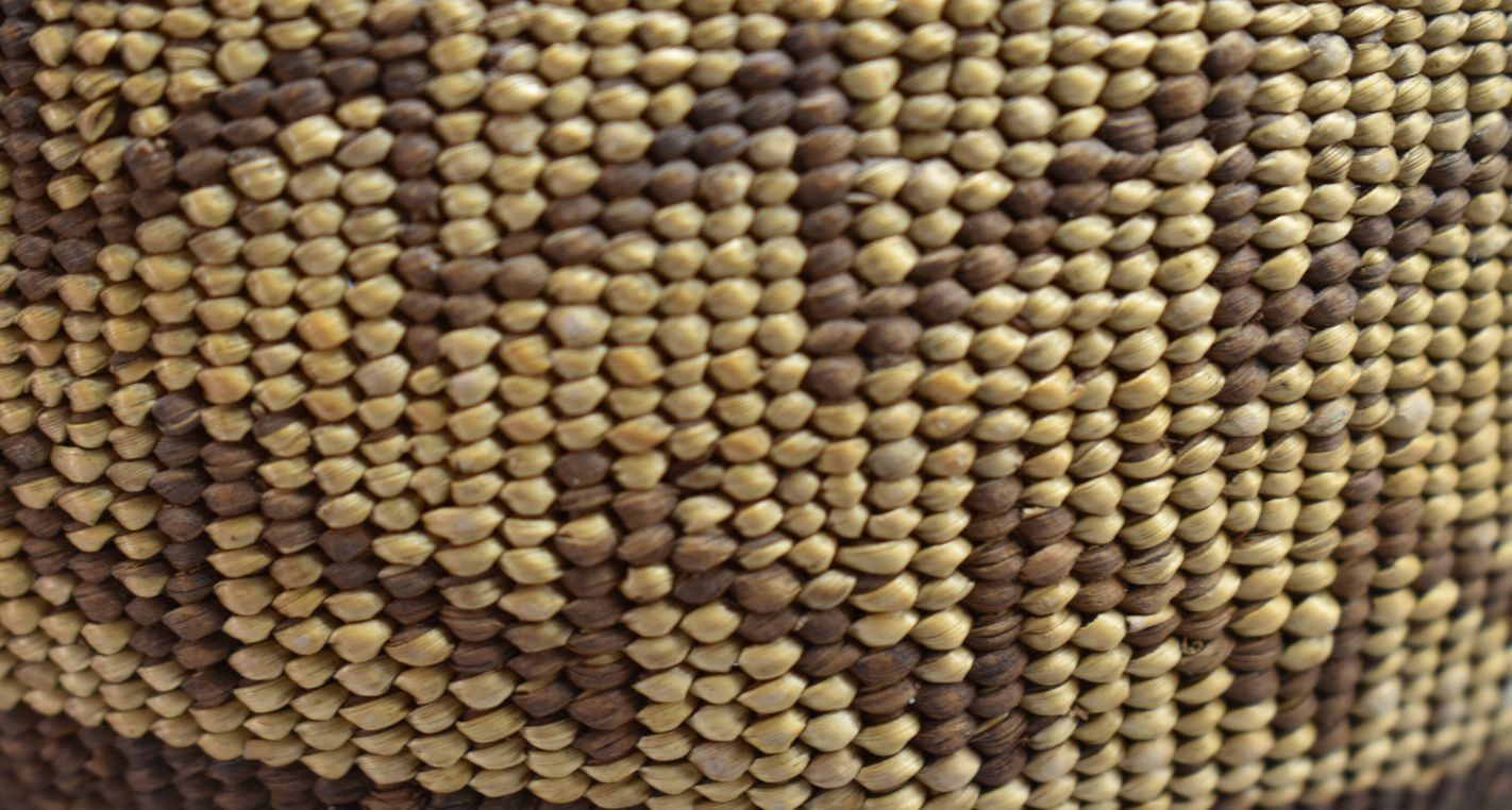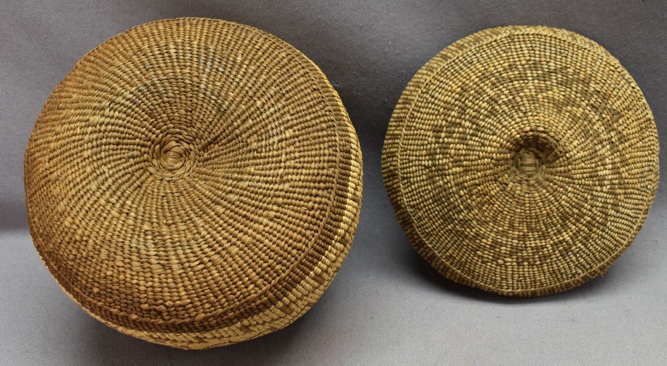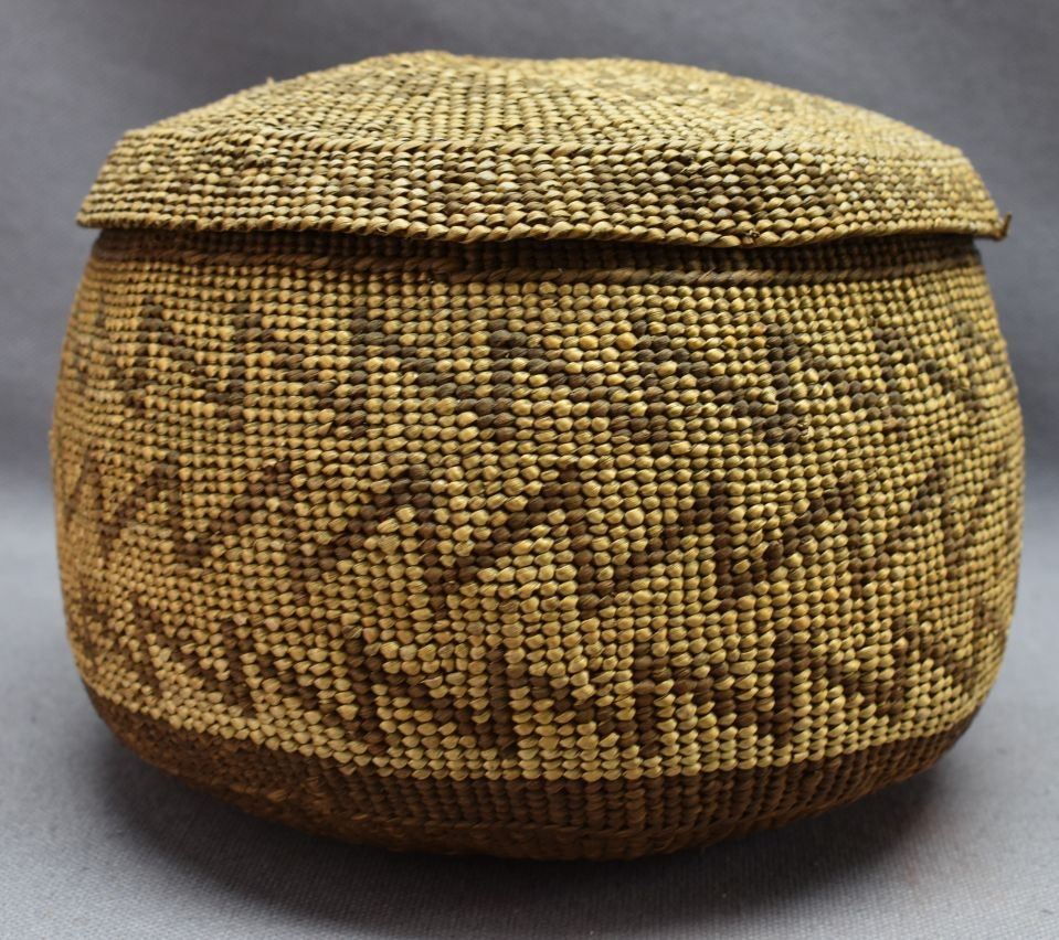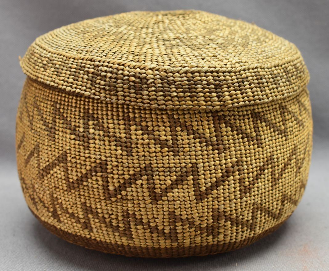 1900's Hupa Indian. Hand woven geometric design lidded Tobacco basket. 4.5'' x 6.5'' lid has minor split basket has no splits