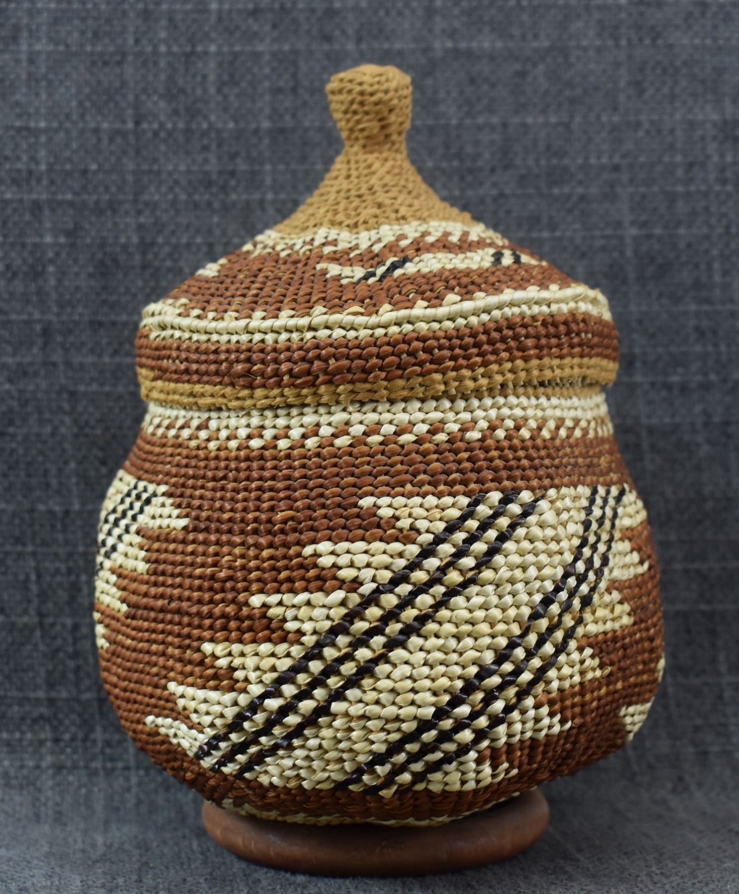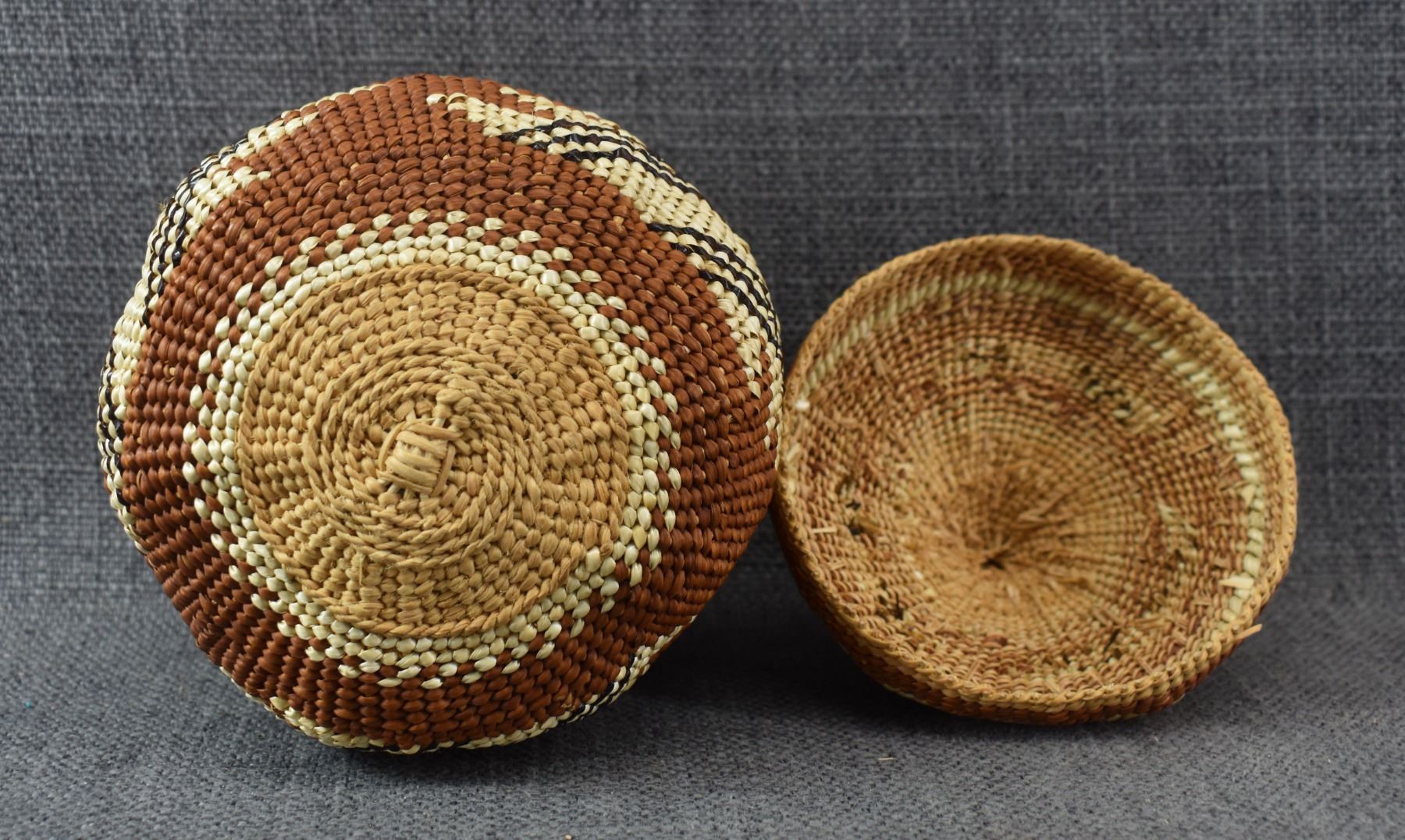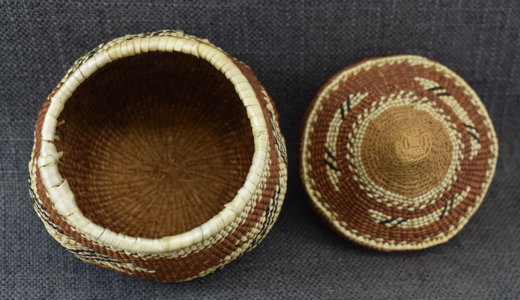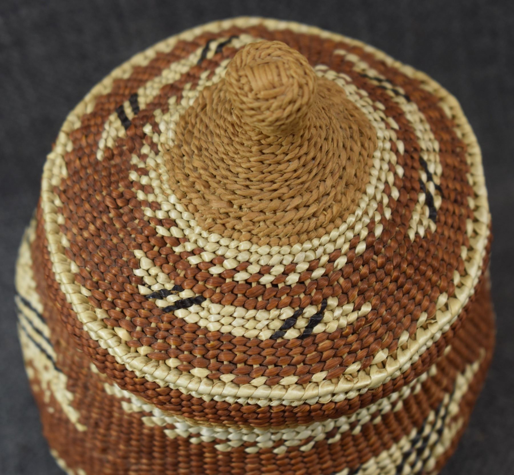 20th century Hupa/Karuk. Hand woven geometric design lidded basket.no splits or breaks. 6.5'' x 5''