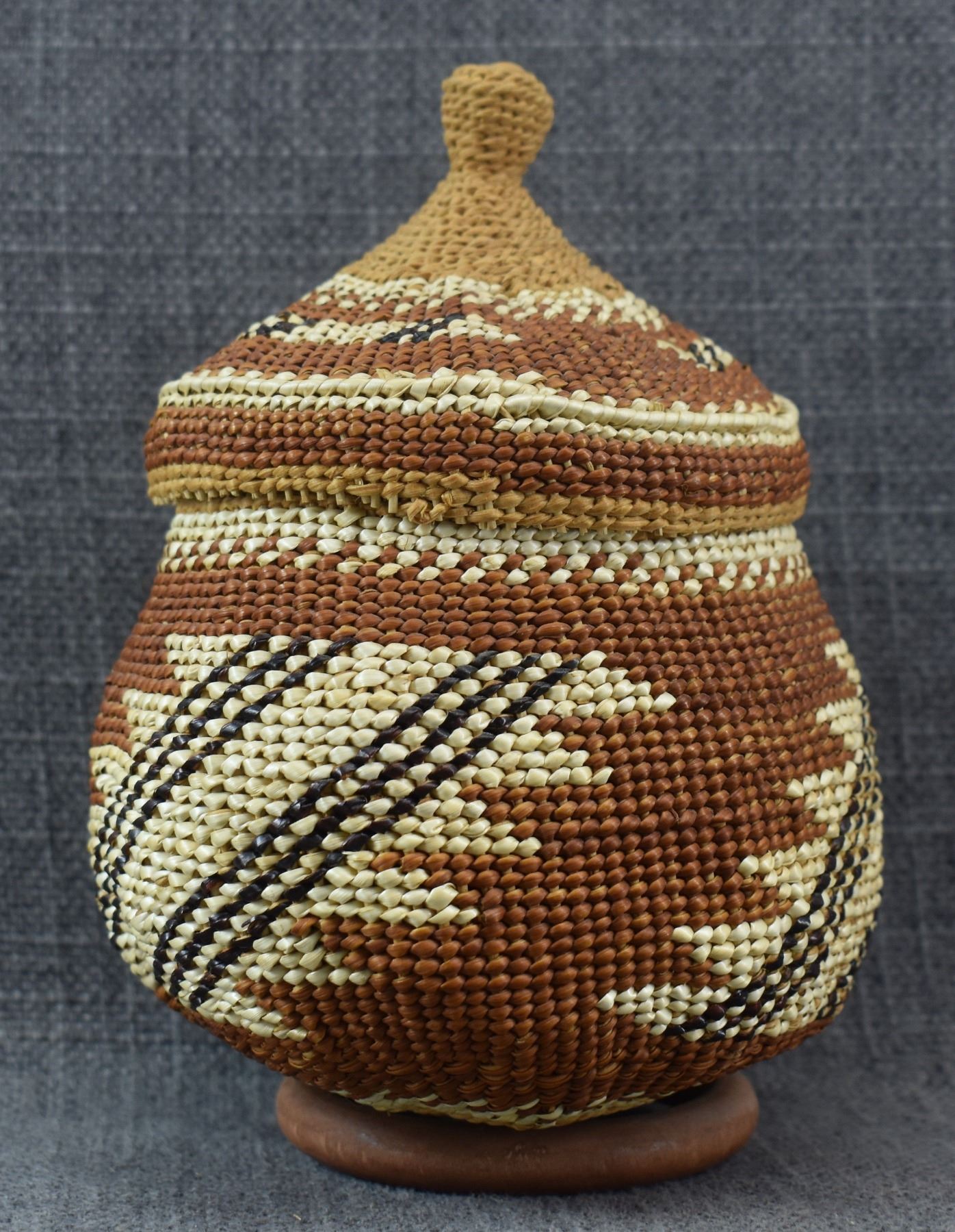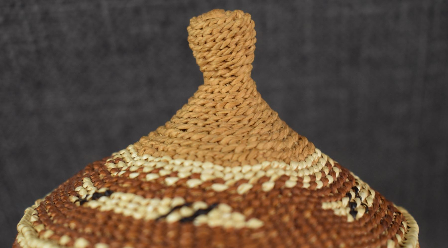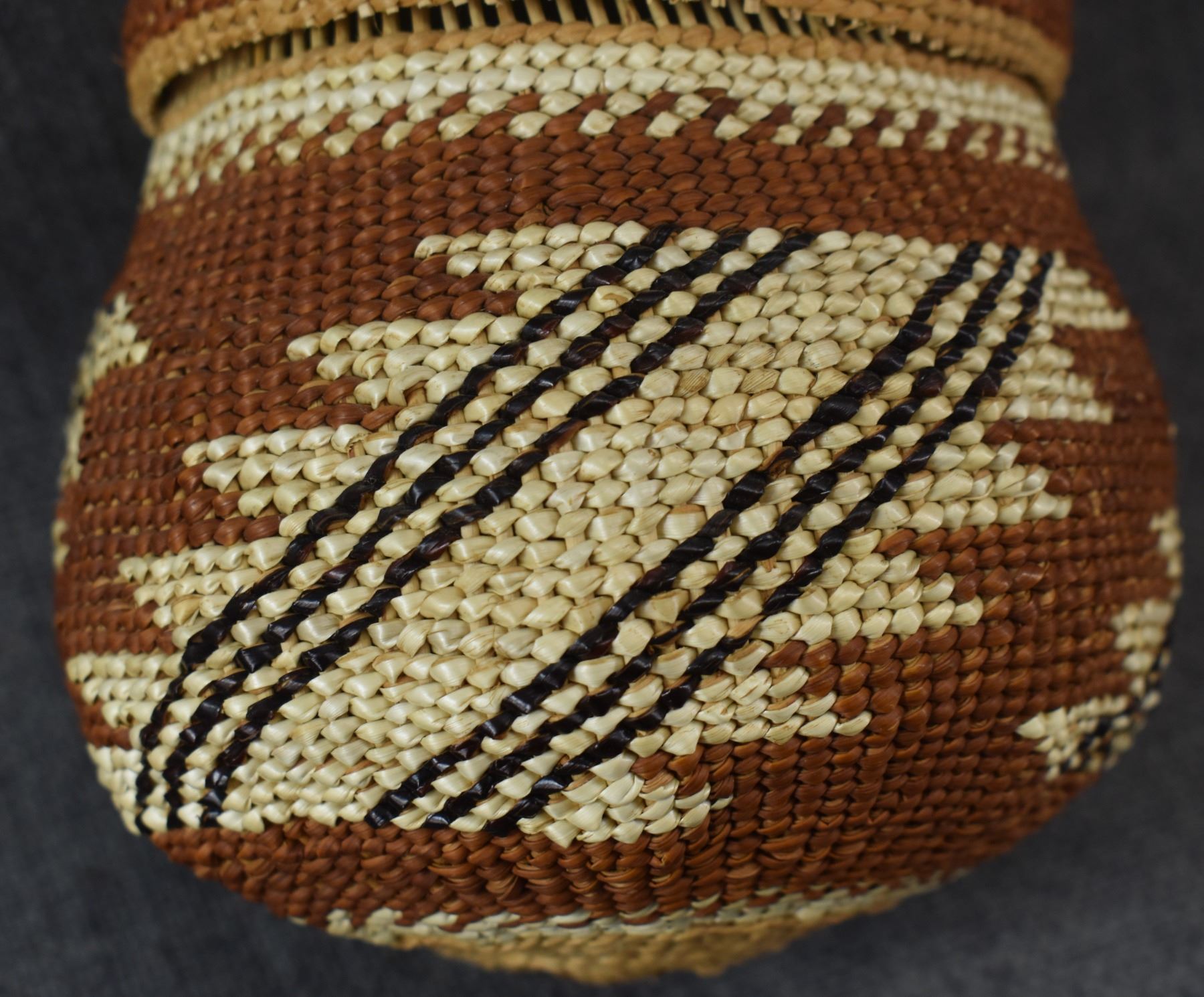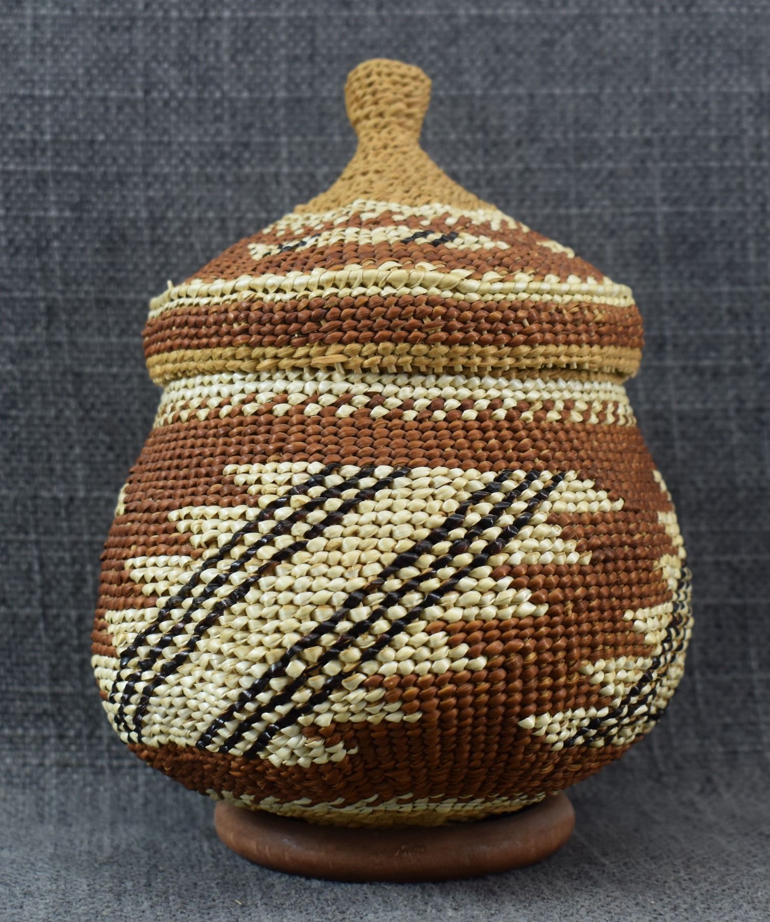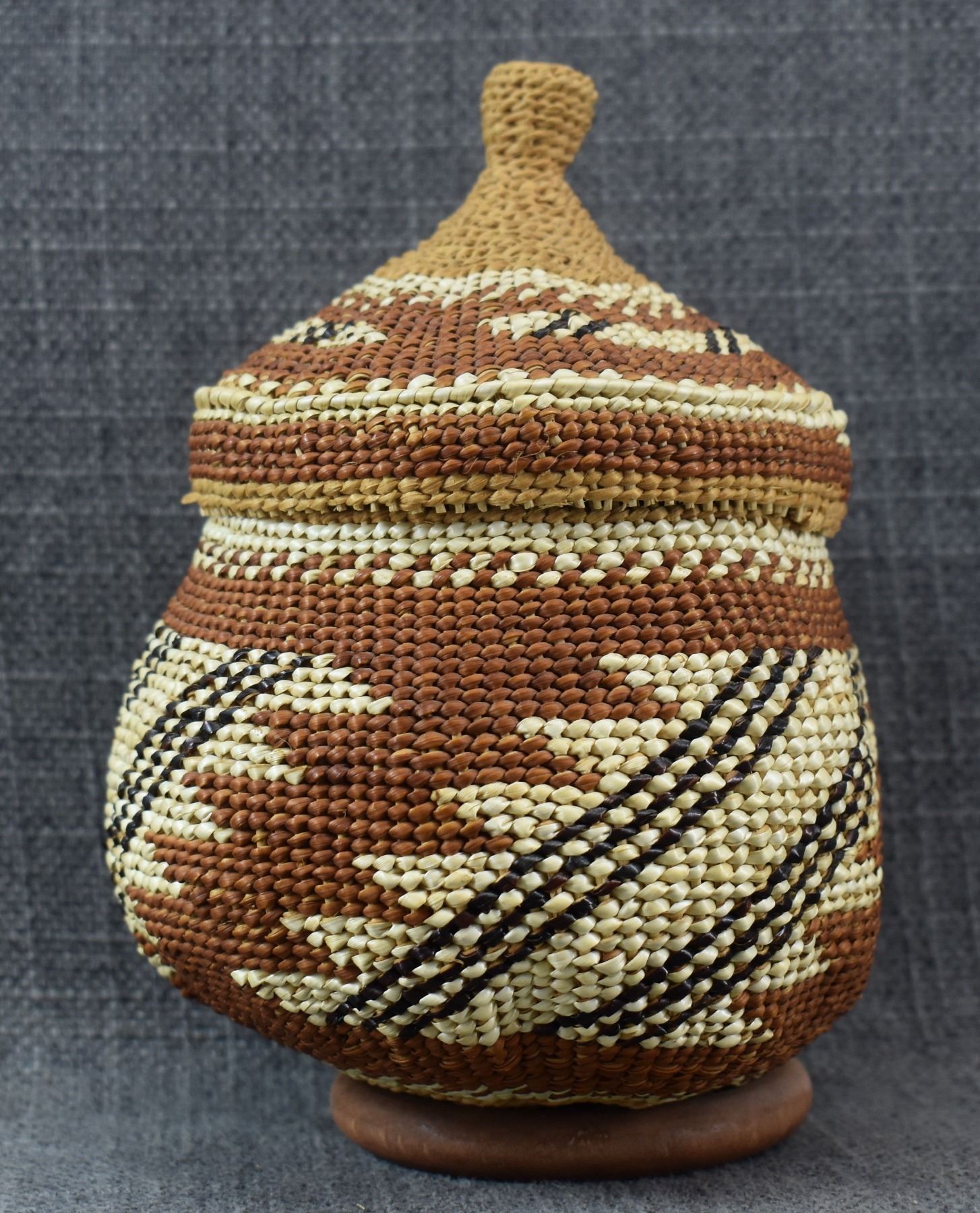 20th century Hupa/Karuk. Hand woven geometric design lidded basket.no splits or breaks. 6.5'' x 5''