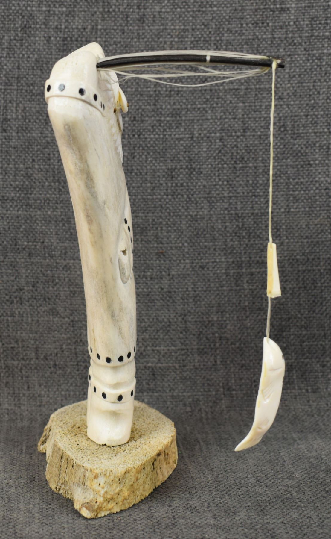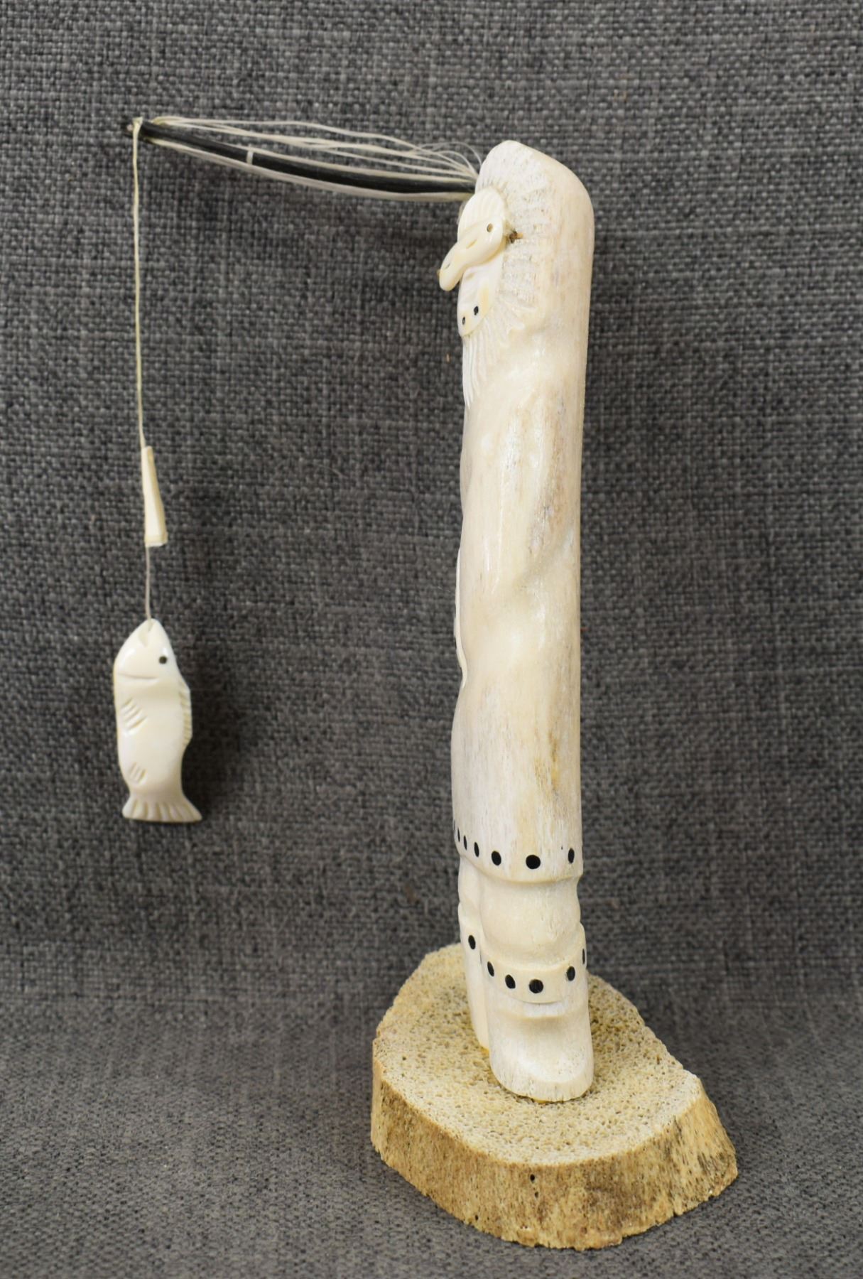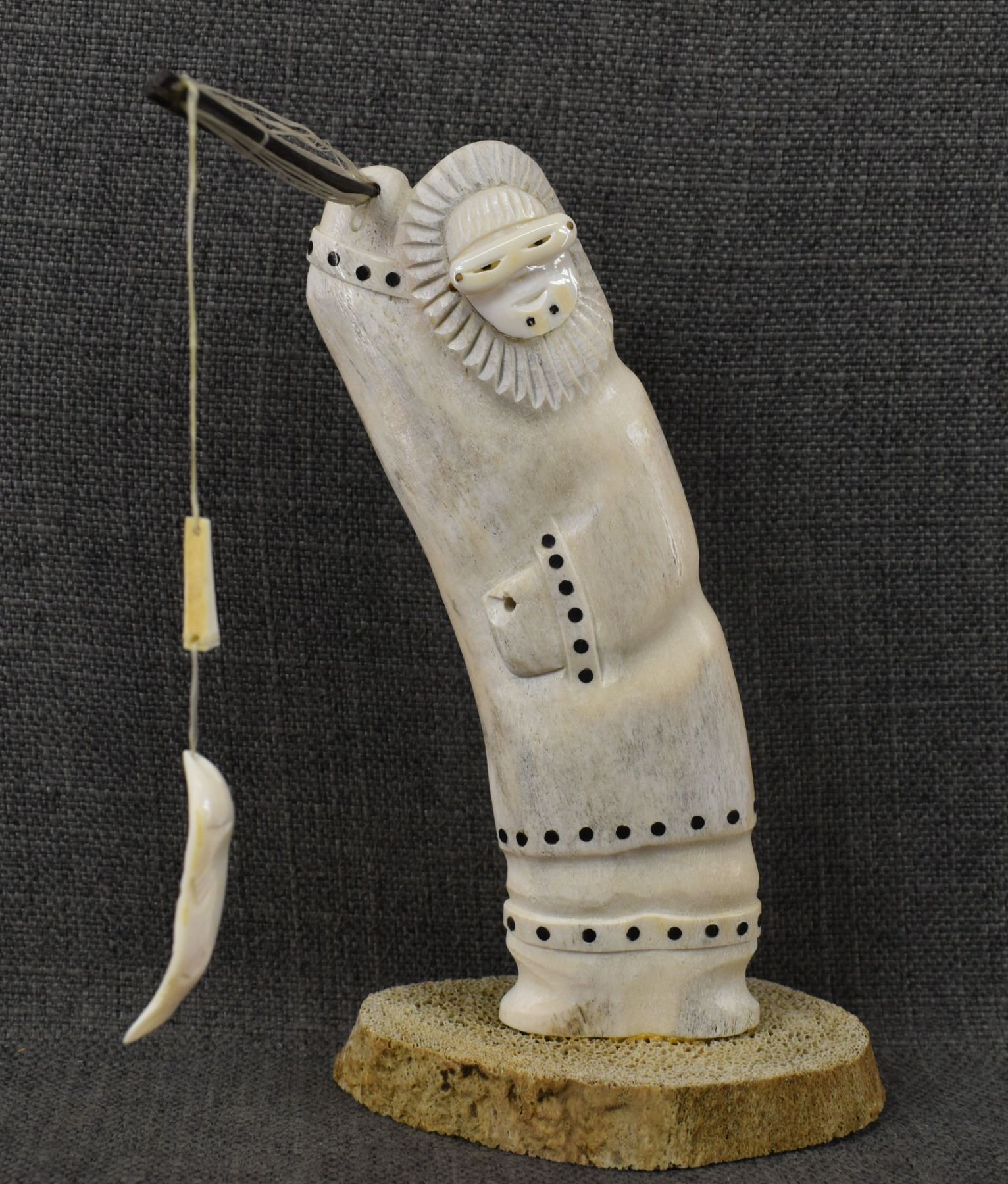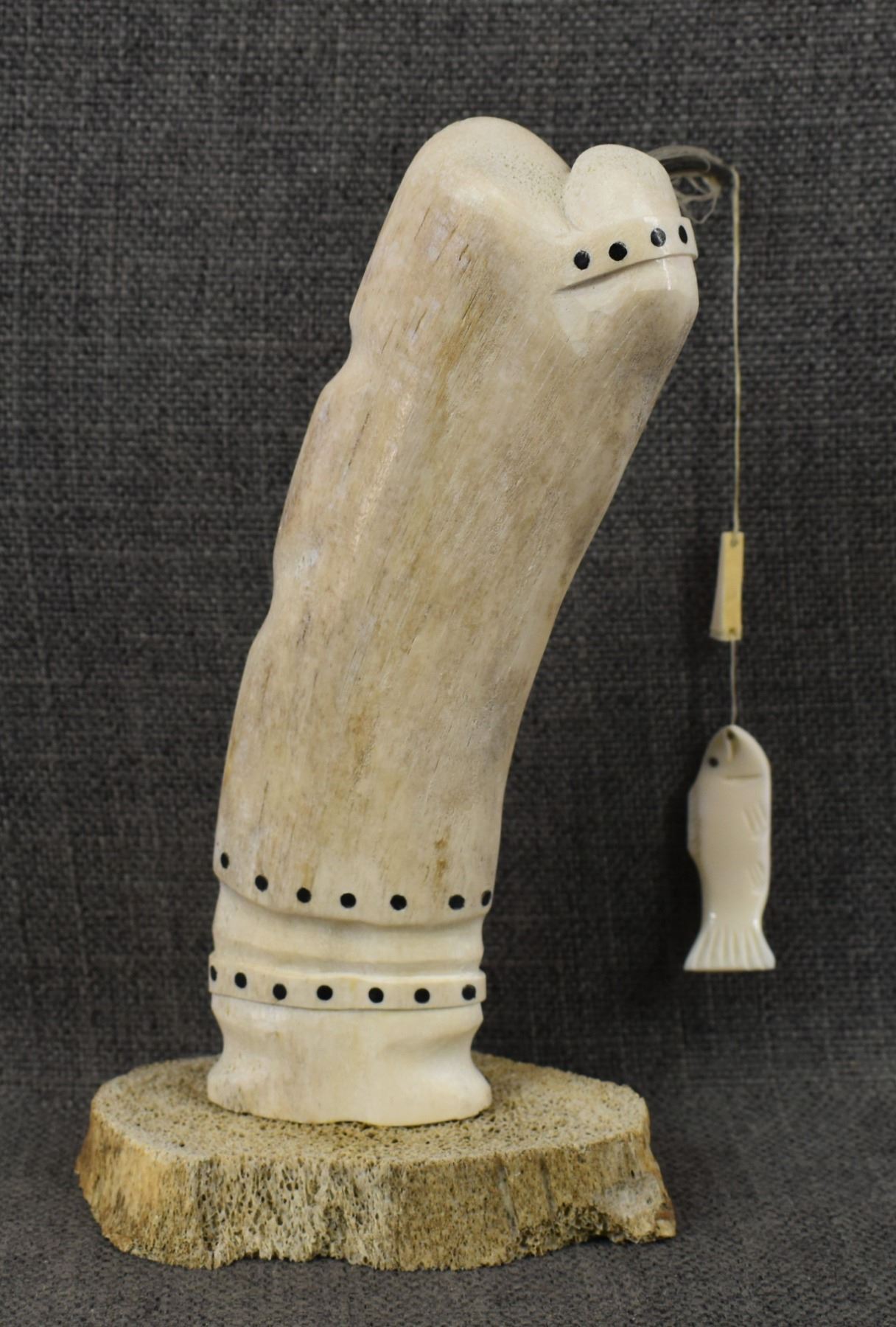 1980's Inuit, carved bone figure with fish signed EIW, 8.5" x 5" x 2.5"