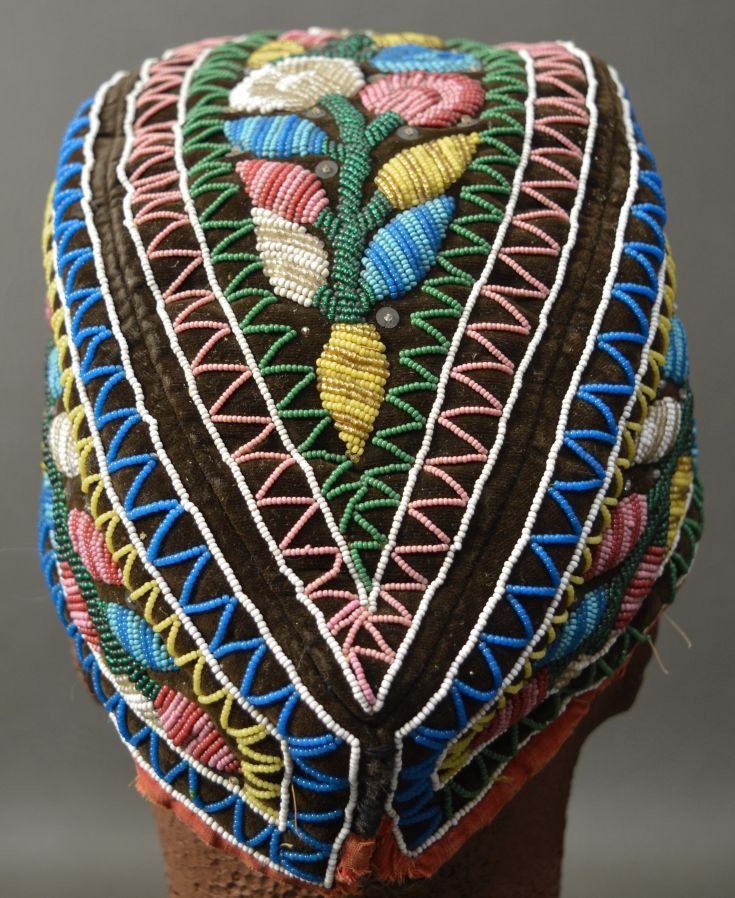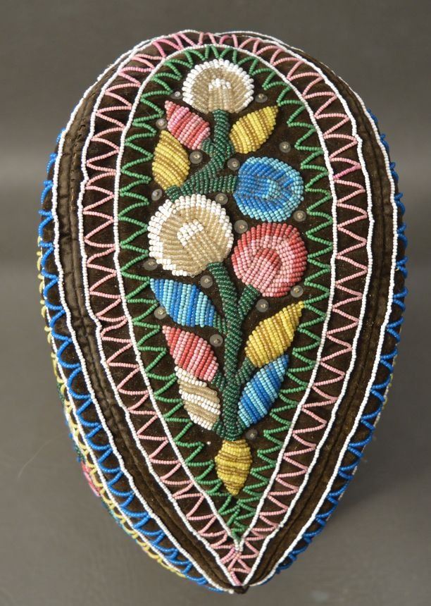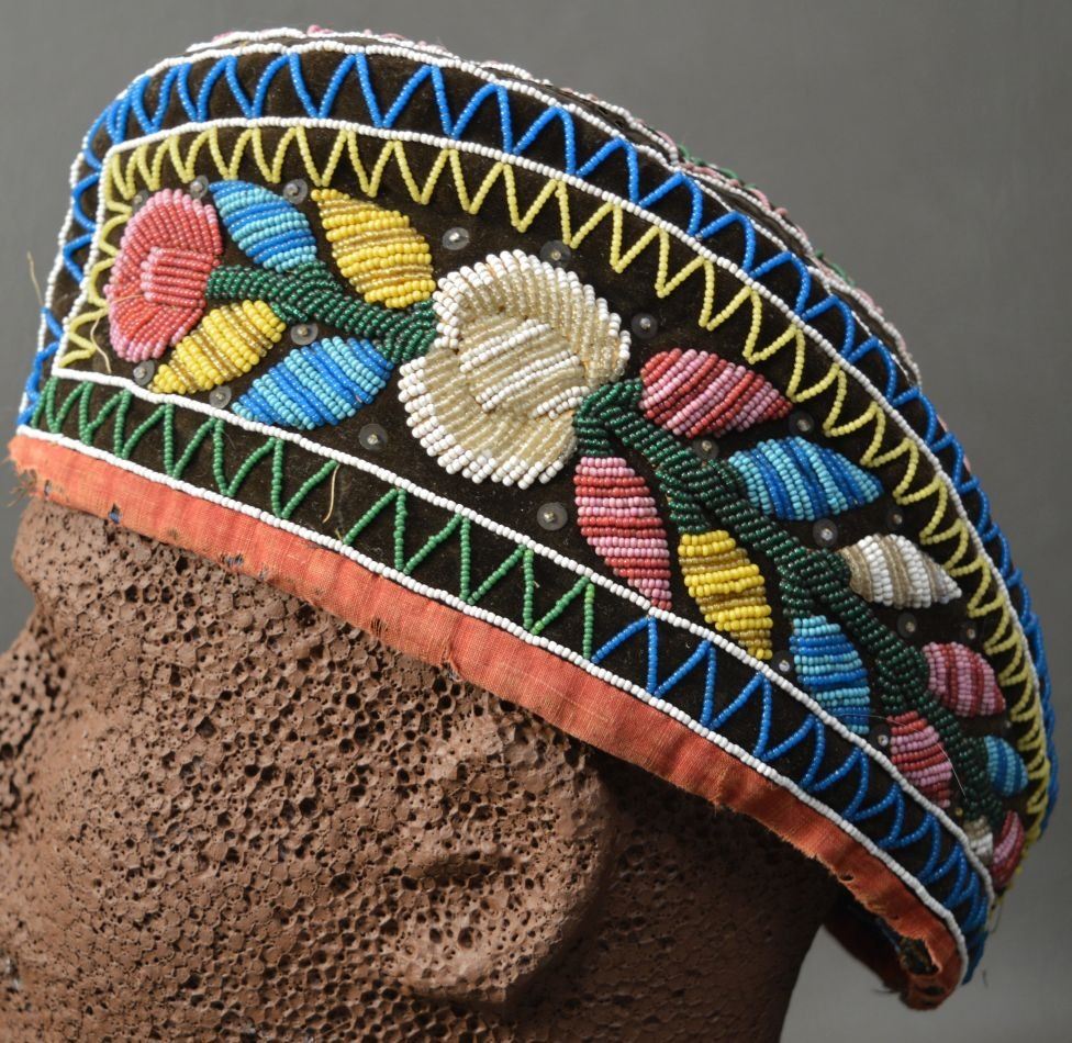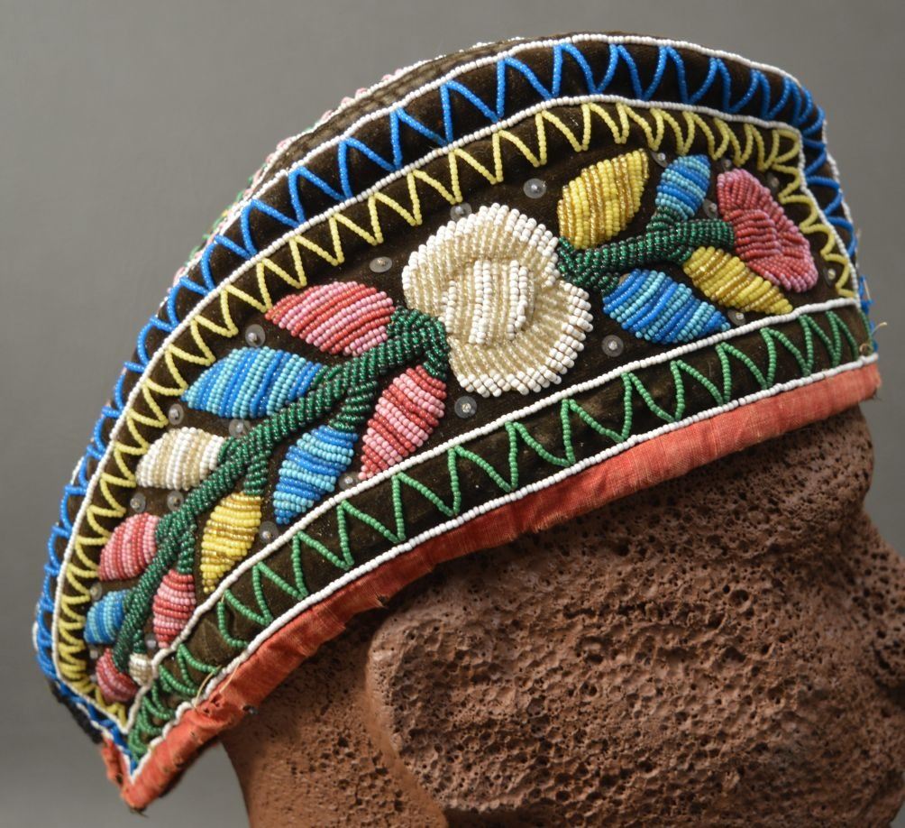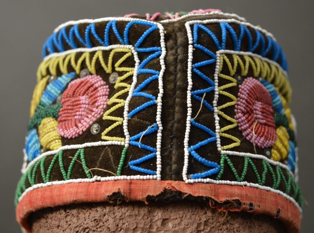 19th century. Iroquois Indian. Hand beaded floral design on cloth hat 12'' x 4'' x 5''