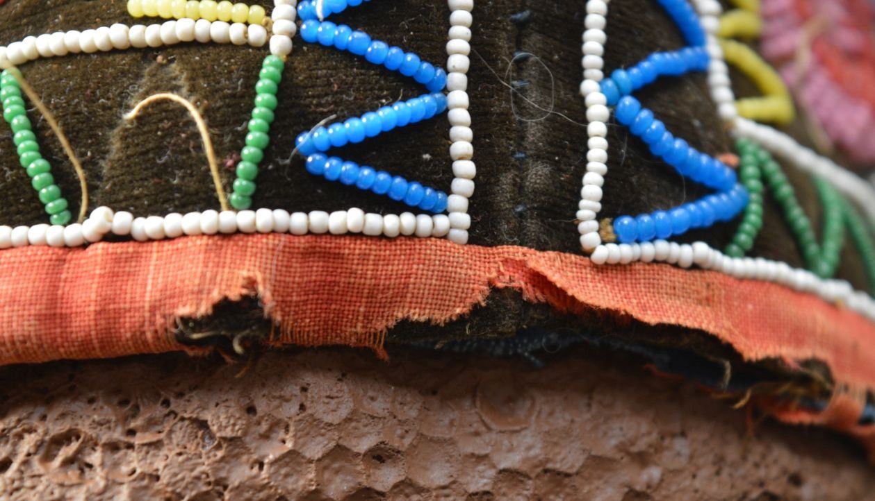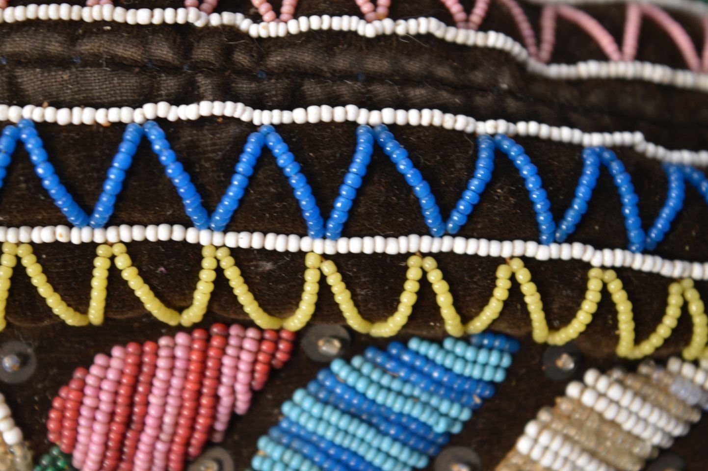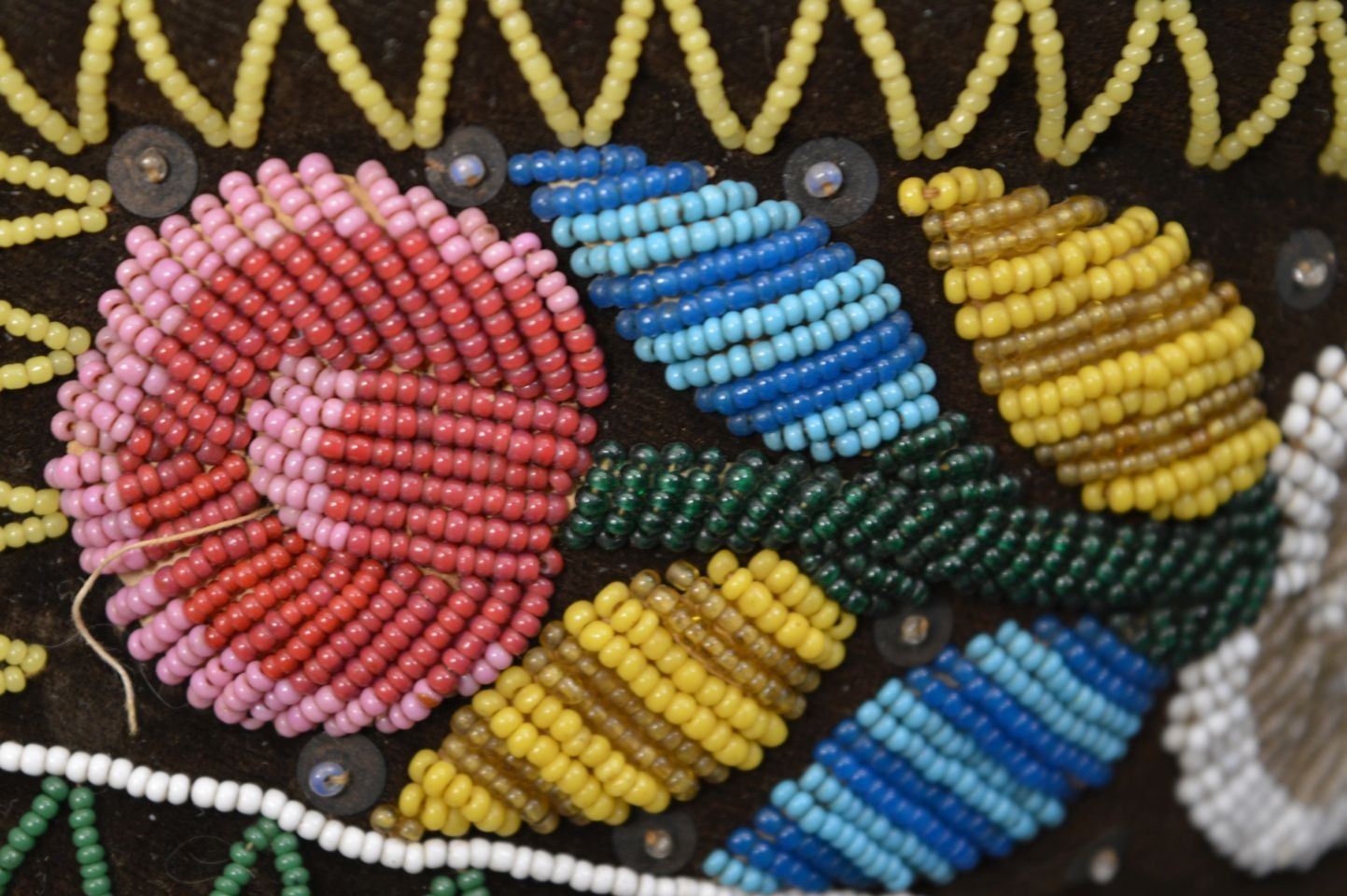 19th century. Iroquois Indian. Hand beaded floral design on cloth hat 12'' x 4'' x 5''