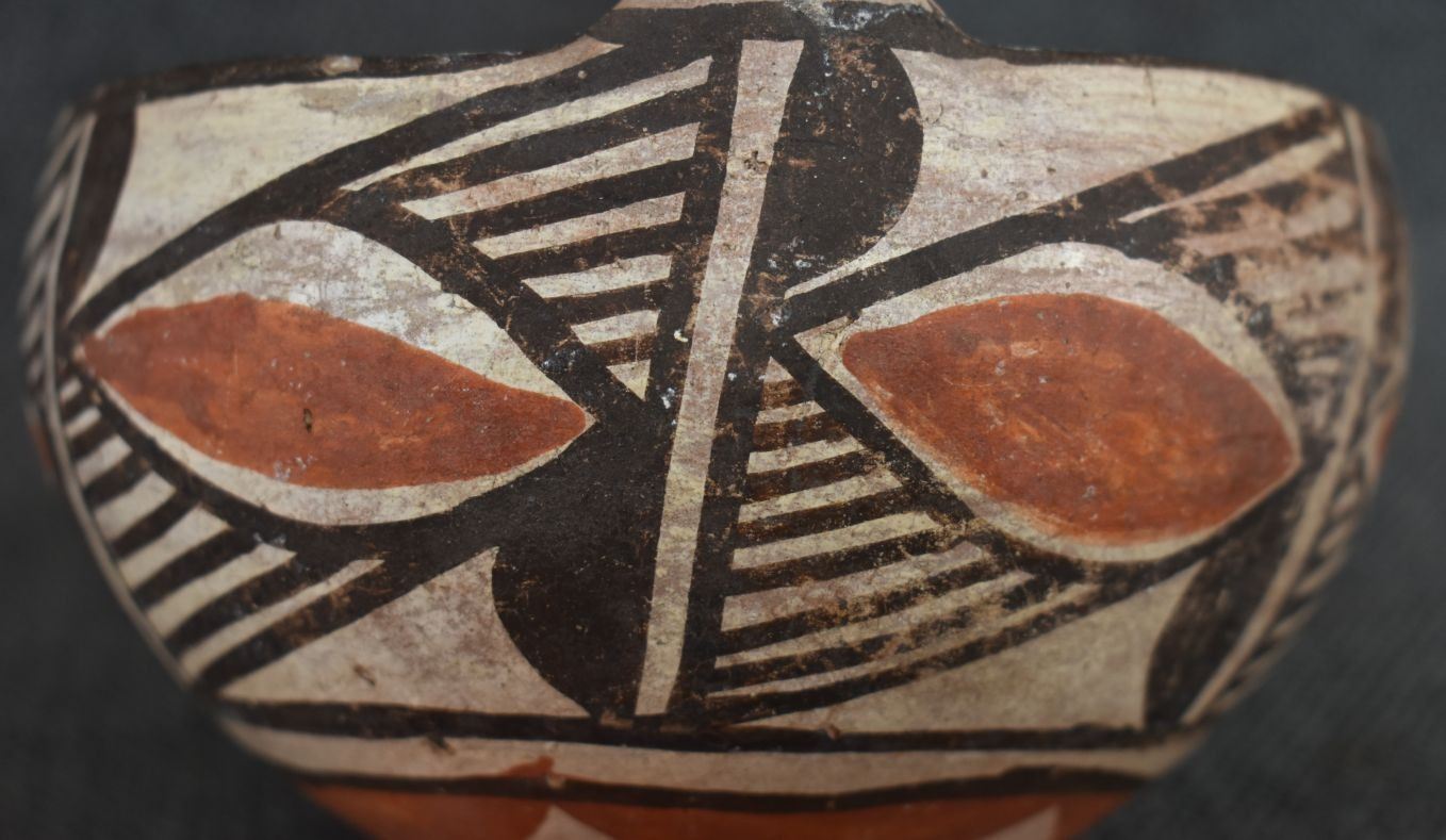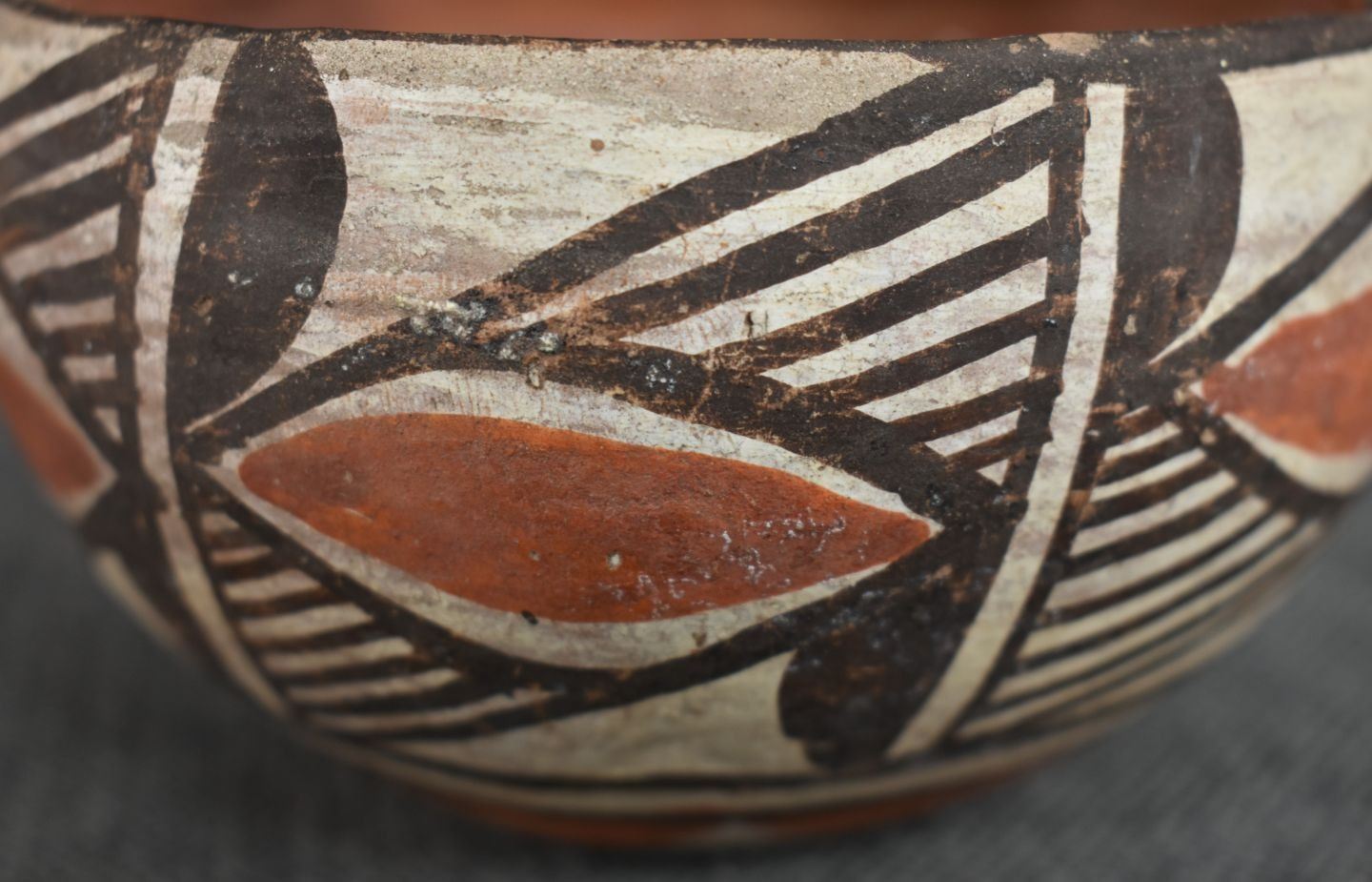 1940's Isleta. Hand coiled and painted polychrome design, pottery basket. 6'' x 6''