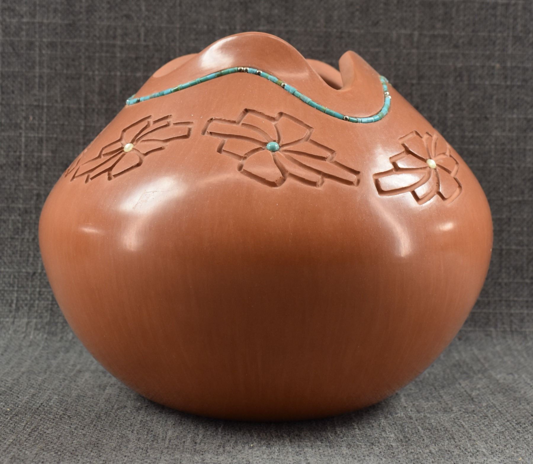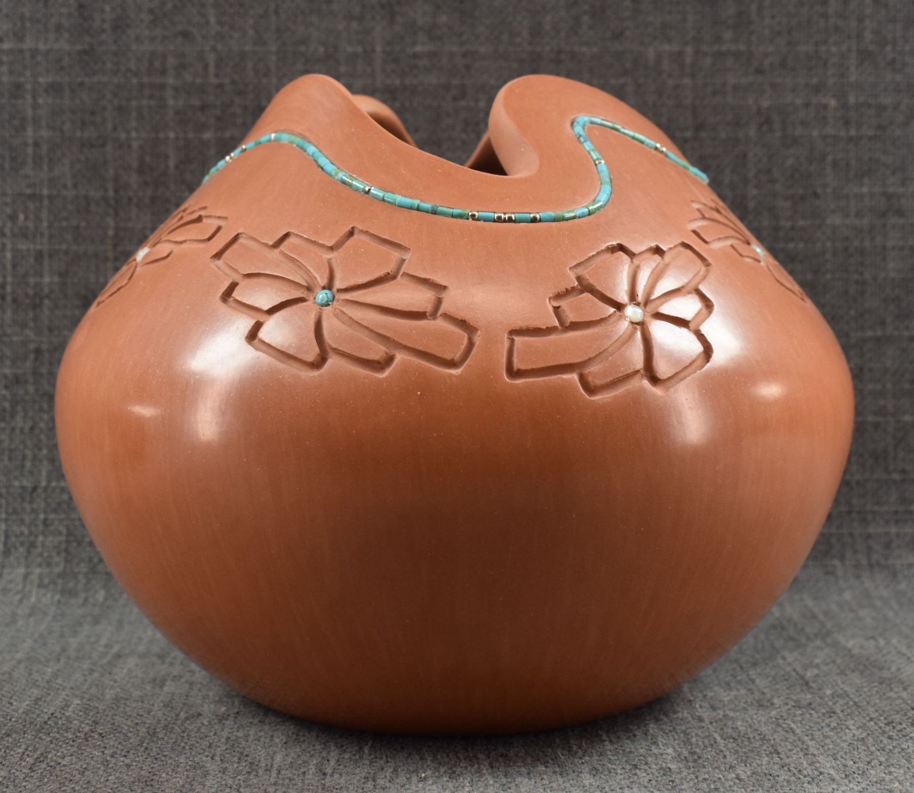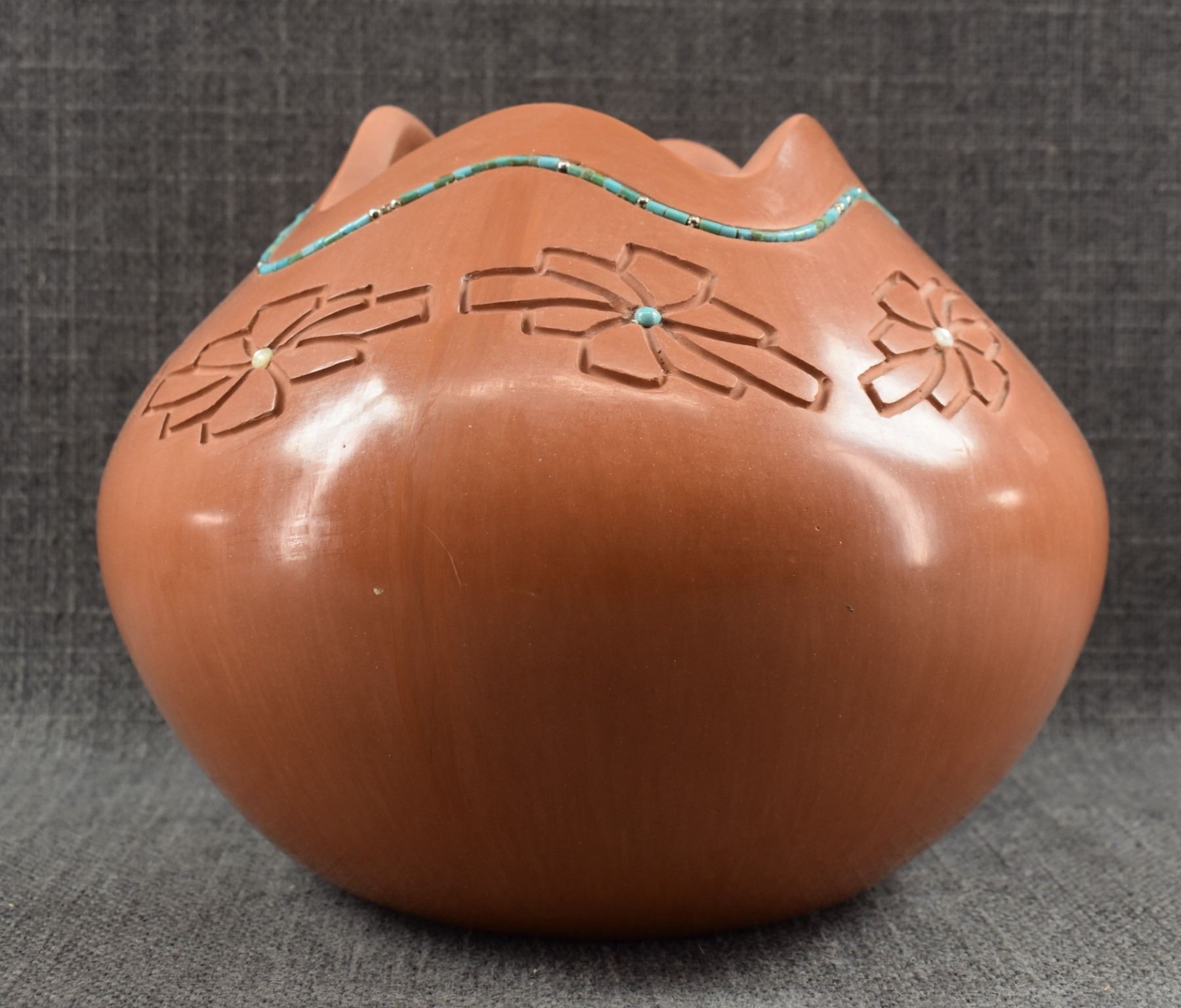 1990-2000's Isleta, hand coiled with carved floral design with inlaid turquoise by Carol L Caprio 6" x 8" has restoration